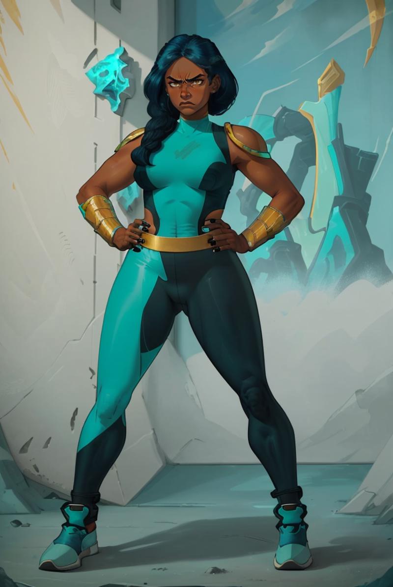 For her clothes: <lora:mermistav118:0.7>(mermista, single braid, dark-skinned female, paldrons, bracer, armor, pants)