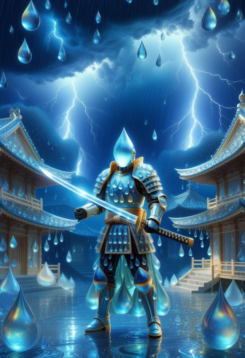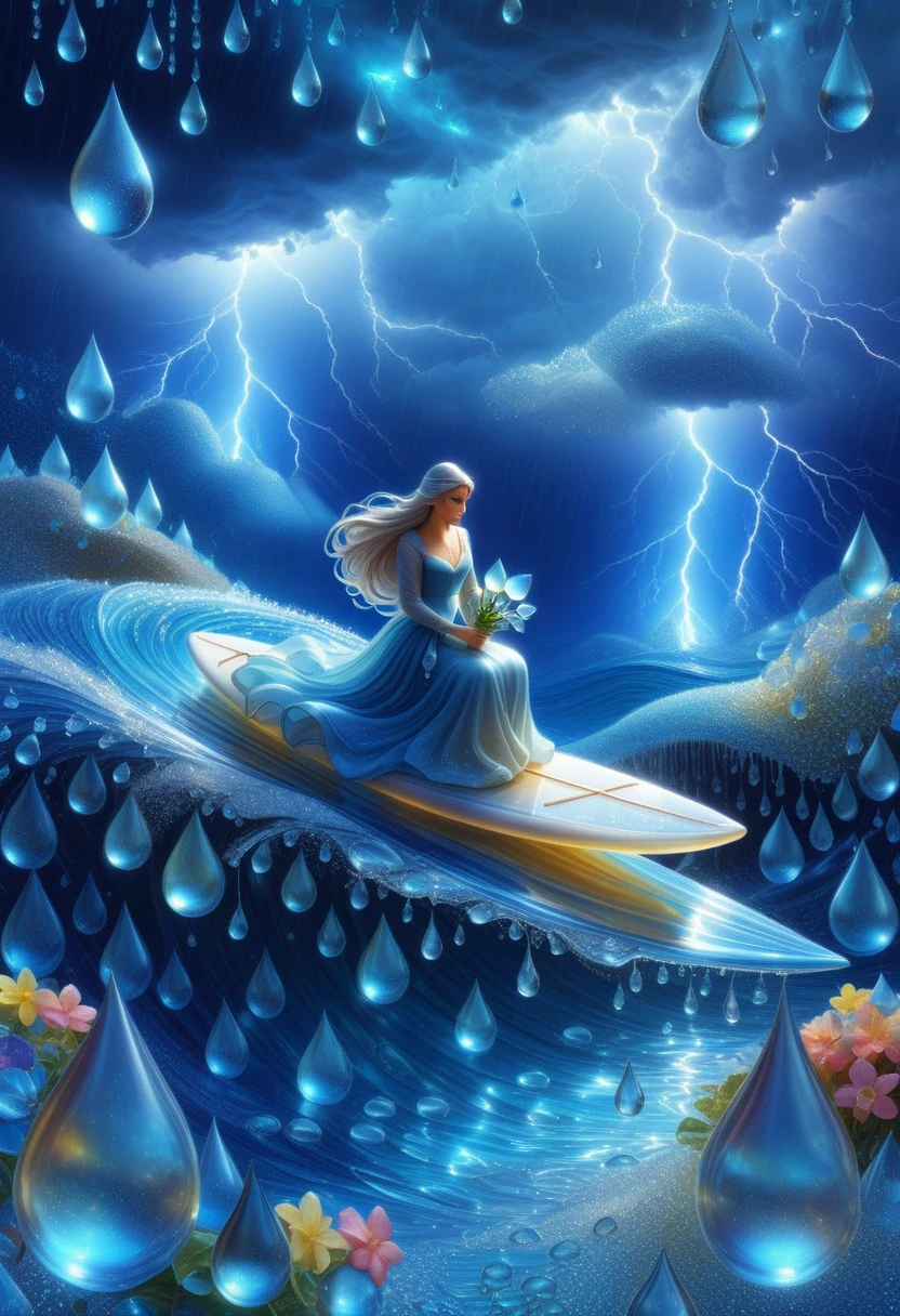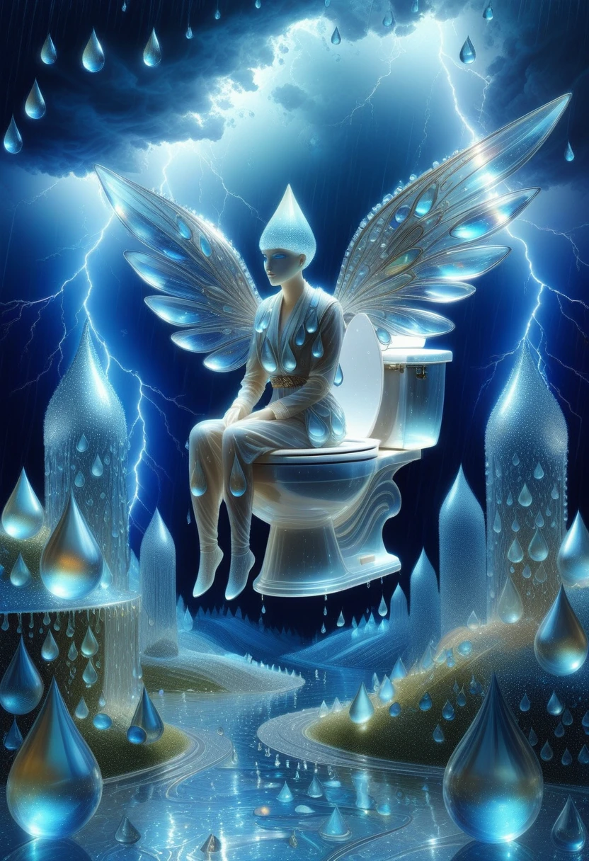 teardrop-shaped objects, elongated pear forms, translucent watery surfaces, dripping fluid edges, blue-cyan color palette, glassy reflective textures, cascading droplet landscapes, melancholic glossy sheen