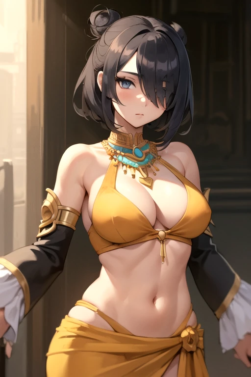 DalilaLuxor, 1girl, solo, short hair, skirt, large breasts, black hair, navel, cleavage, bare shoulders, jewelry, detached sleeves, midriff, necklace, single hair bun, hair over one eye, dark-skinned female, cleavage cutout, yellow sarong
