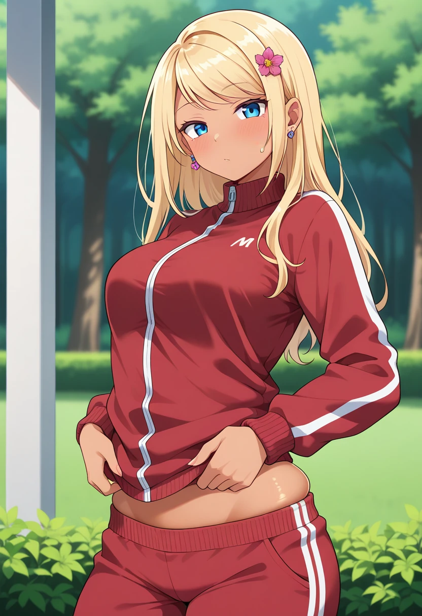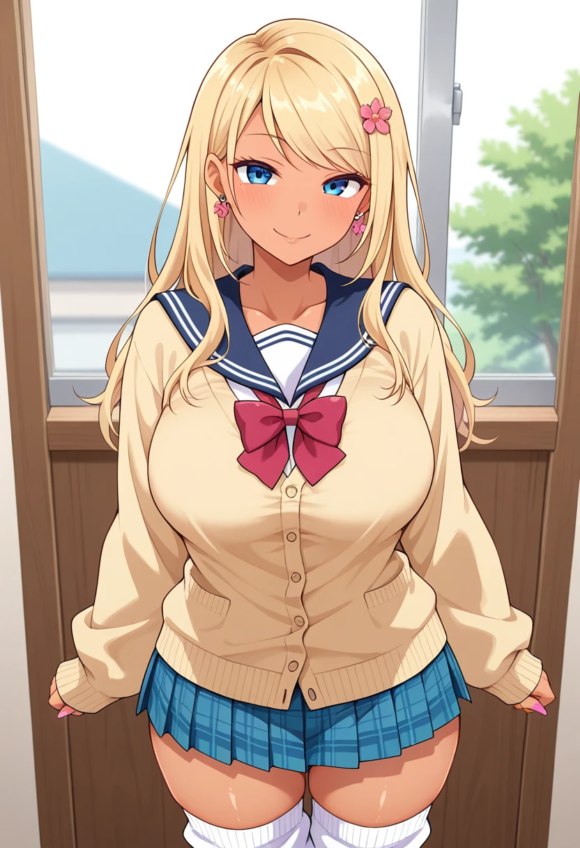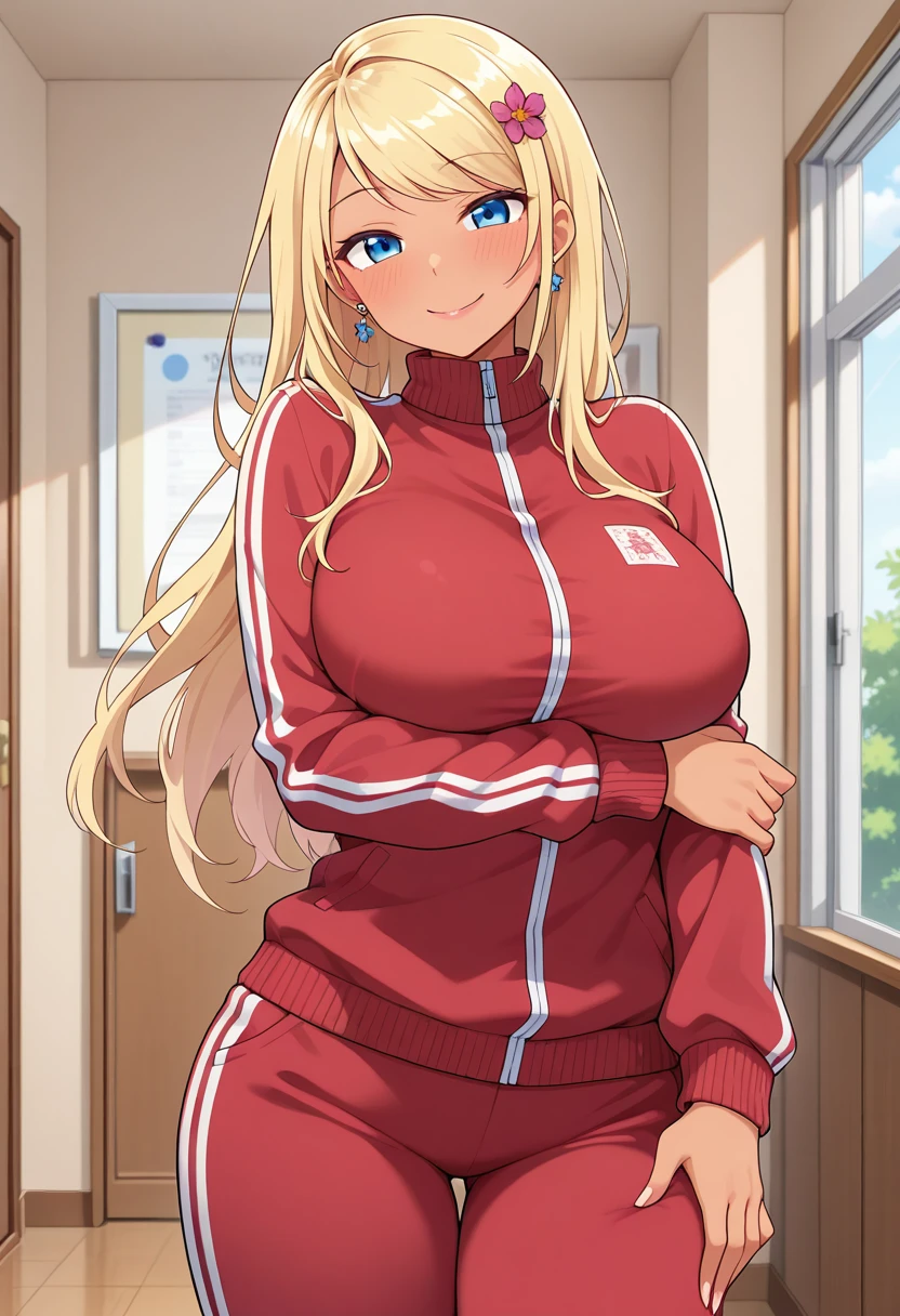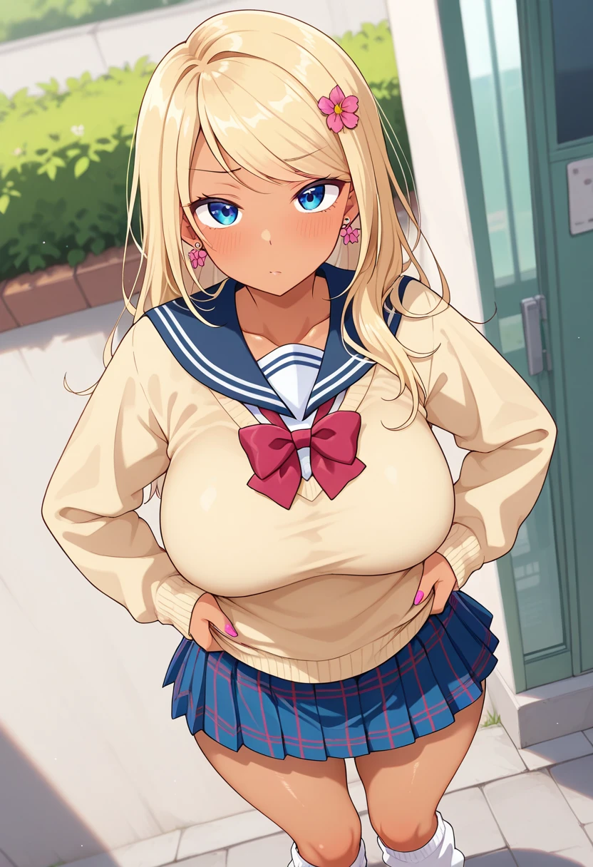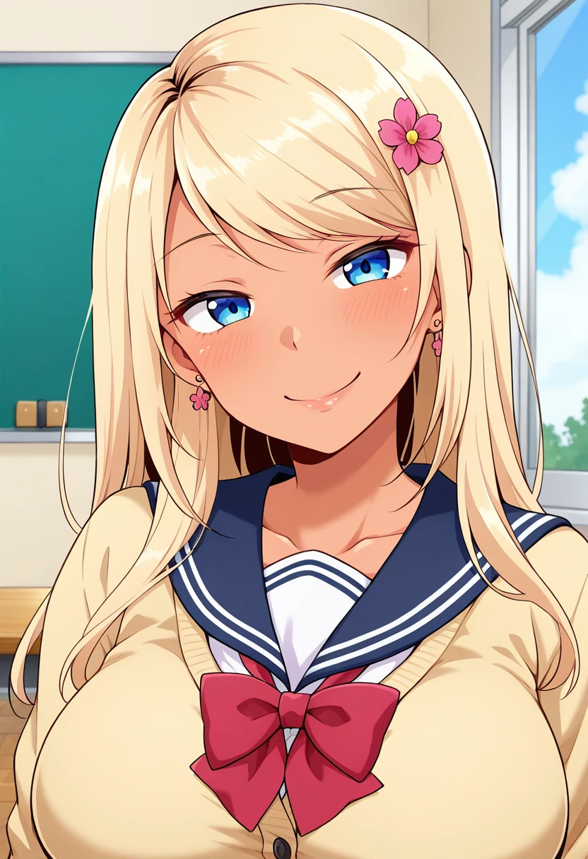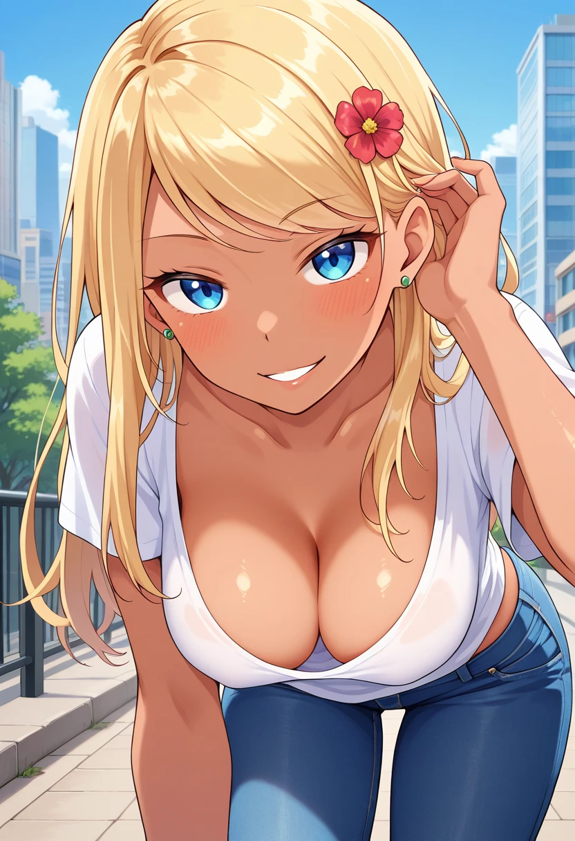 yoshizawaww, gyaru, mature female, dark-skinned female, tan, blue eyes, blonde hair, long hair, swept bangs, hair flower, earrings, large breasts,