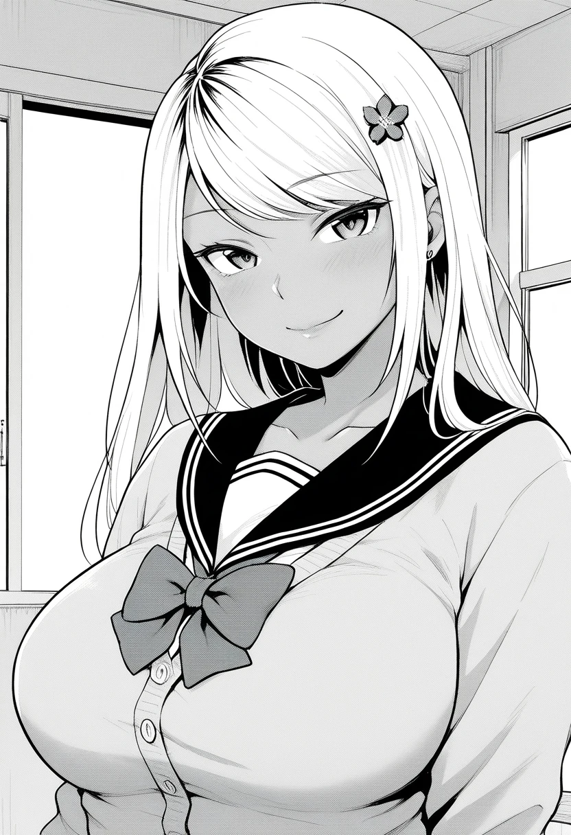 • yoshizawaww, gyaru, mature female, dark-skinned female, tan, blue eyes, blonde hair, long hair, swept bangs, hair flower, earrings, large breasts,