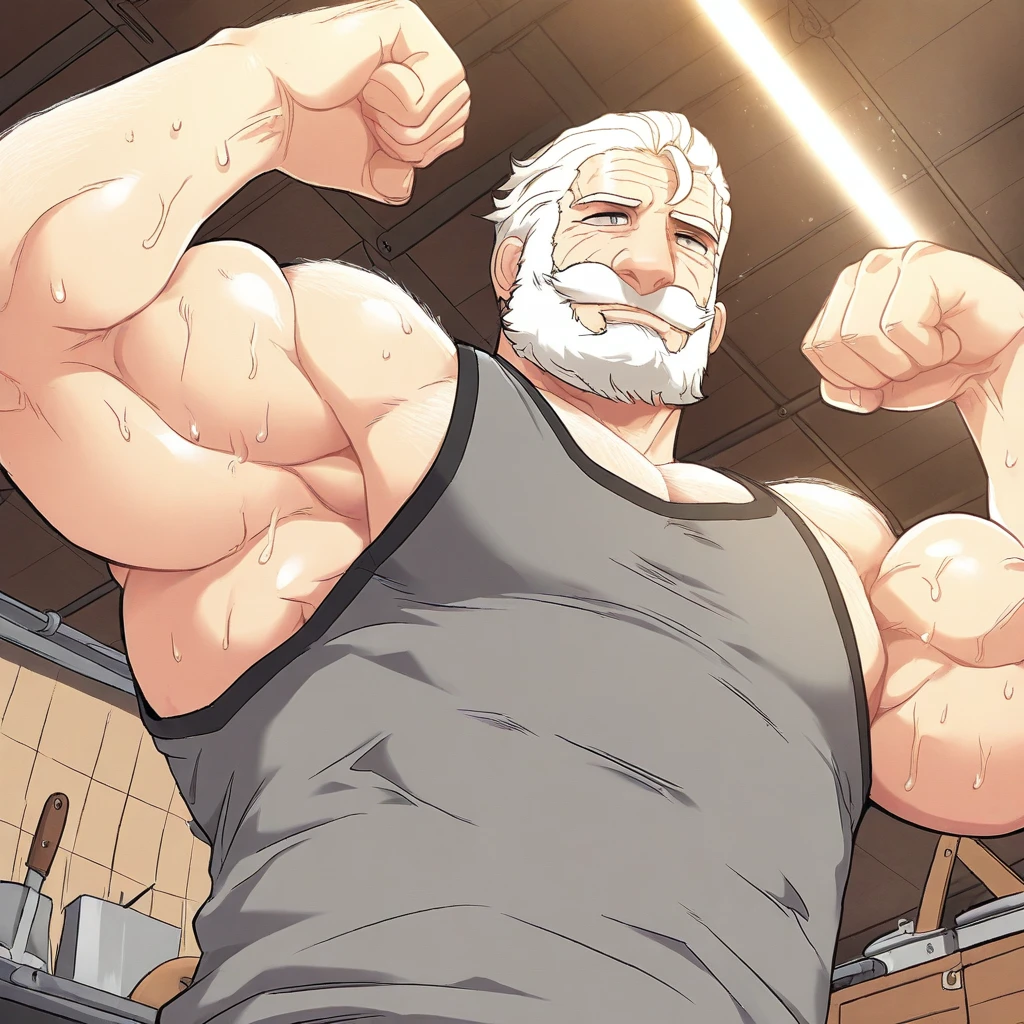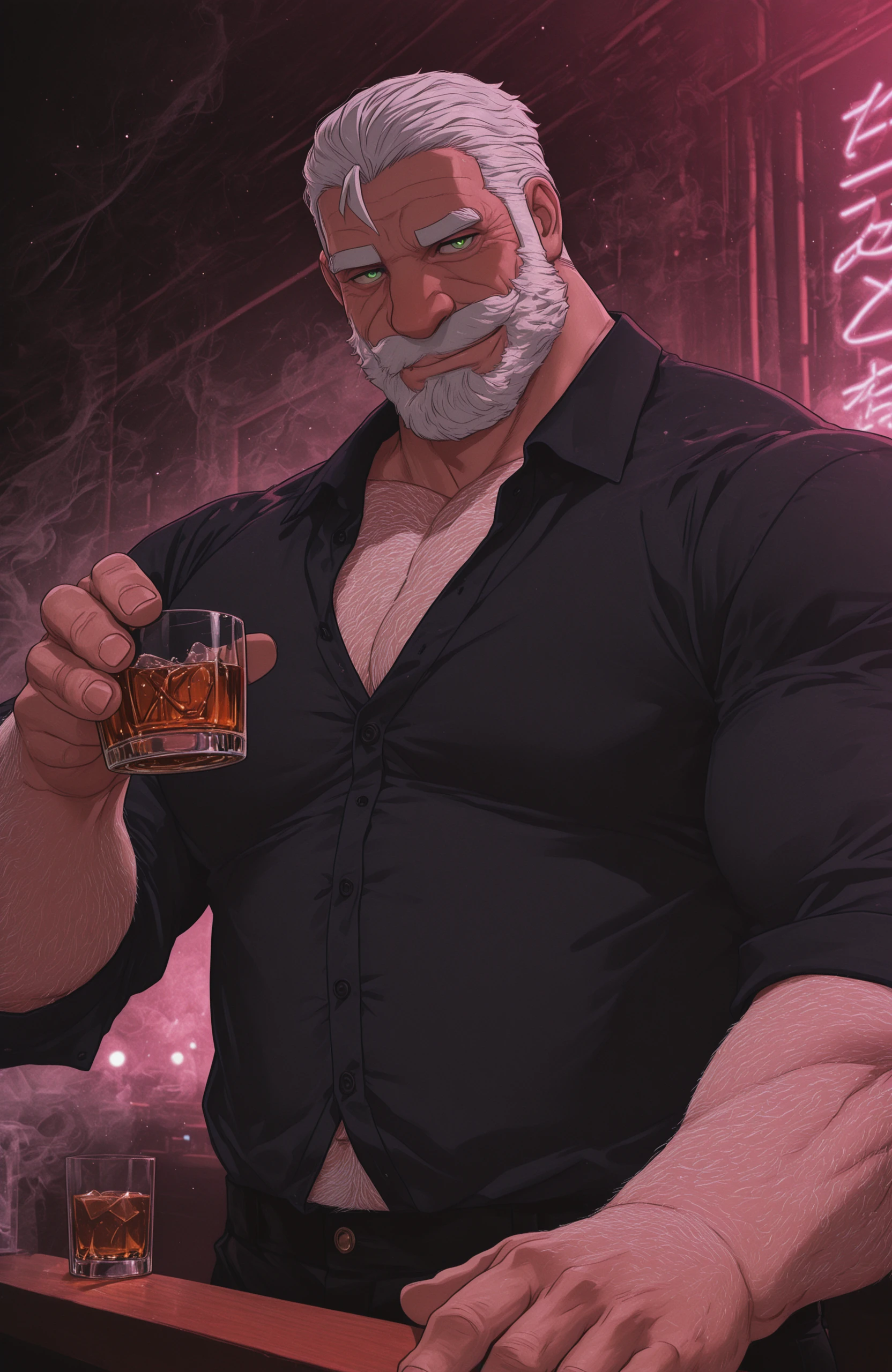 helpful promt: leopold, masterpiece, best quality, mature male, old man, white hair, short hair, thick eyebrows, green eyes, full beard, sideburns, muscular, bara, hairy chest, portrait, upper body, looking at viewer, confident smile, warm golden hour lighting, art studio background with easels, detailed skin texture, soft shadows, illustration, professional photography lighting, shallow depth of field.