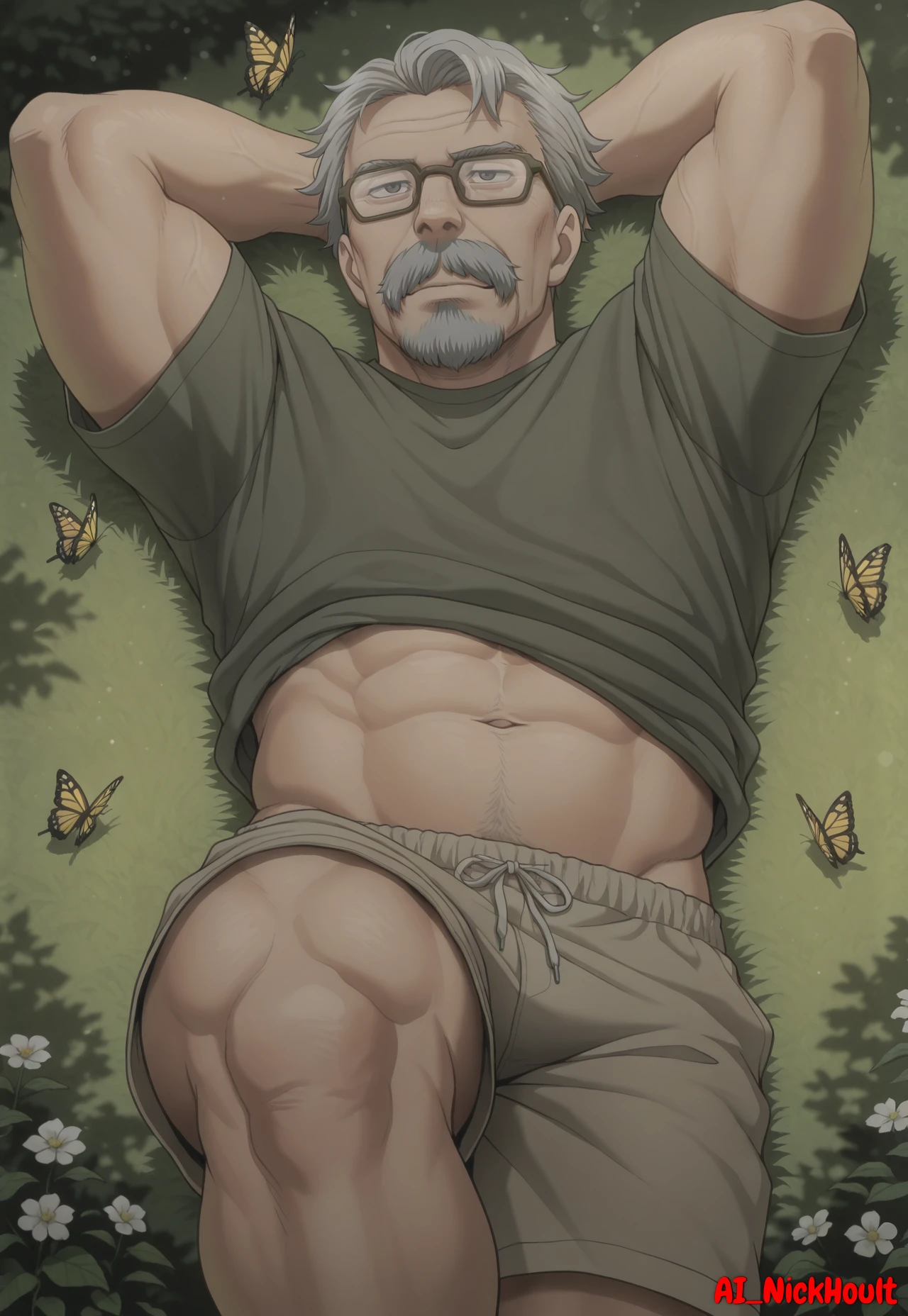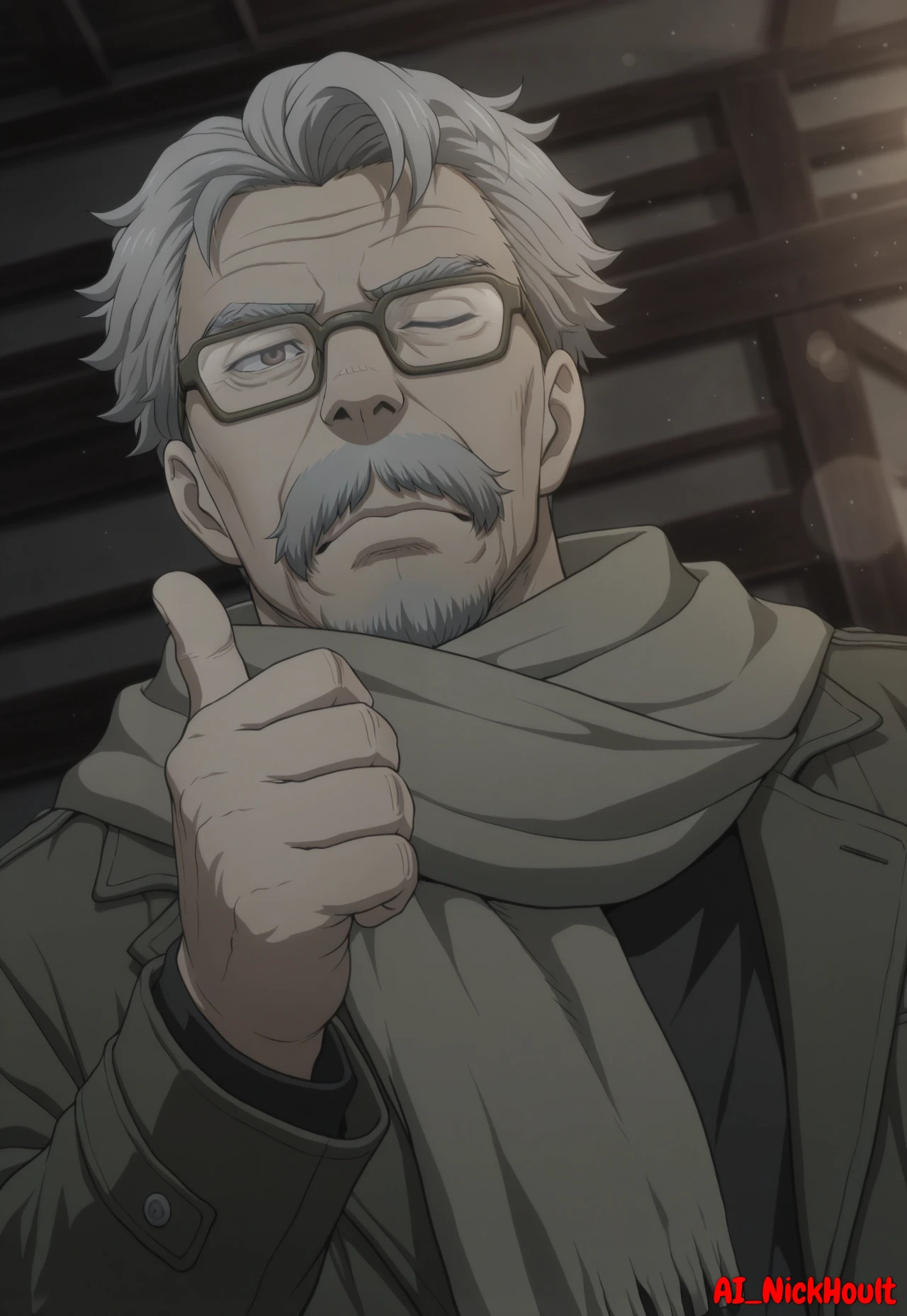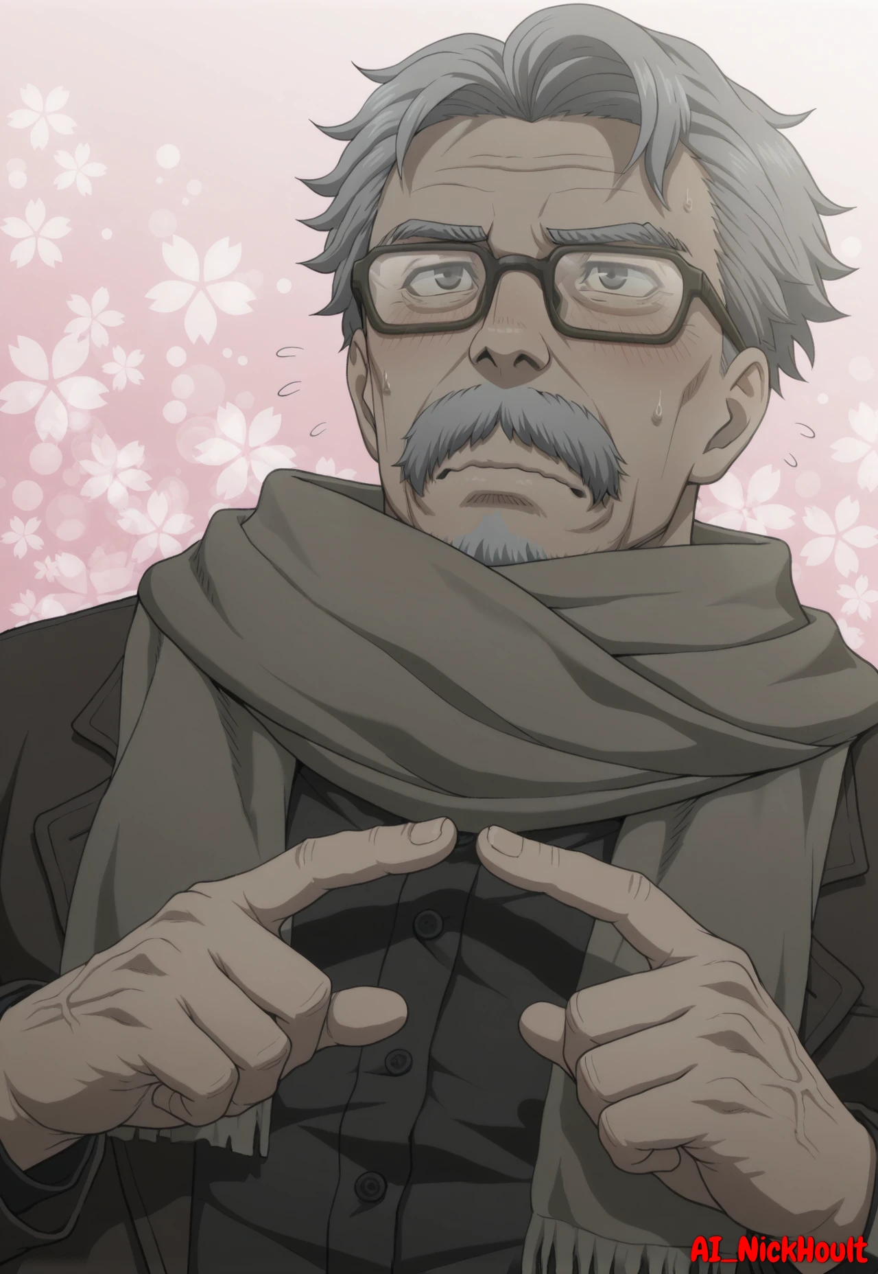 Adams, mature male, old man, gray hair, short hair, mustache, thick eyebrows, wrinkles, dark eyes, rectangular glasses,