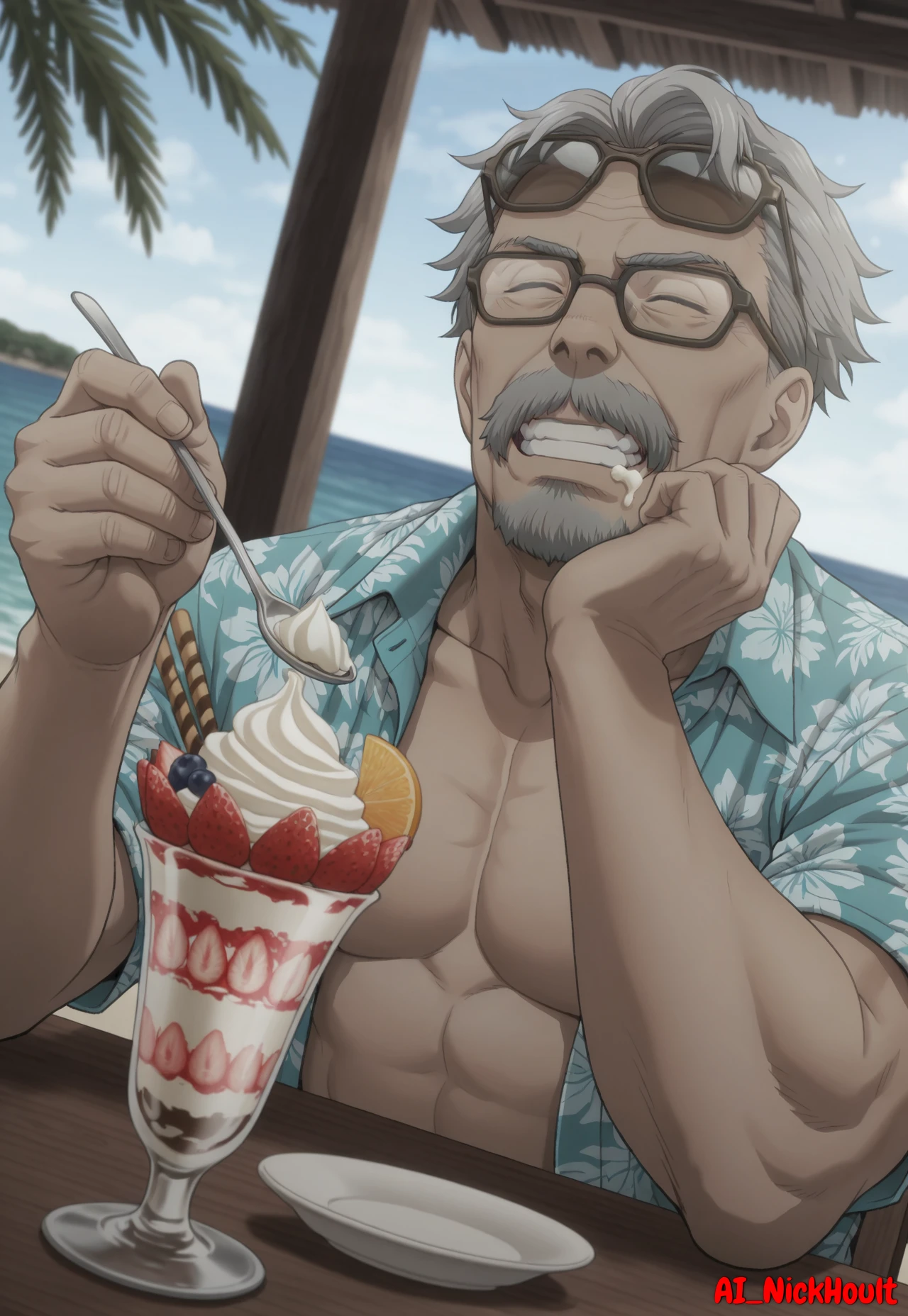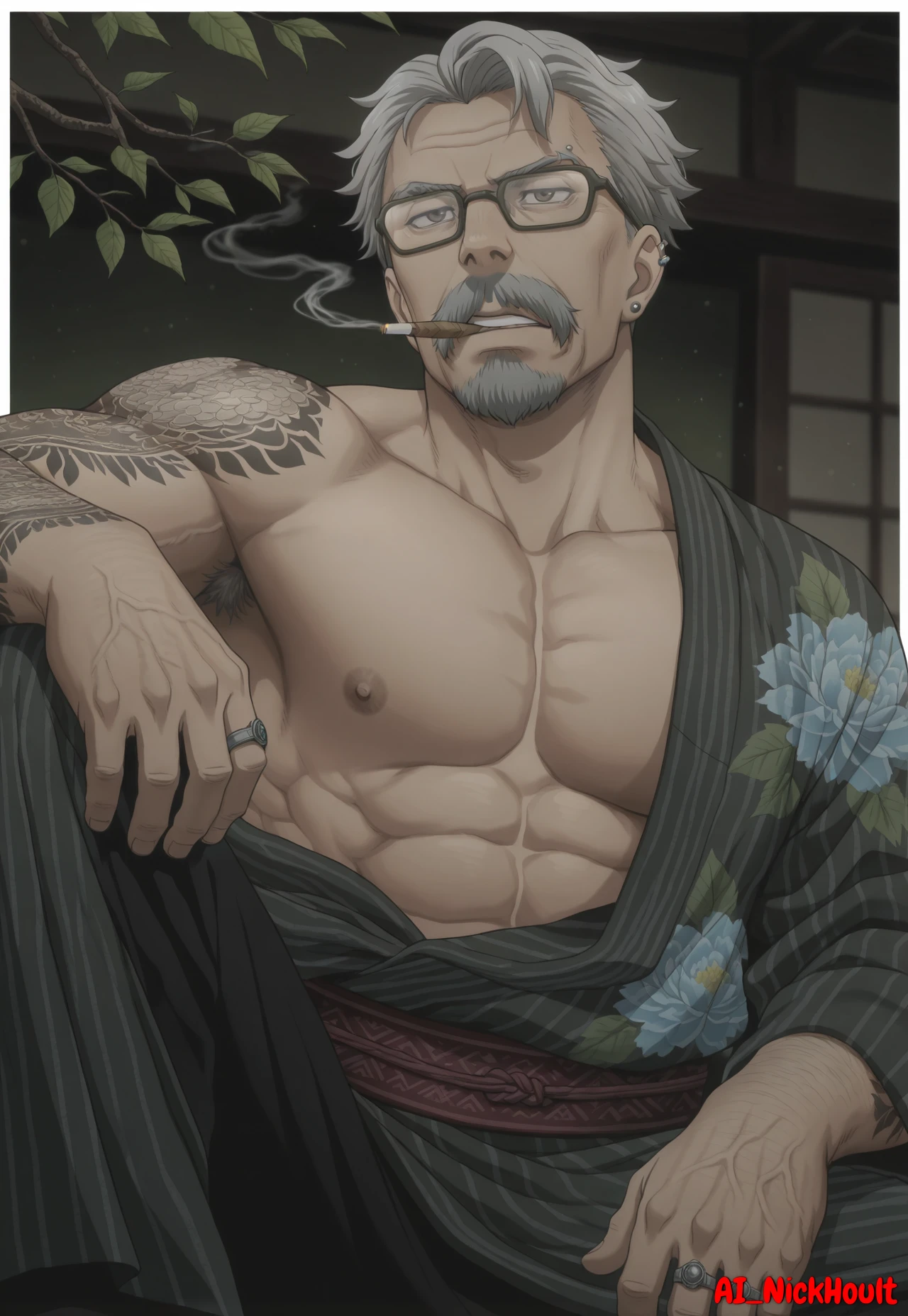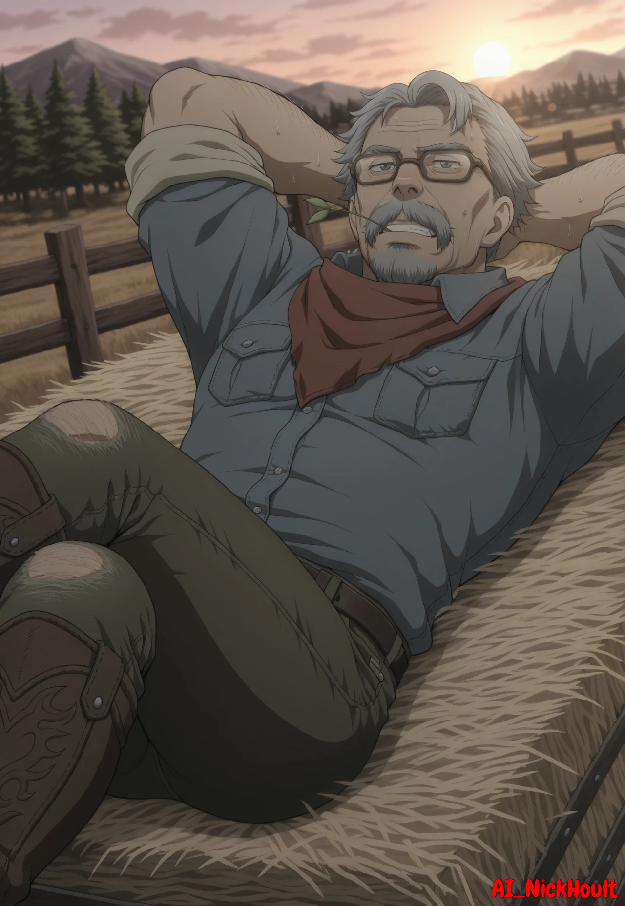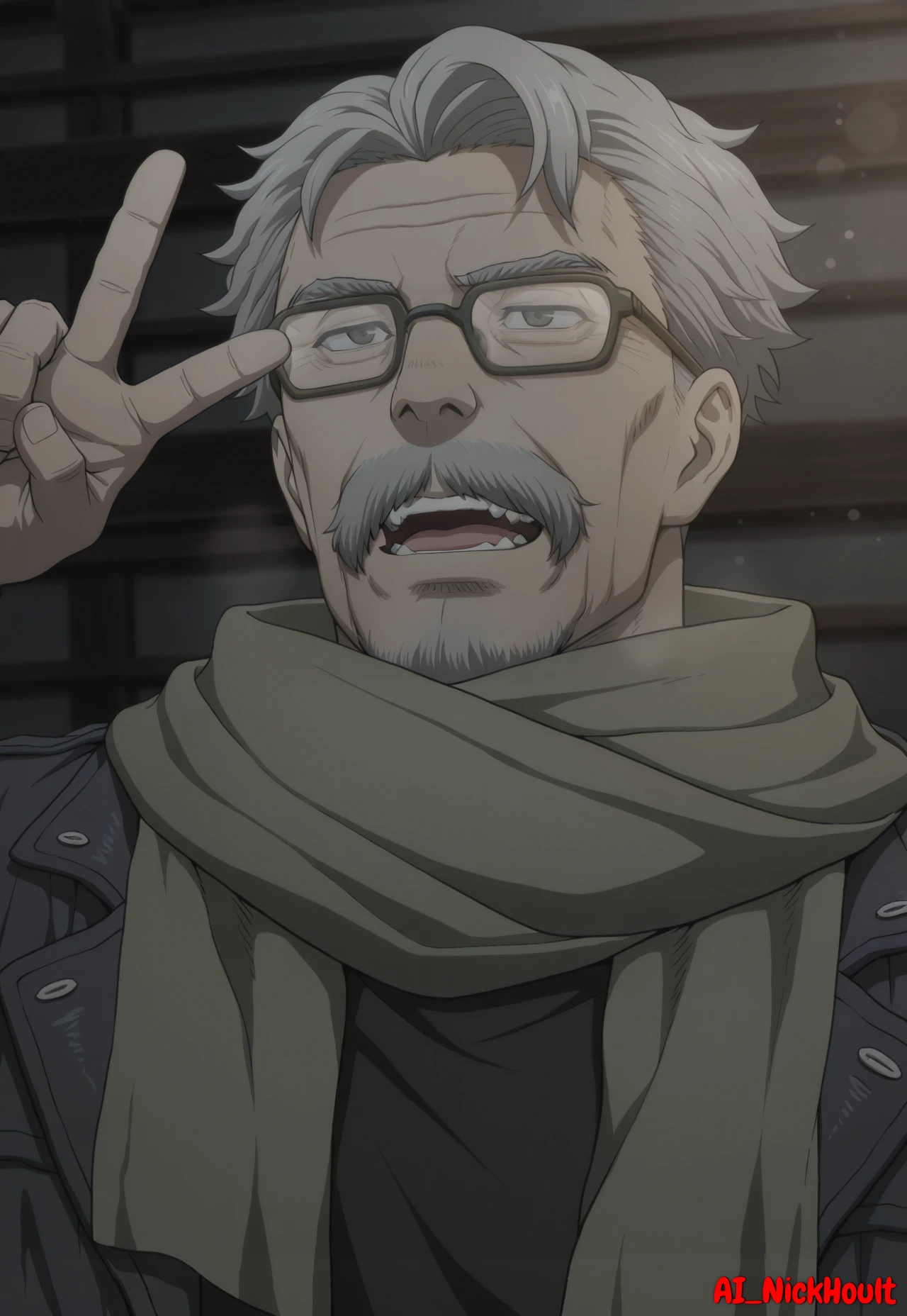 Adams, mature male, old man, gray hair, short hair, mustache, thick eyebrows, wrinkles, dark eyes, rectangular glasses,