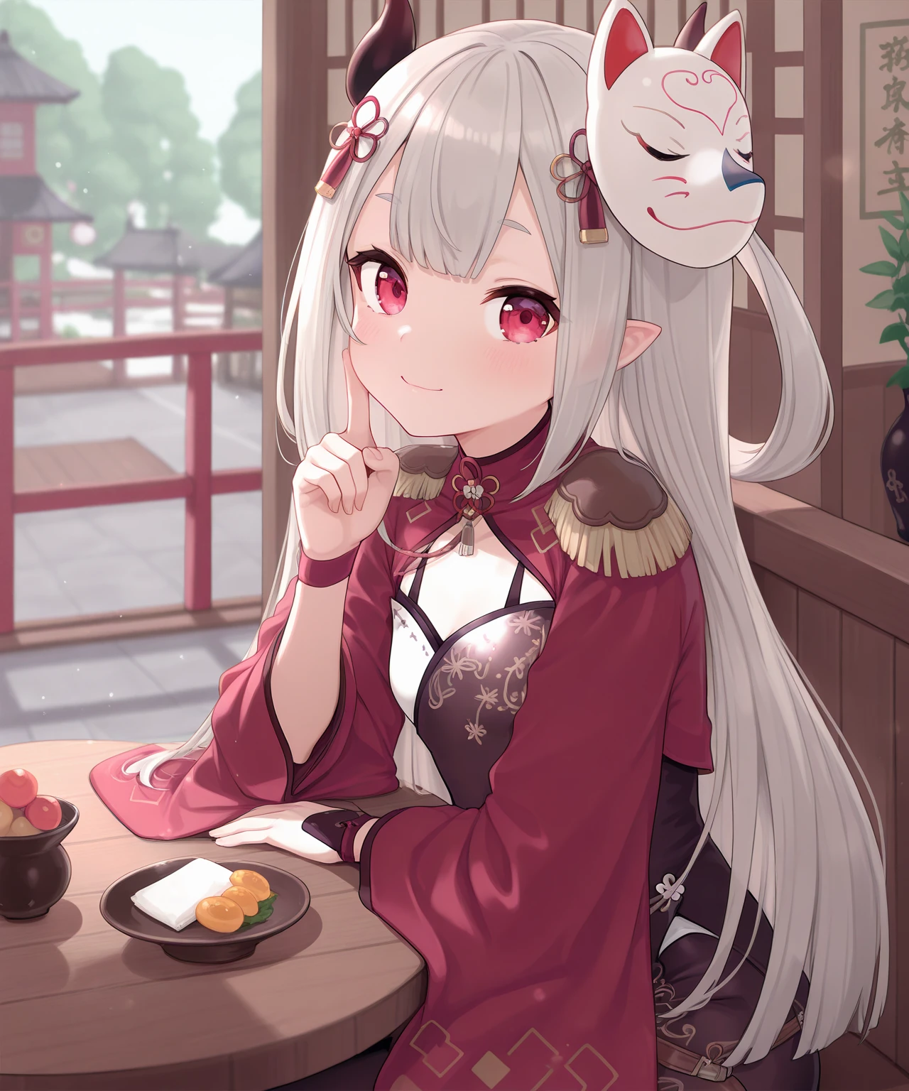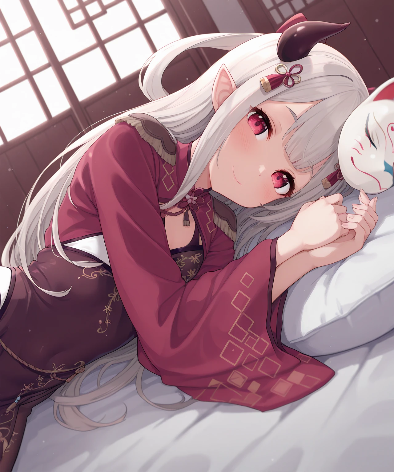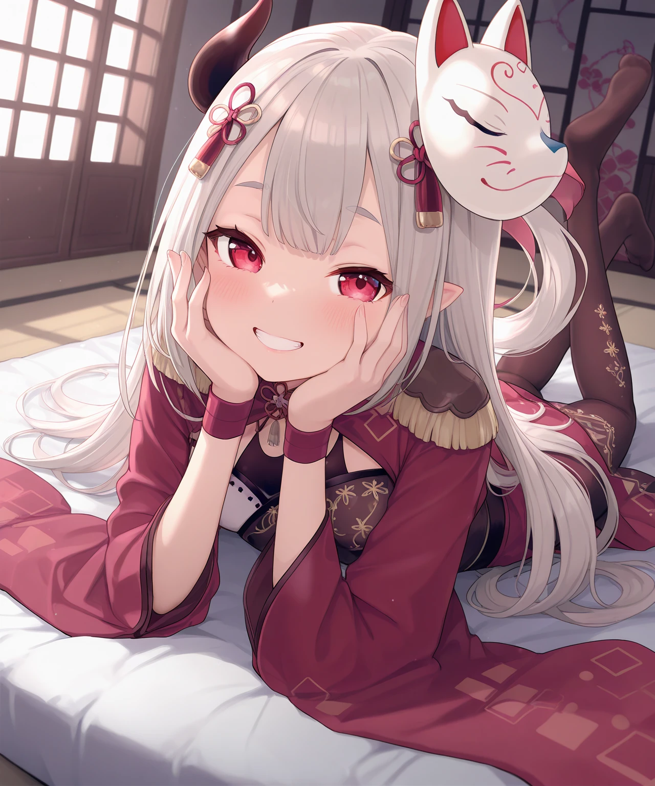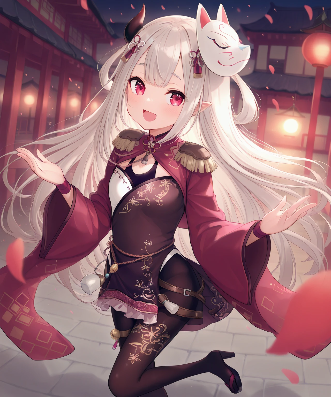 NRNijisanji, NR1stCostume, long hair, grey hair, red eyes, horns, floral print, flower knot, mask on head, shrug \(clothing\), epaulettes, wide sleeves, wristband, short dress, tassel, brown pantyhose, thigh strap, okobo