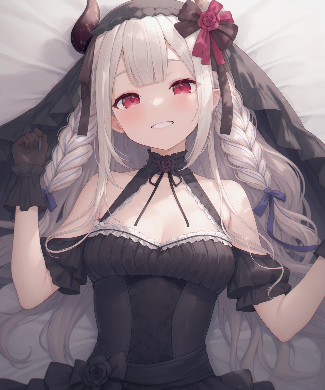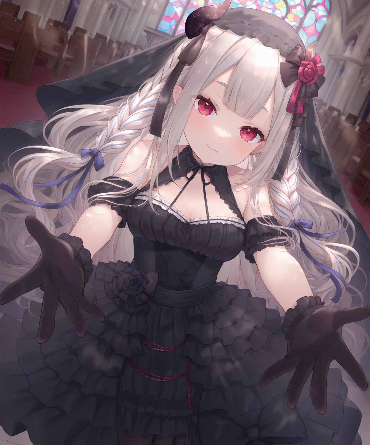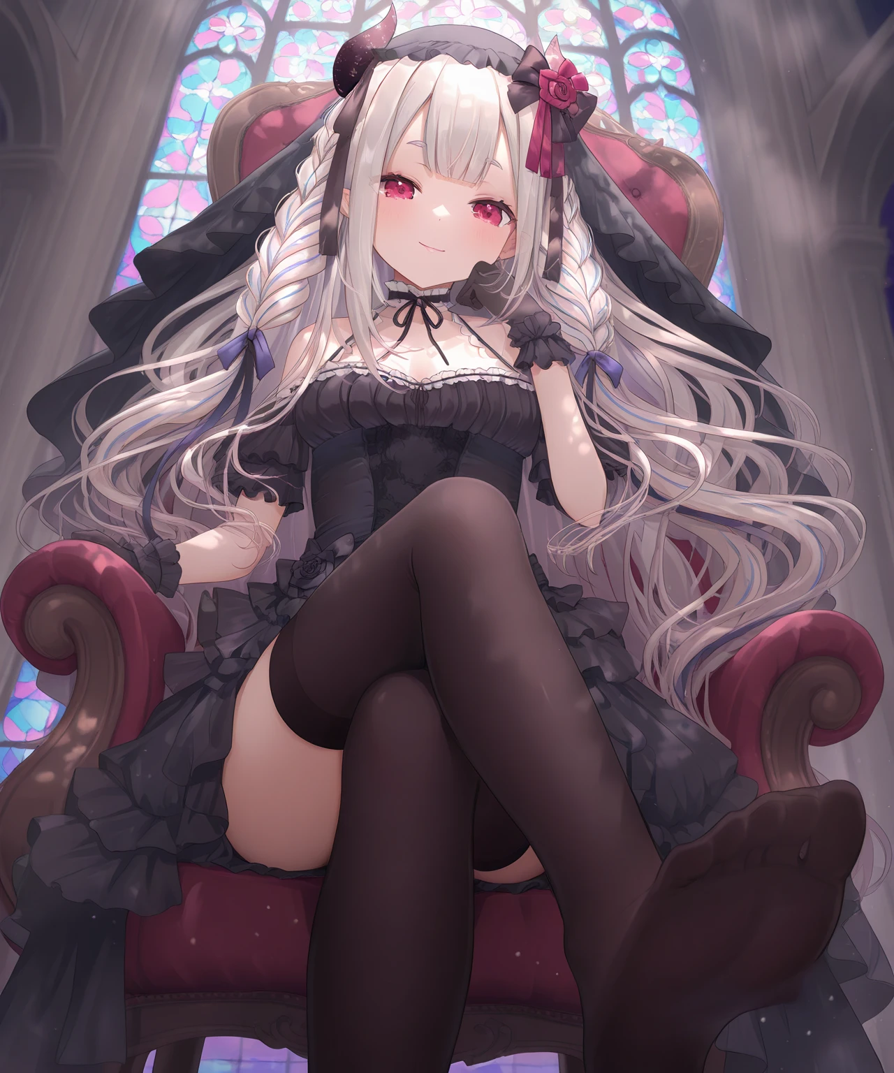 NRNijisanji, NR4thCostume, long hair, grey hair, blue hair, twin braids, medium bangs, red eyes, horns, black veil, red bow, black bow, ribbon braid, blue ribbon, black dress, dress flower, bridal garter, black thighhighs, garter straps, platform heels