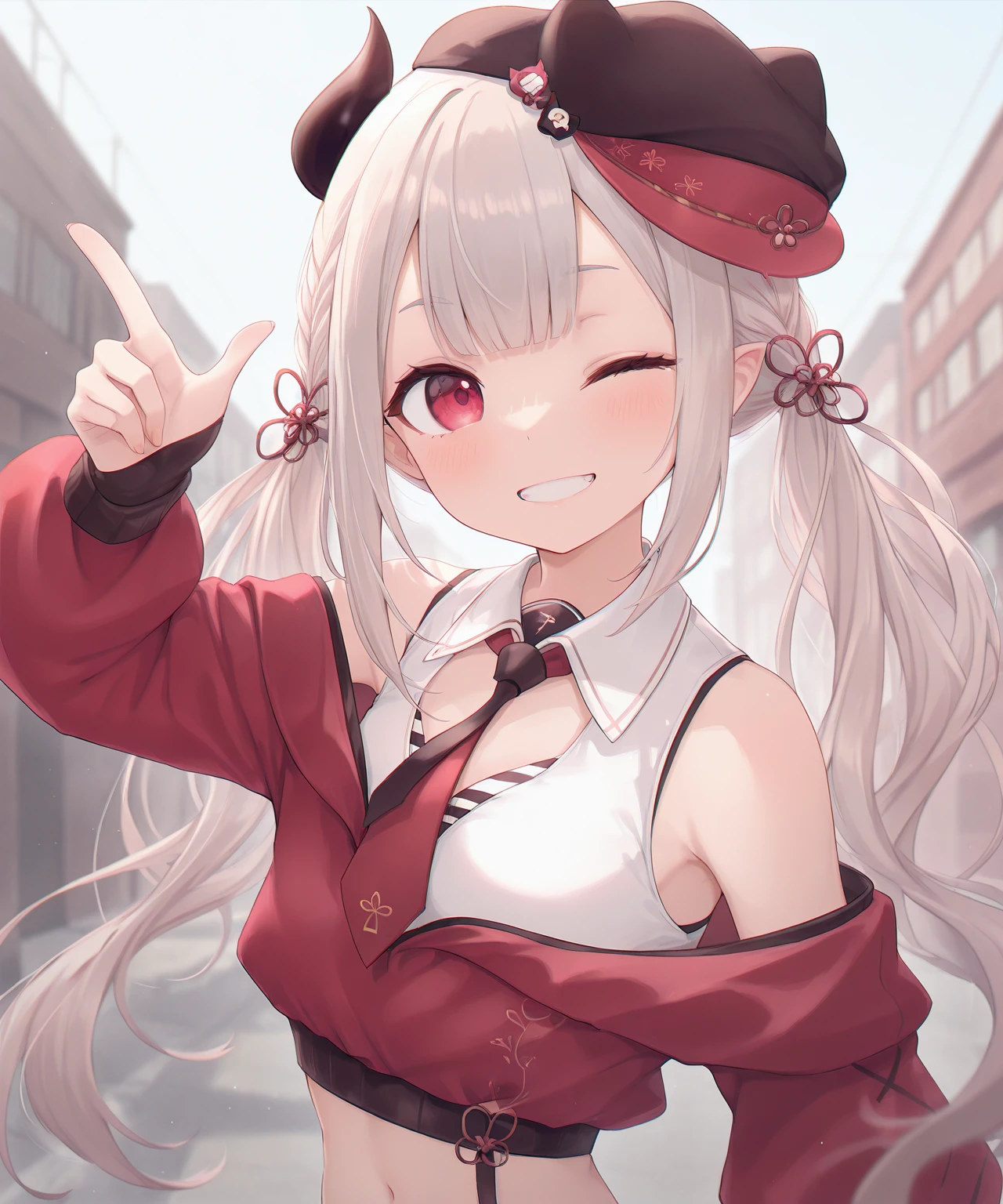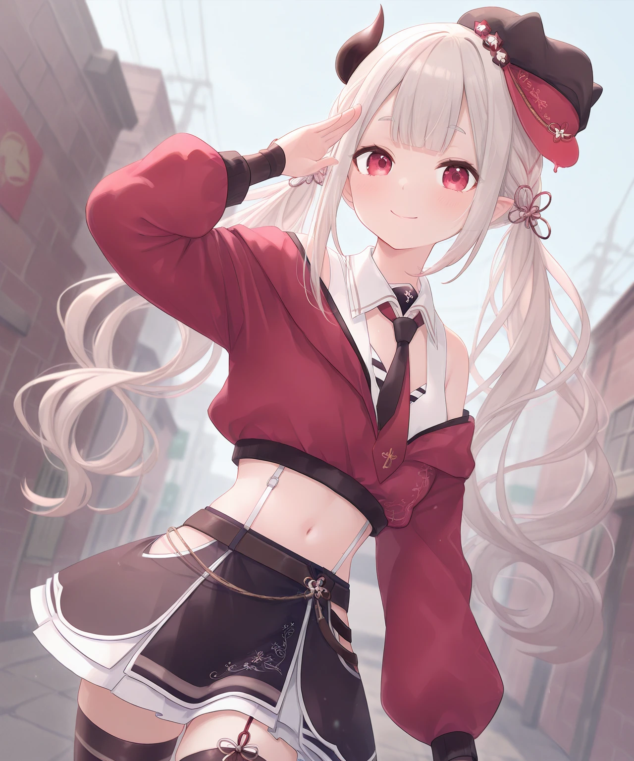 NRNijisanji, NR2ndCostume, long hair, grey hair, low twintails, red eyes, horns, navel, sideways hat, cabbie hat, flower knot, red jacket, cropped jacket, off-shoulder jacket, puffy sleeves, bridal gauntlets, collared shirt, multicolored necktie, crop top, suspenders, black skirt, garter straps, tassel, single thighhigh, high heel boots