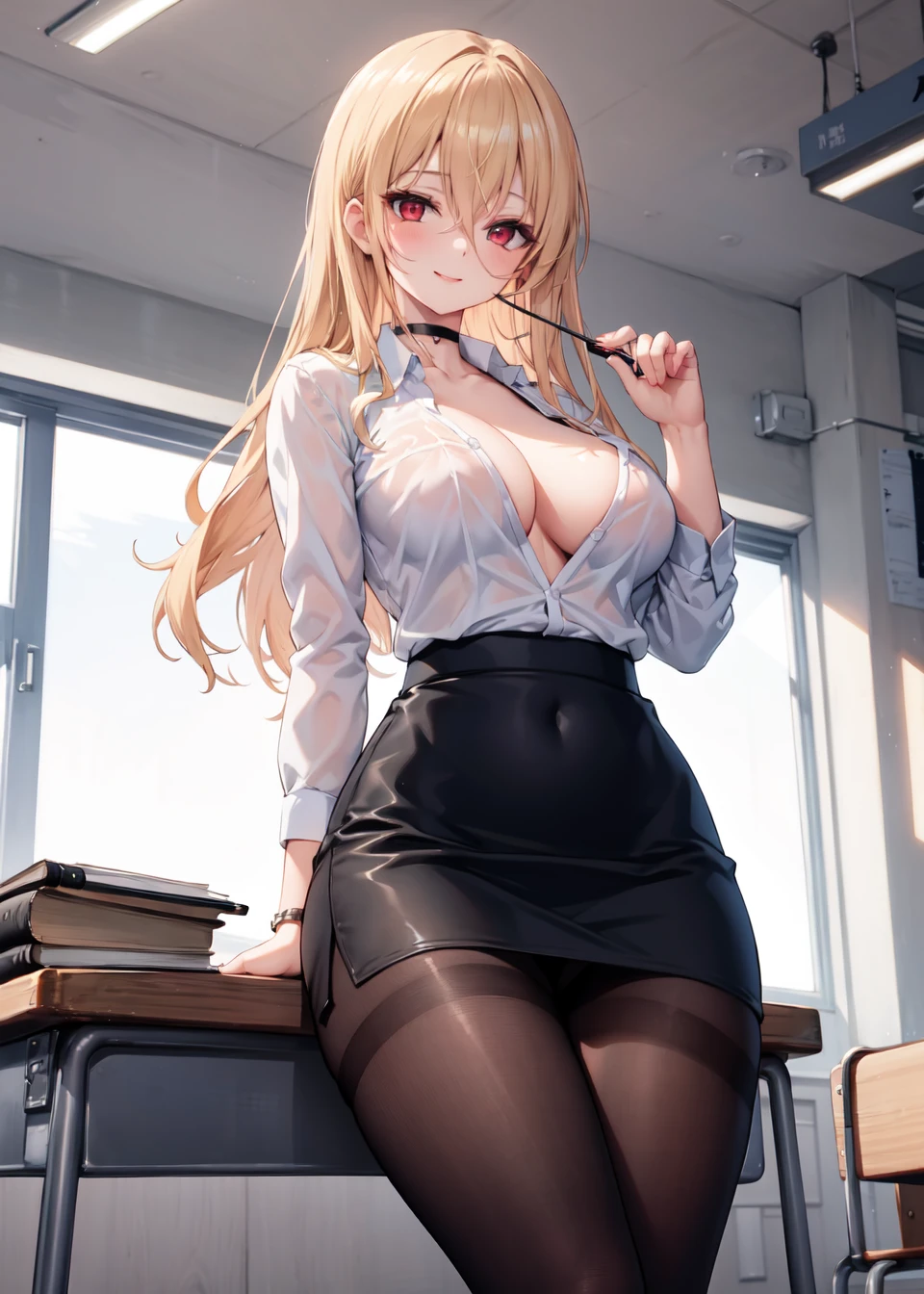 办公室的“意外(shepherd of the lost):implacable_\(azur_lane\),red eyes,blonde hair, white_shirt,pencil skirt, choker,pantyhose,