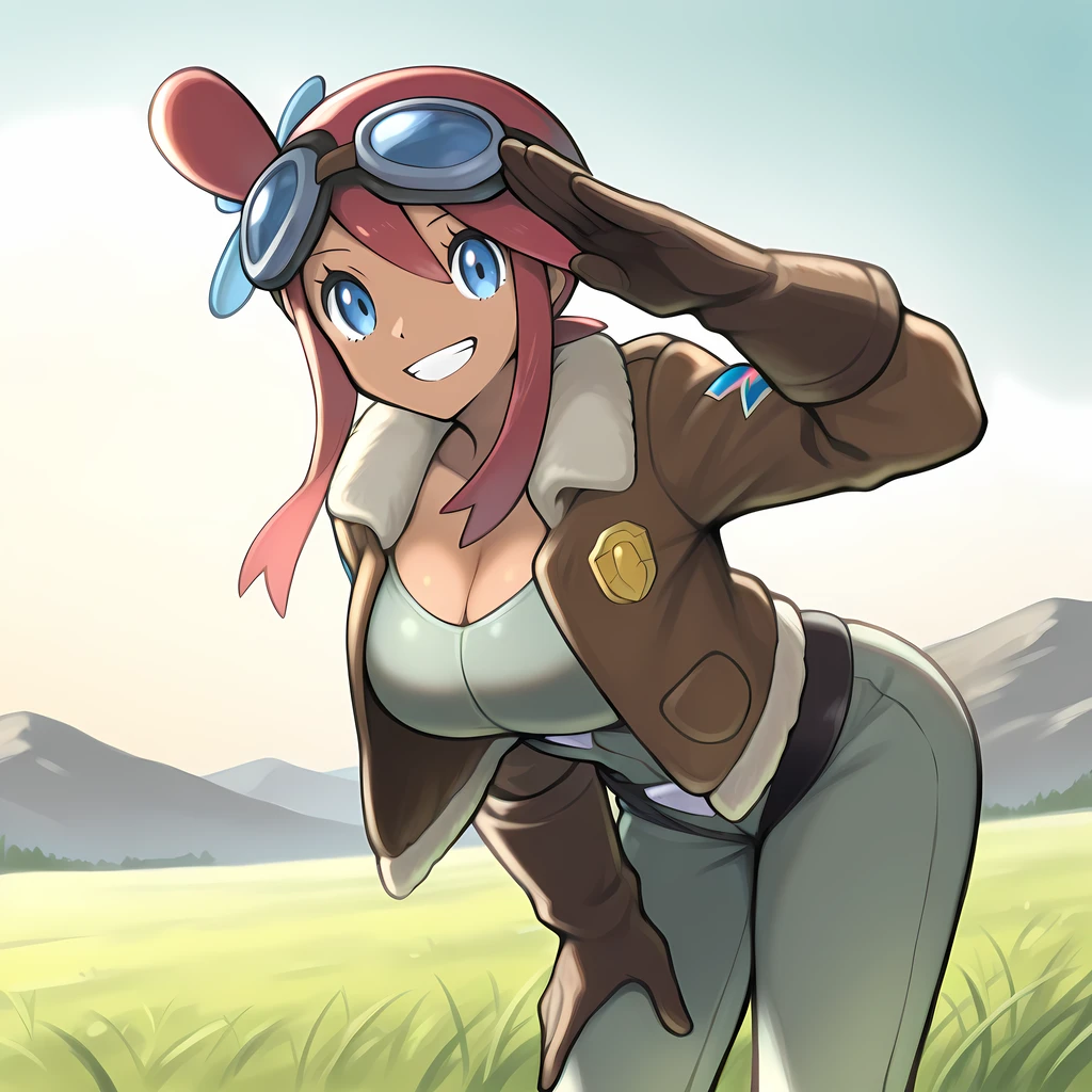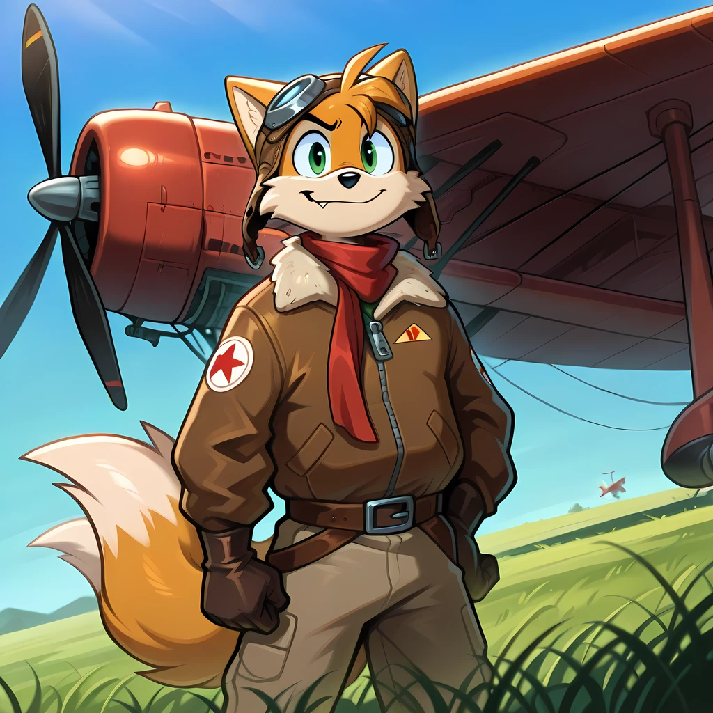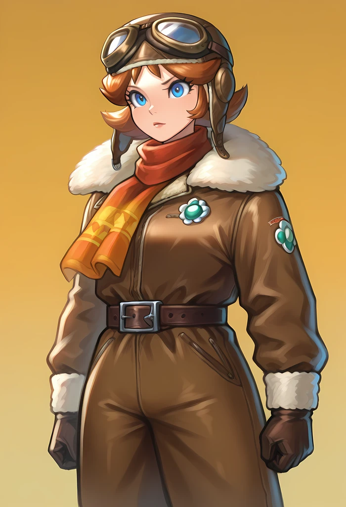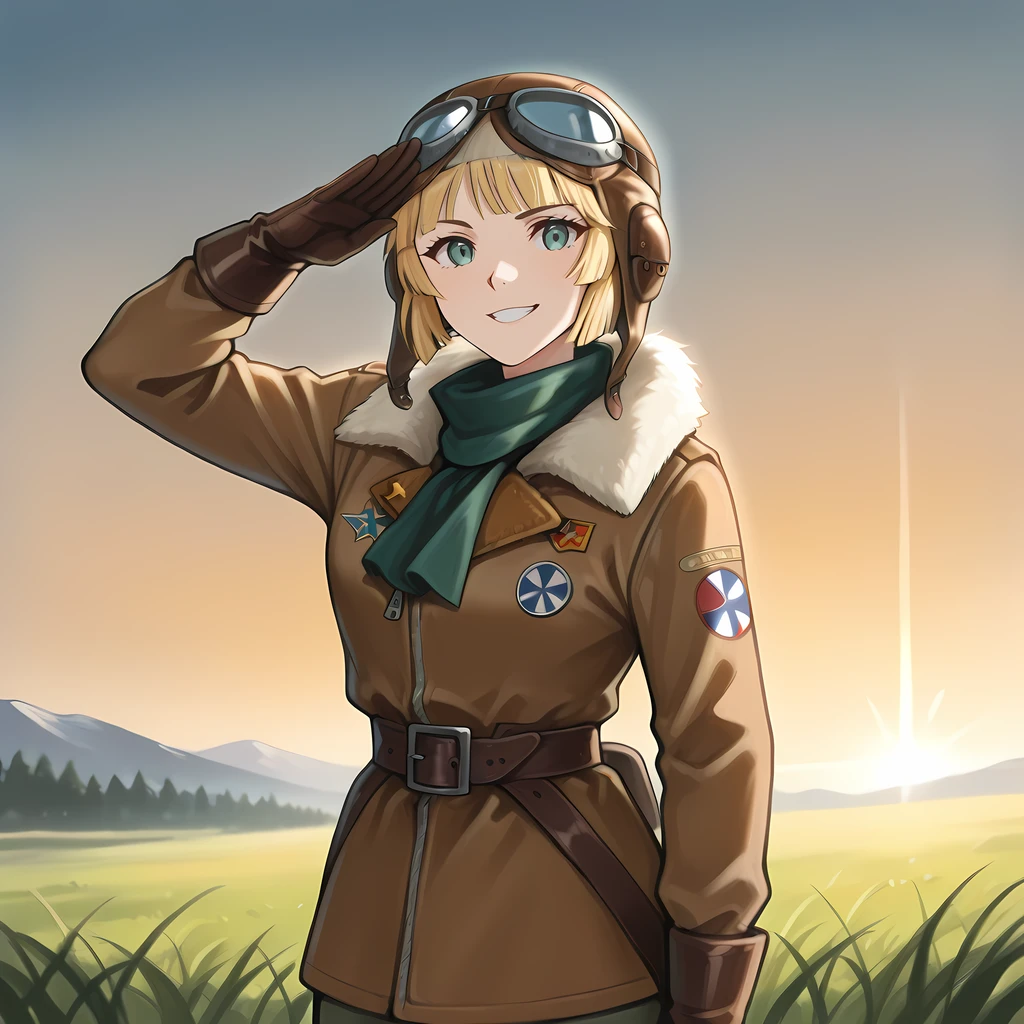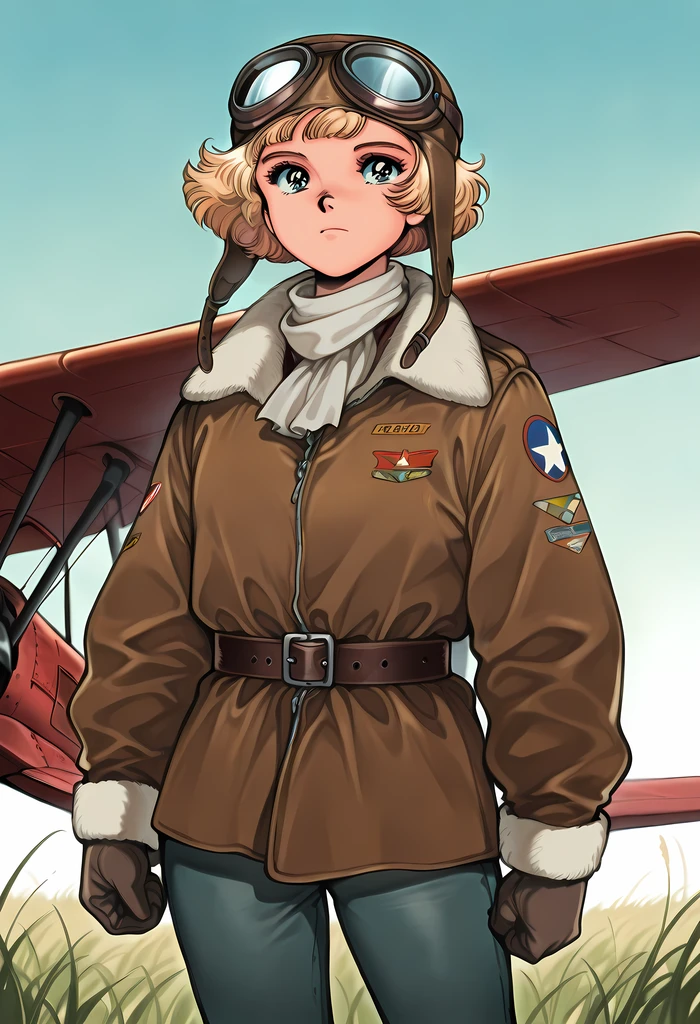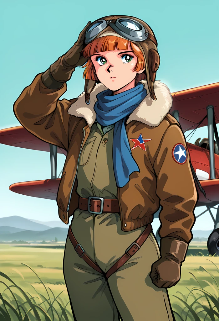 aviator cap, goggles, brown jacket, fur trim, brown gloves, bomber jacket, belt, long sleeves, scarf, military uniform