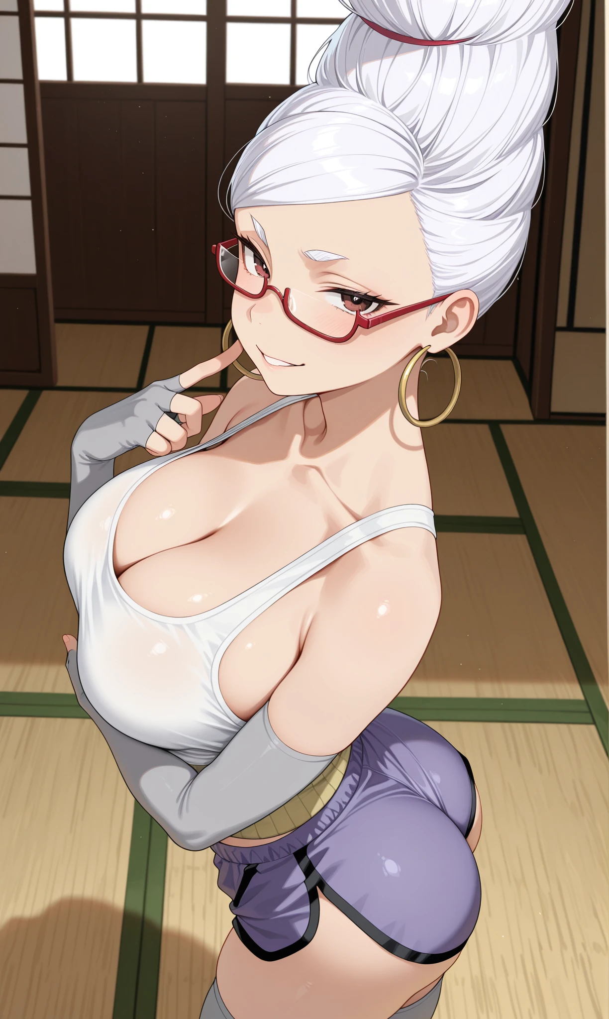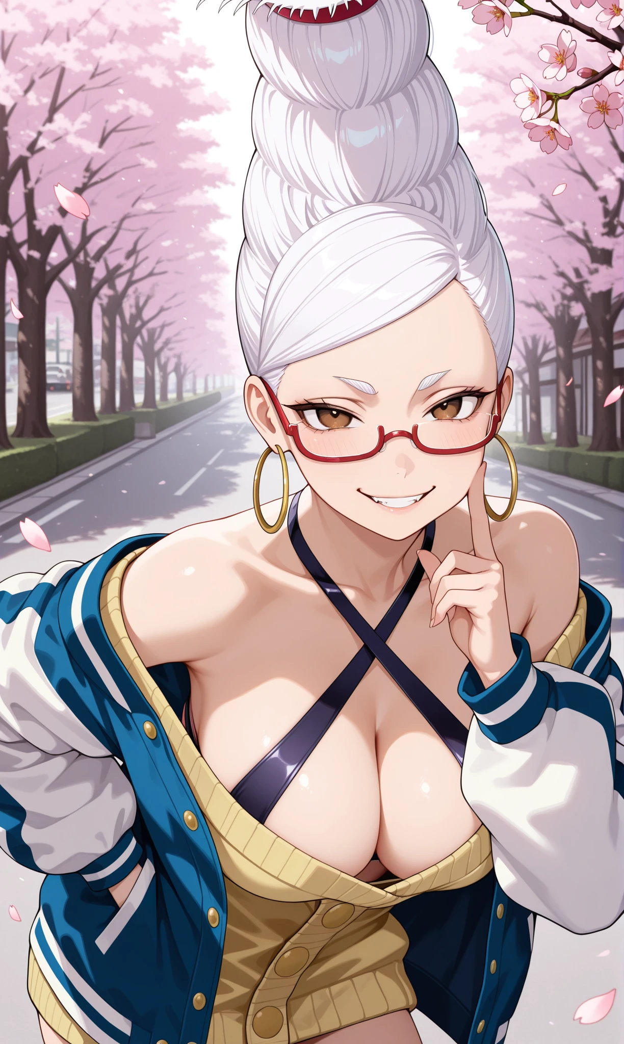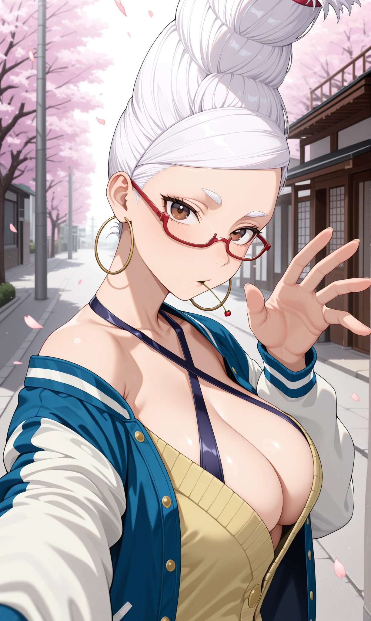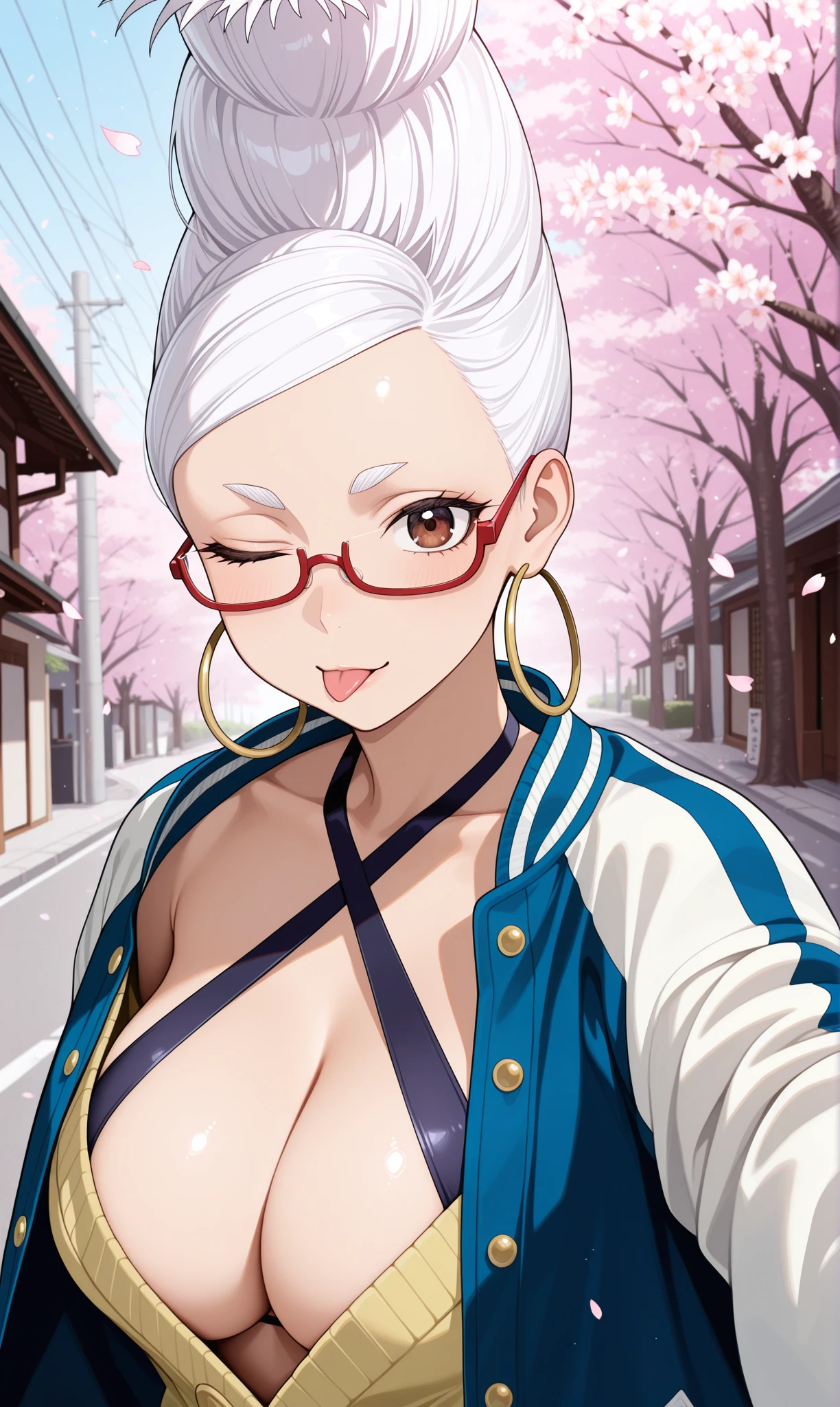 ayase seiko, brown eyes, white hair, beehive hairdo, under-rim eyewear, semi-rimless eyewear, red-framed eyewear, hoop earrings๐ข๐๐๐ณ๐ถ๐:
