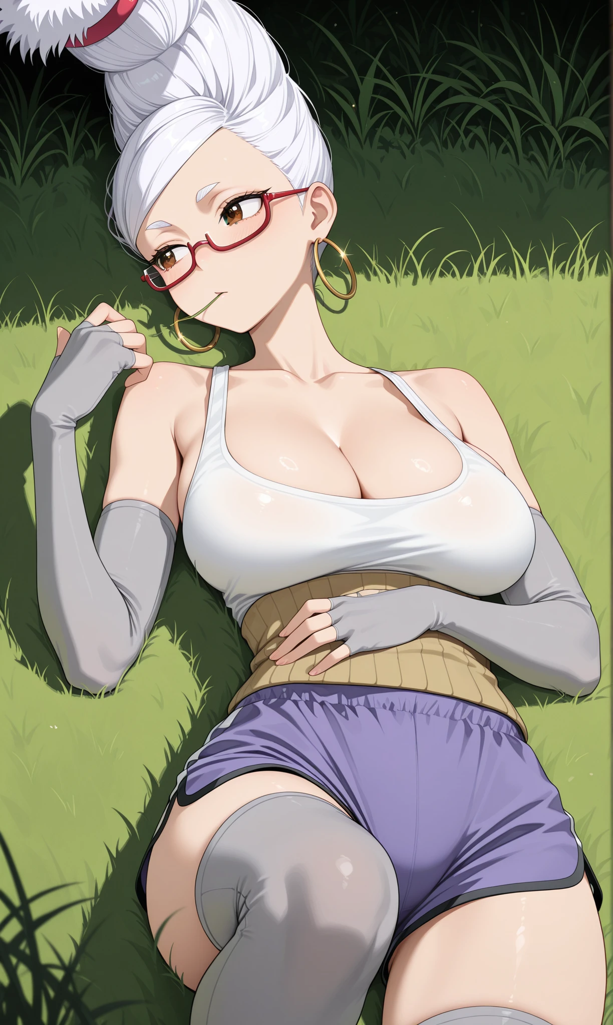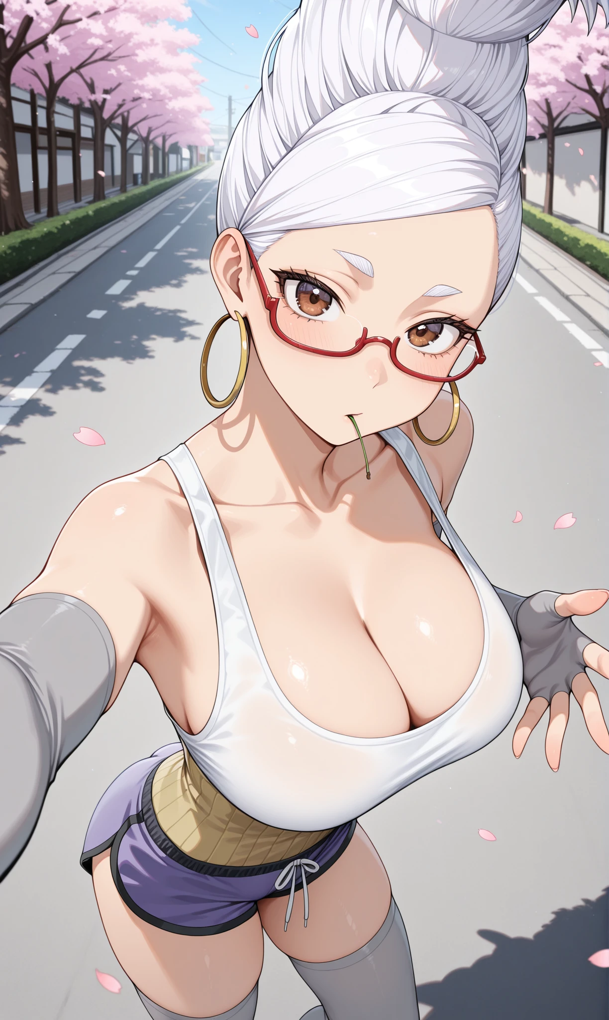 white tank top, grey detached sleeves, elbow gloves, fingerless gloves, purple dolphin shorts, grey thighhighs, cleavage, collarbone, yellow haramaki
