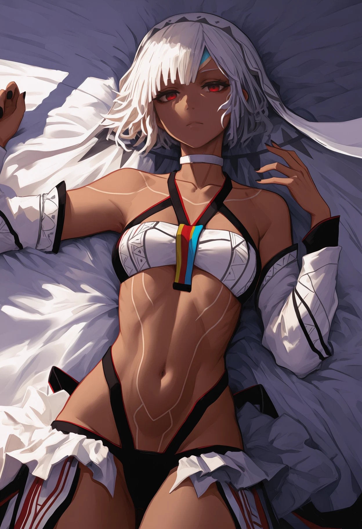 Archer: 4lt3raarcher, dark-skinned female, full-body tattoo, short hair, white hair, veil, earmuffs, red eyes, red bra, white bow, red sleeves, detached sleeves, white mittens, red panties, multi-strapped panties, red choker, bare shoulders, collarbone, stomach, navel