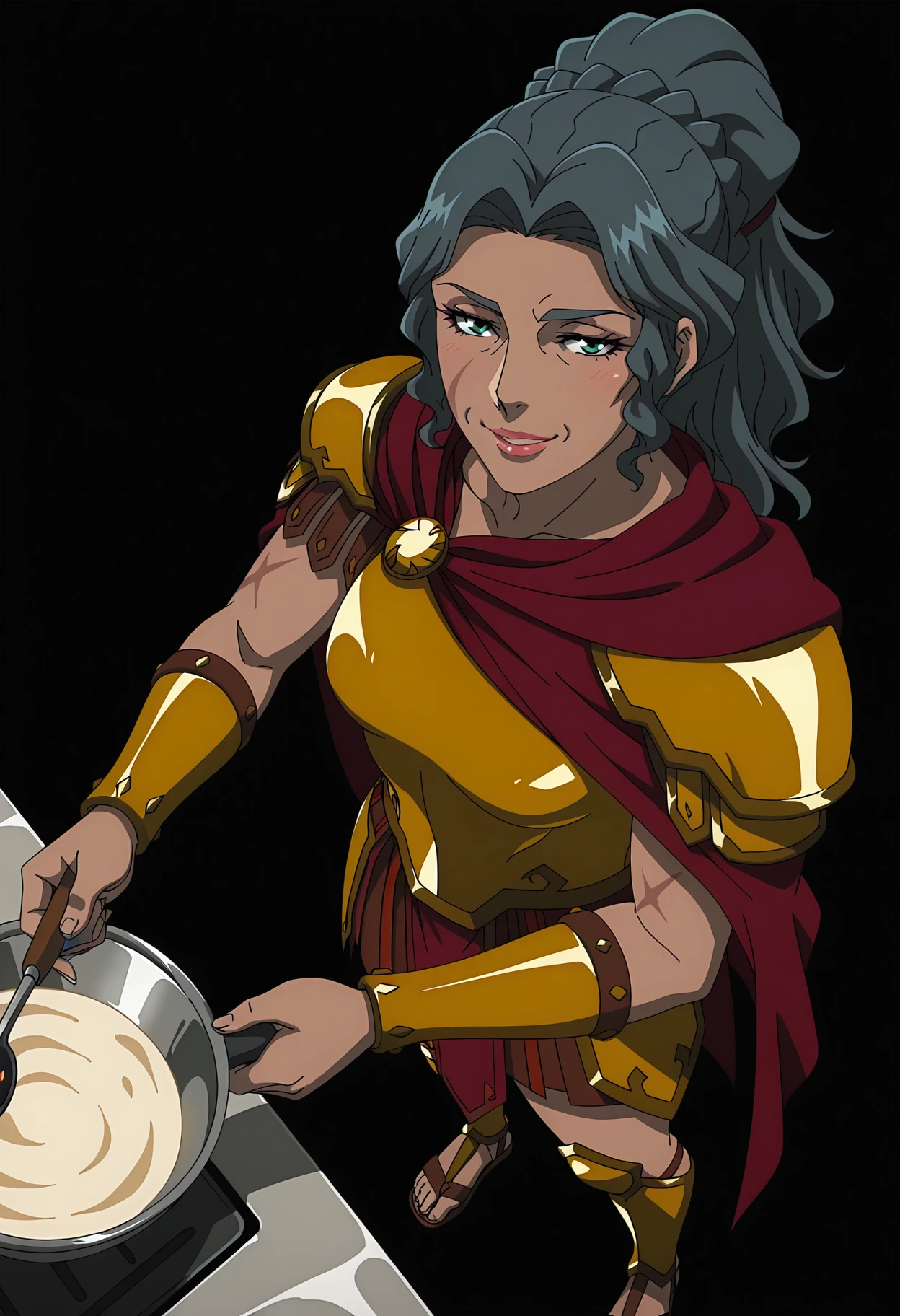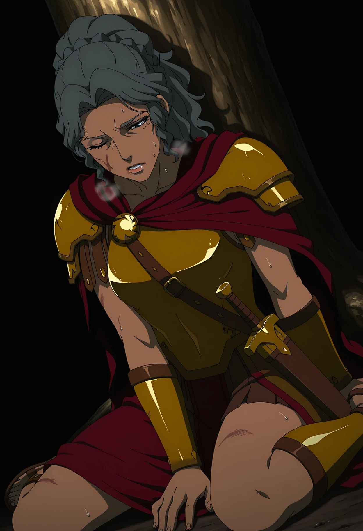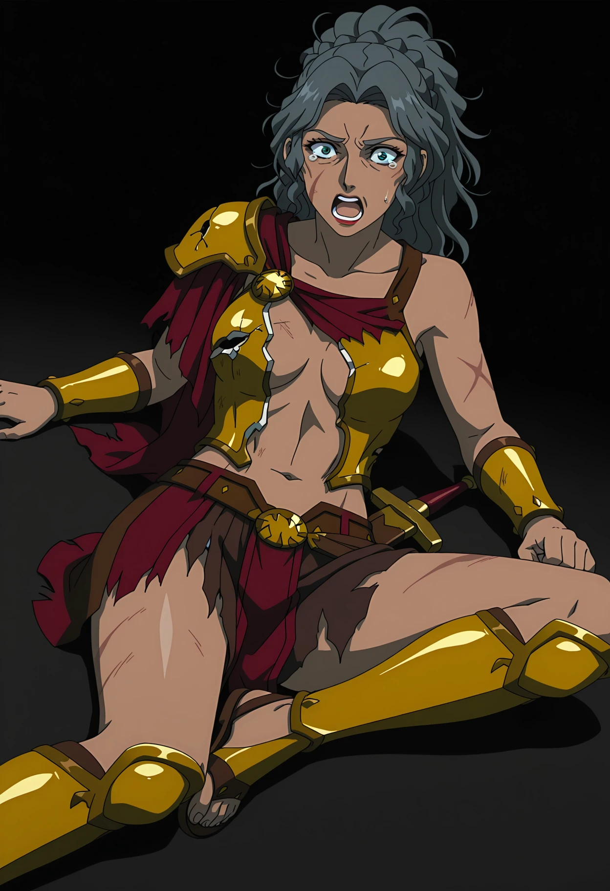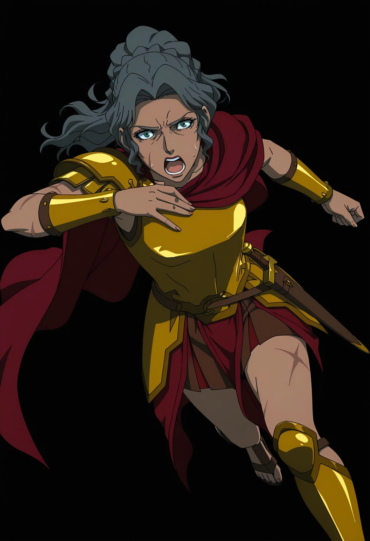 gold armor, shoulder armor, pauldrons, breastplate, red cape, bracer, vambraces, belt, , skirt, greaves, sandals