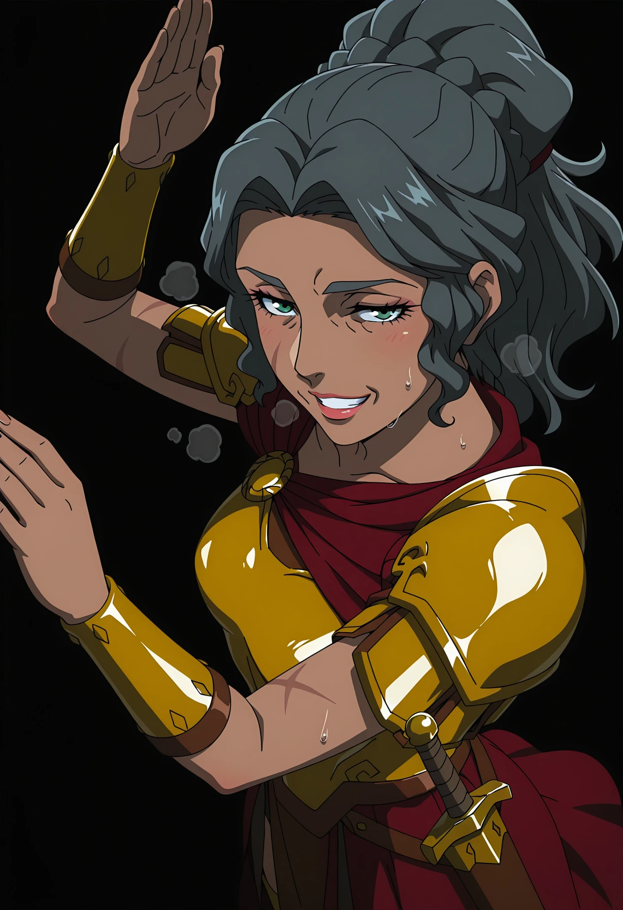 1girl, chrysanthe, mature female, dark-skinned female long hair, black hair, scar, blue eyes, grey hair, ponytail, makeup, lipstick