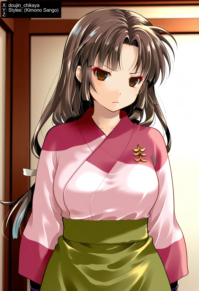 sango, brown eyes, makeup, blunt bangs, brown hair, long hair or ponytailIf you want to try to generate the doujin styles.. Try to use one at a time, I'm not sure they can be mixed.