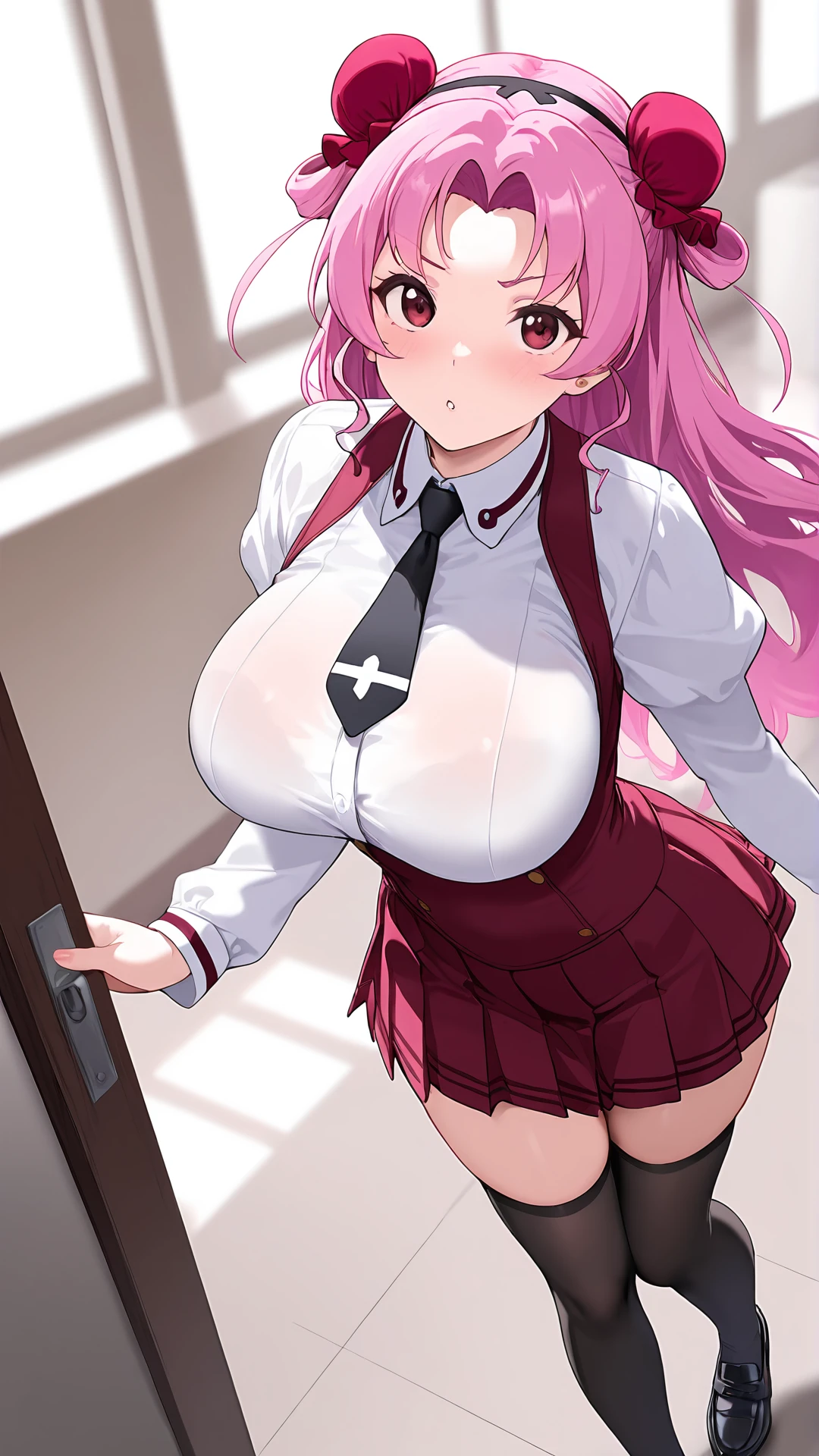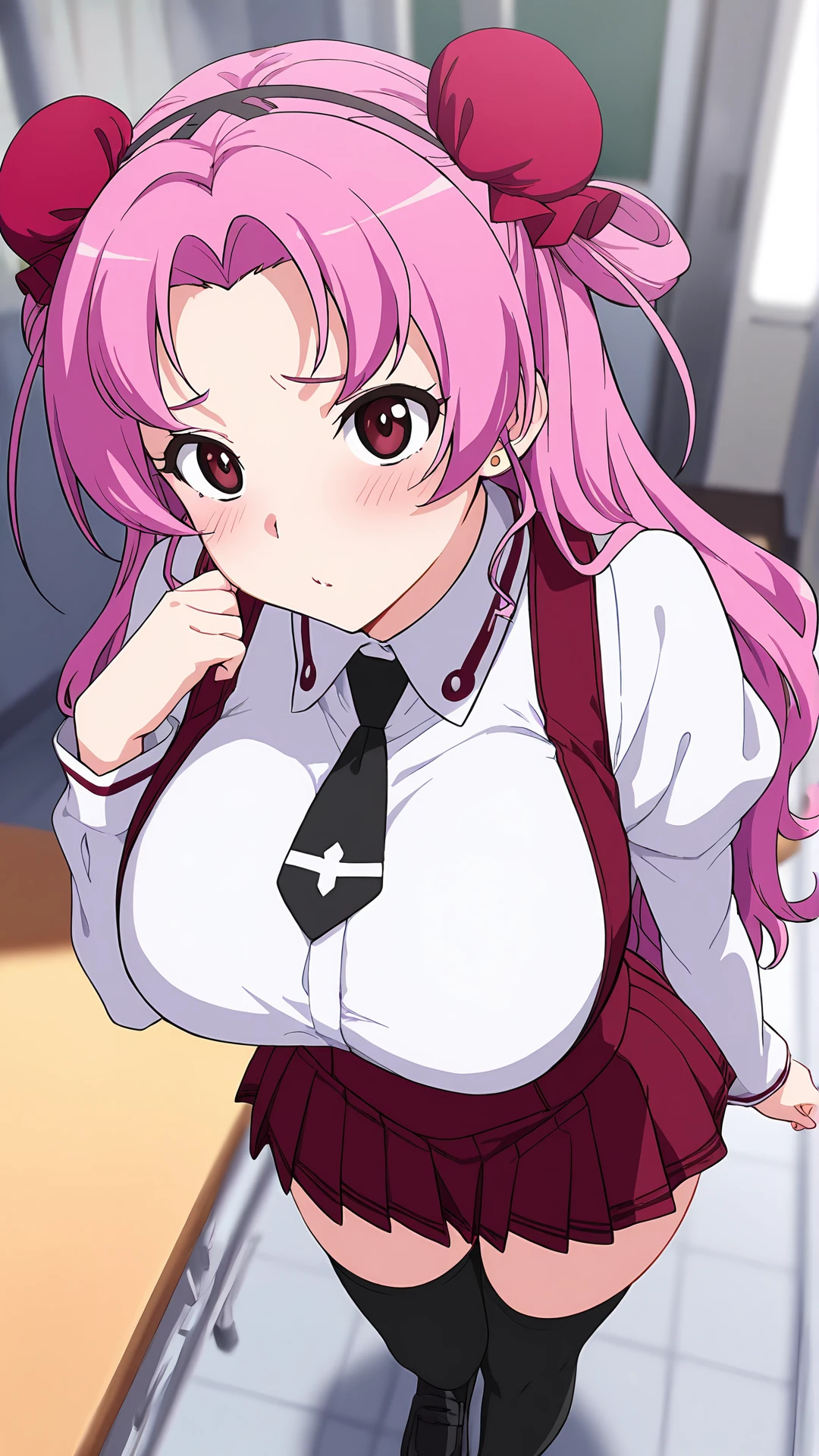 Tsujido Miyuri,1girl,solo,thighhighs,long hair,pink hair,zettai ryouiki,necktie,skirt,black thighhighs,long sleeves,school uniform,red skirt,shirt,miniskirt,,,black necktie,white shirt,double bun,pleated skirt,hair bun,hairband,black footwear,