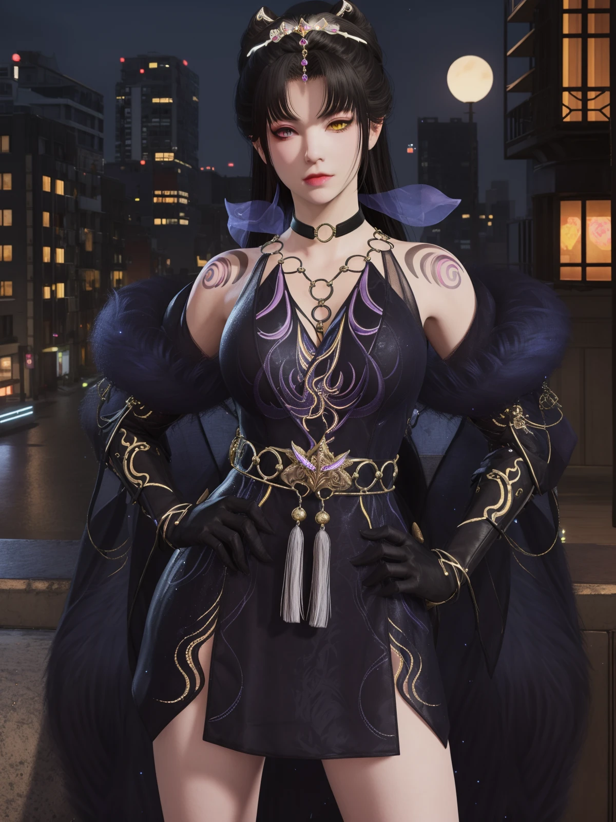 YJWJyulinglongXSLY, 1girl, dress, heterochromia, tattoo, looking at viewer, fur trim, solo, bare shoulders, jewelry, elbow gloves, choker, o-ring,cityscape, night, sash, hair ornament, slit pupils,long hair,