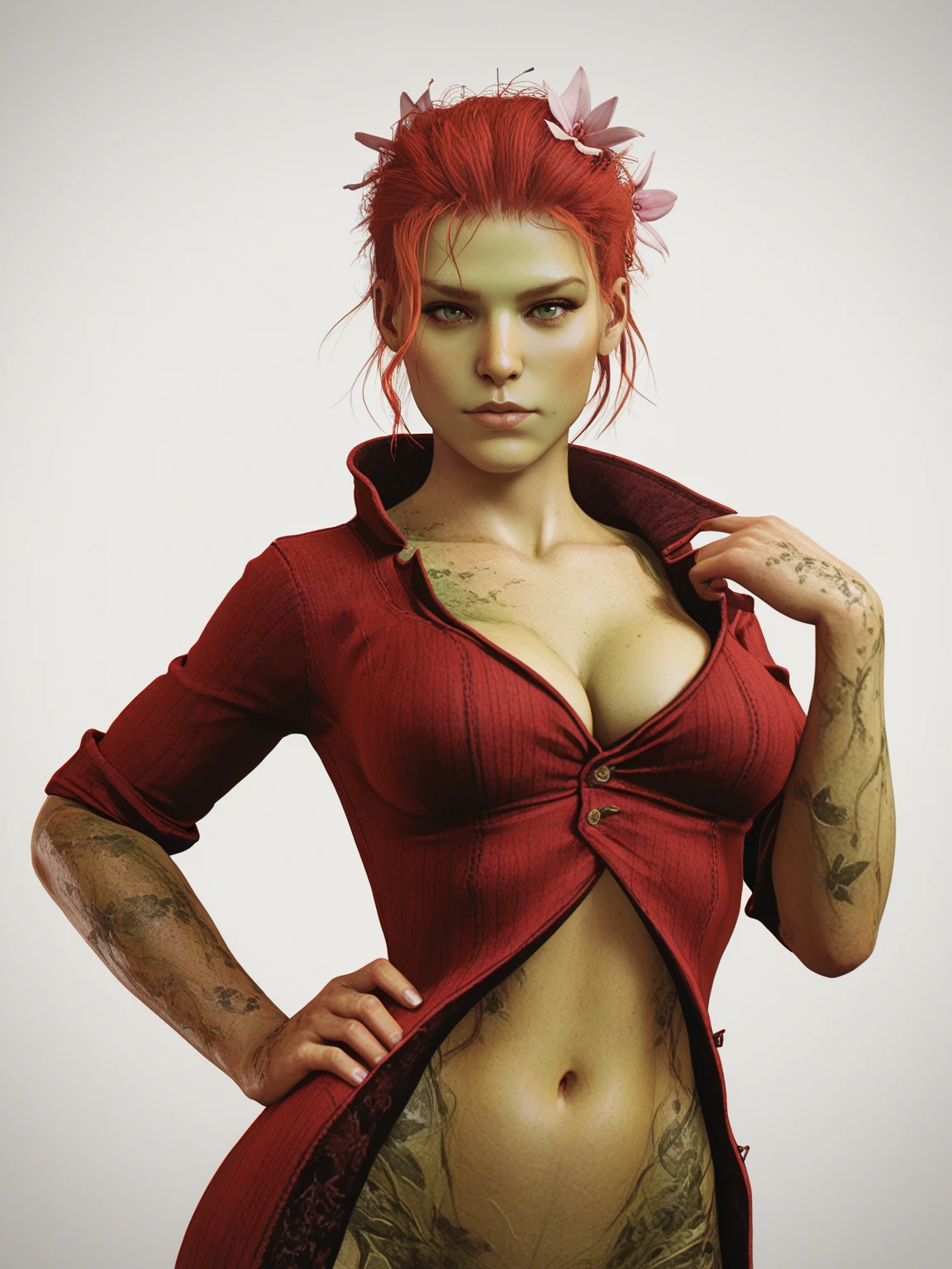 baspivy, red hair, hair bun, hair flower, green eyes, colored skin, green skin, monster girl, red jacket, sleeves rolled up, cleavage, navel