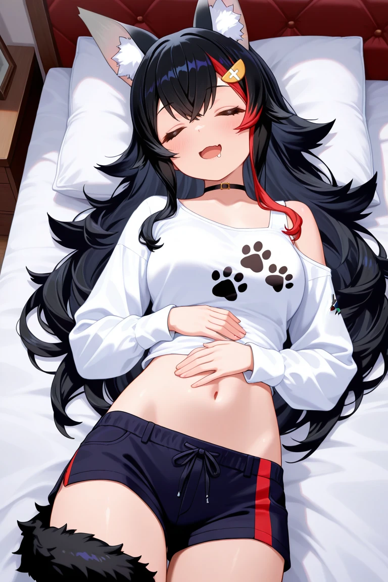For her casual outfit : you can generate her white shirt instead with the following prompts : white shirt, shoulder cutout, paw print pattern