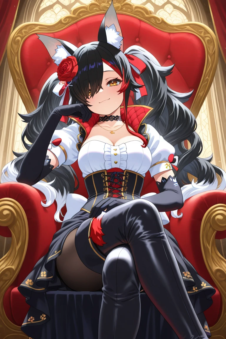 miowonderland, very long hair, wavy hair, twintails, asymmetrical bangs, hair over one eye, hair flower, hair bow, black lace choker, necklace, white romper, center frills, popped collar, black dress, underbust dress, corset, cross-lace, puffy short sleeves, black elbow gloves, pantyhose, thigh boots,
