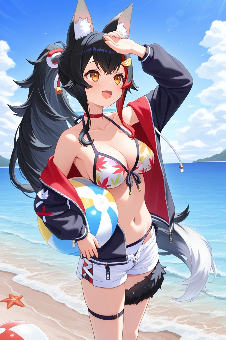 miosummer, black jacket, off-shoulder, white bikini, leaf print, white shorts, thigh strap