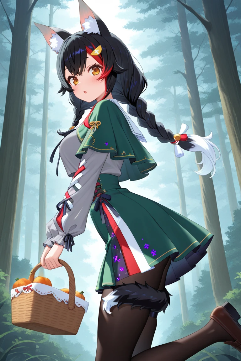 ookami mio, wolf girl, wolf ears, wolf tail, wolf ears, animal ear fluff, yellow eyes, black hair, red hair, streaked hair, tail wrap, tail around own leg,