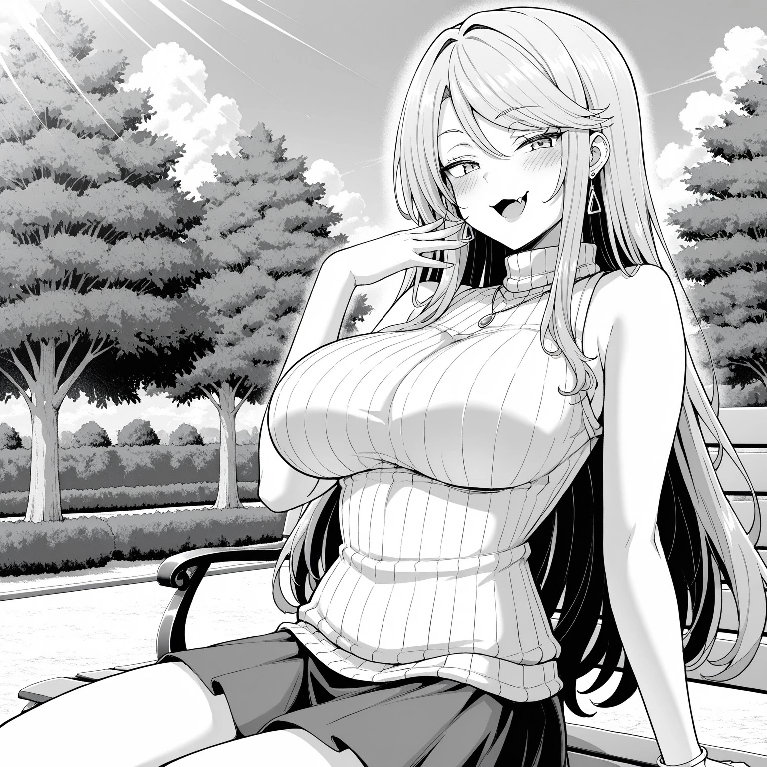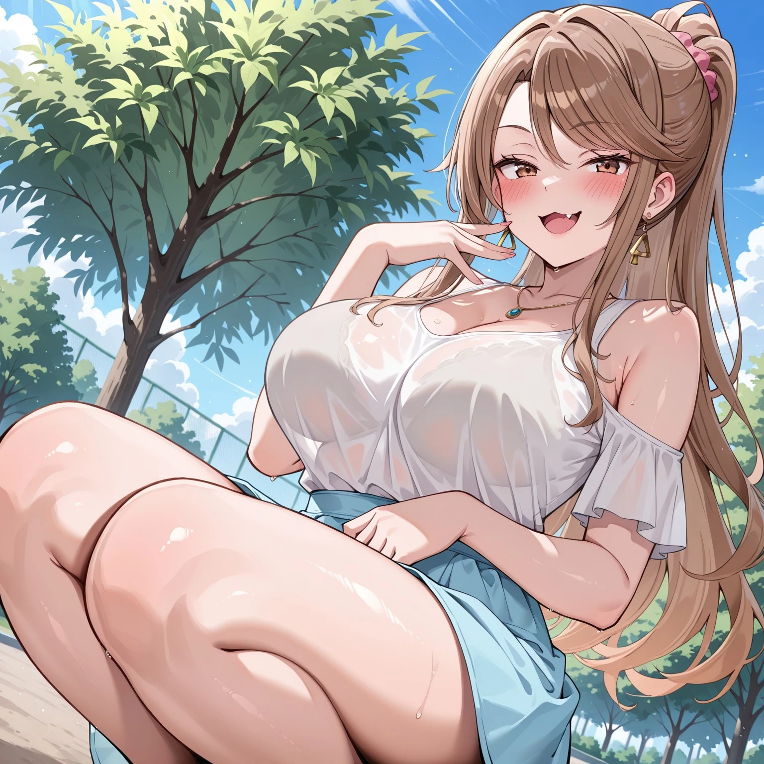 Base: shibas, 1girl, large breasts, fang, long hair, earrings