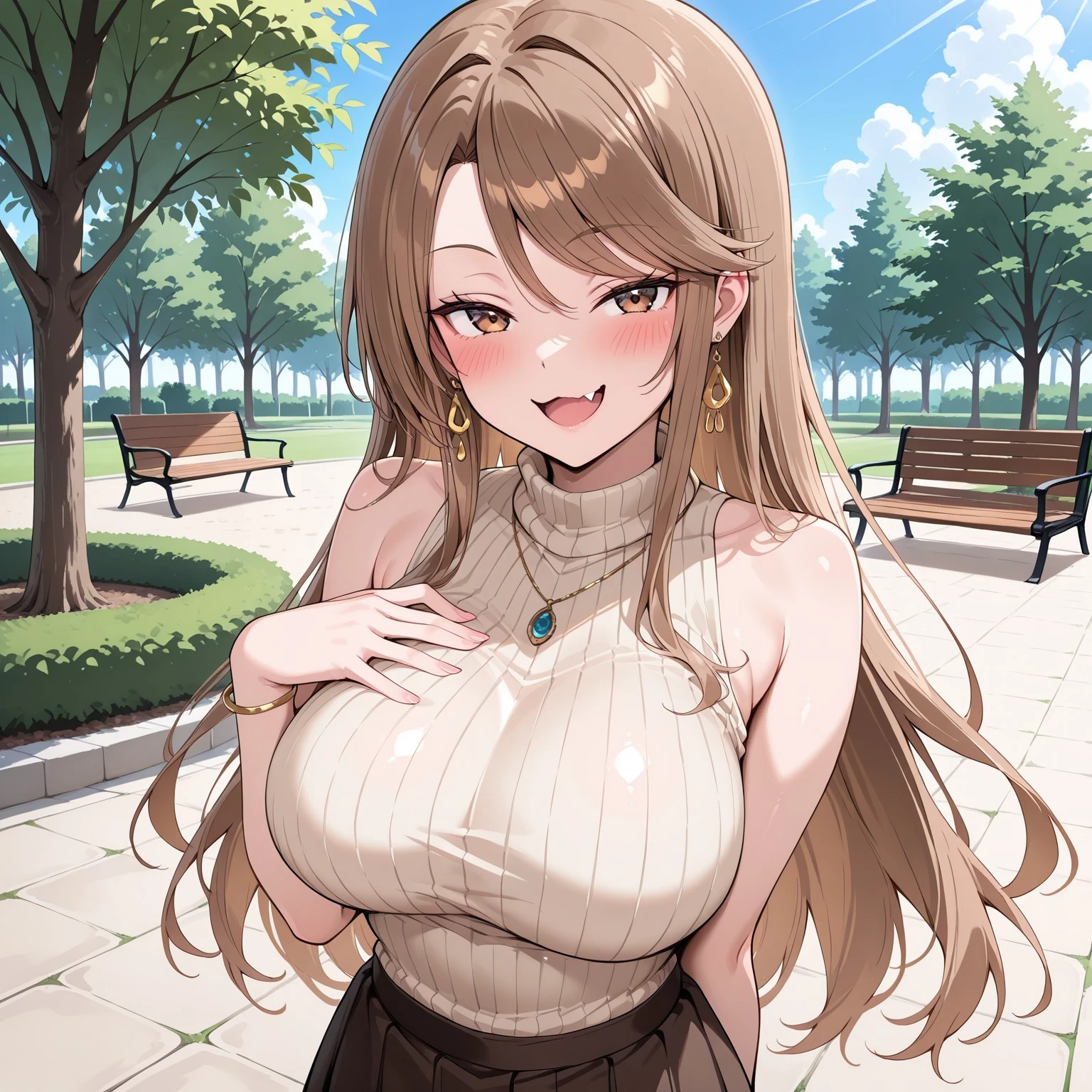 base: shicol, 1girl, brown hair, long hair, large breasts, brown eyes, fang, earrings, golden earrings