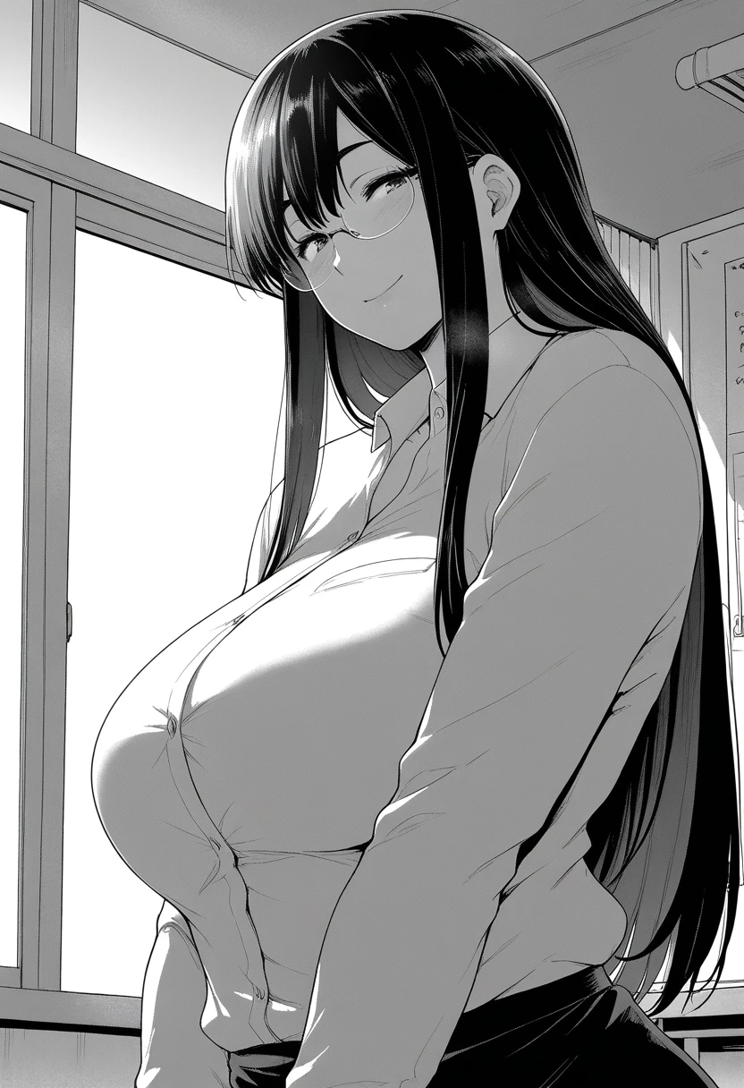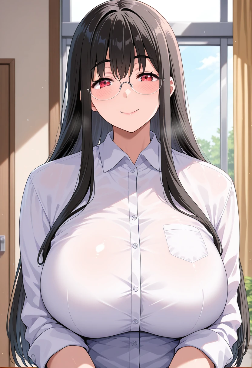 shiraseww, mature female, red eyes, black hair, long hair, sidelocks, large breasts, glasses, rimless eyewear,