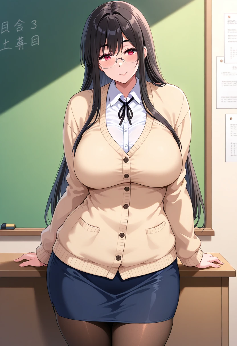 teacher, neck ribbon, cardigan, collared shirt, long sleeves, pencil skirt, pantyhose,