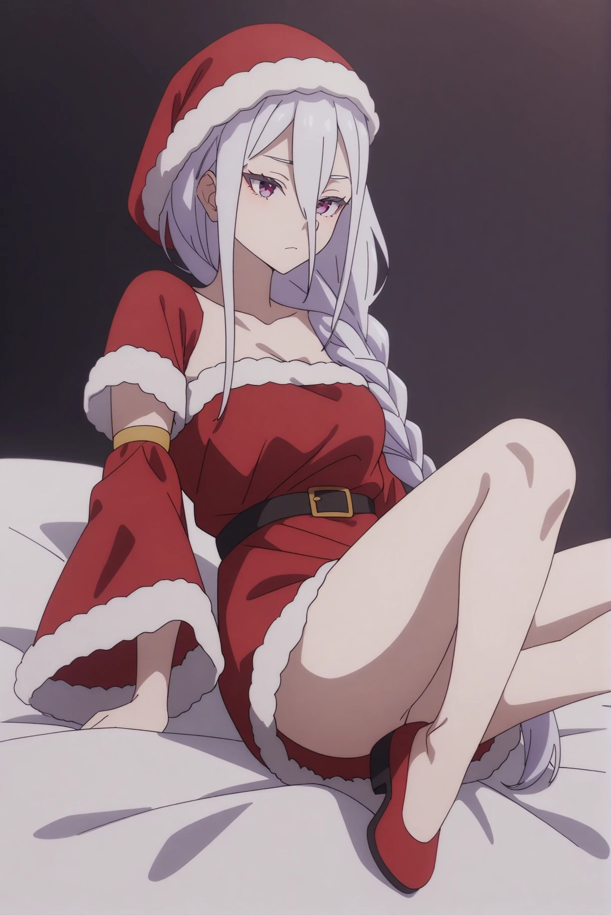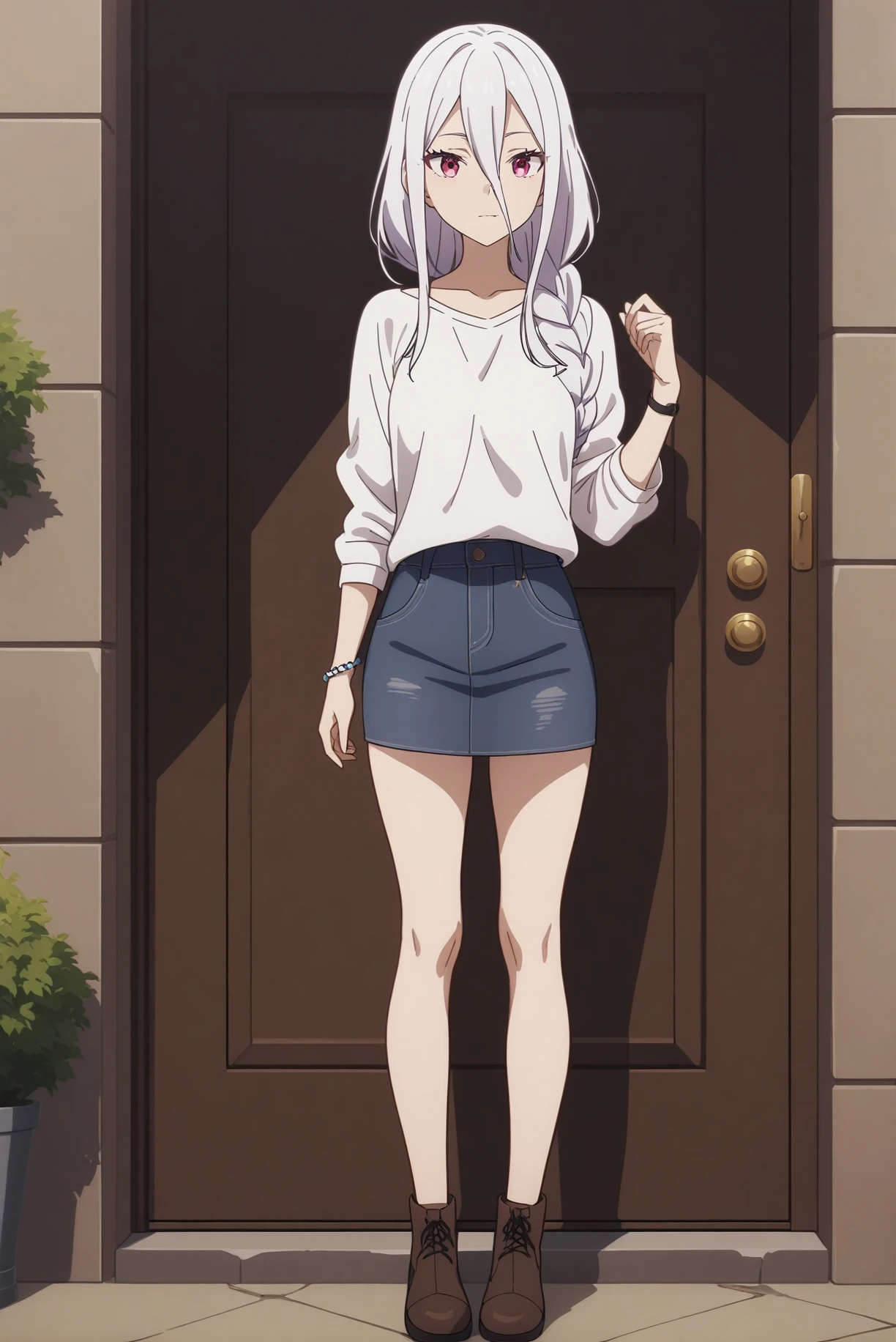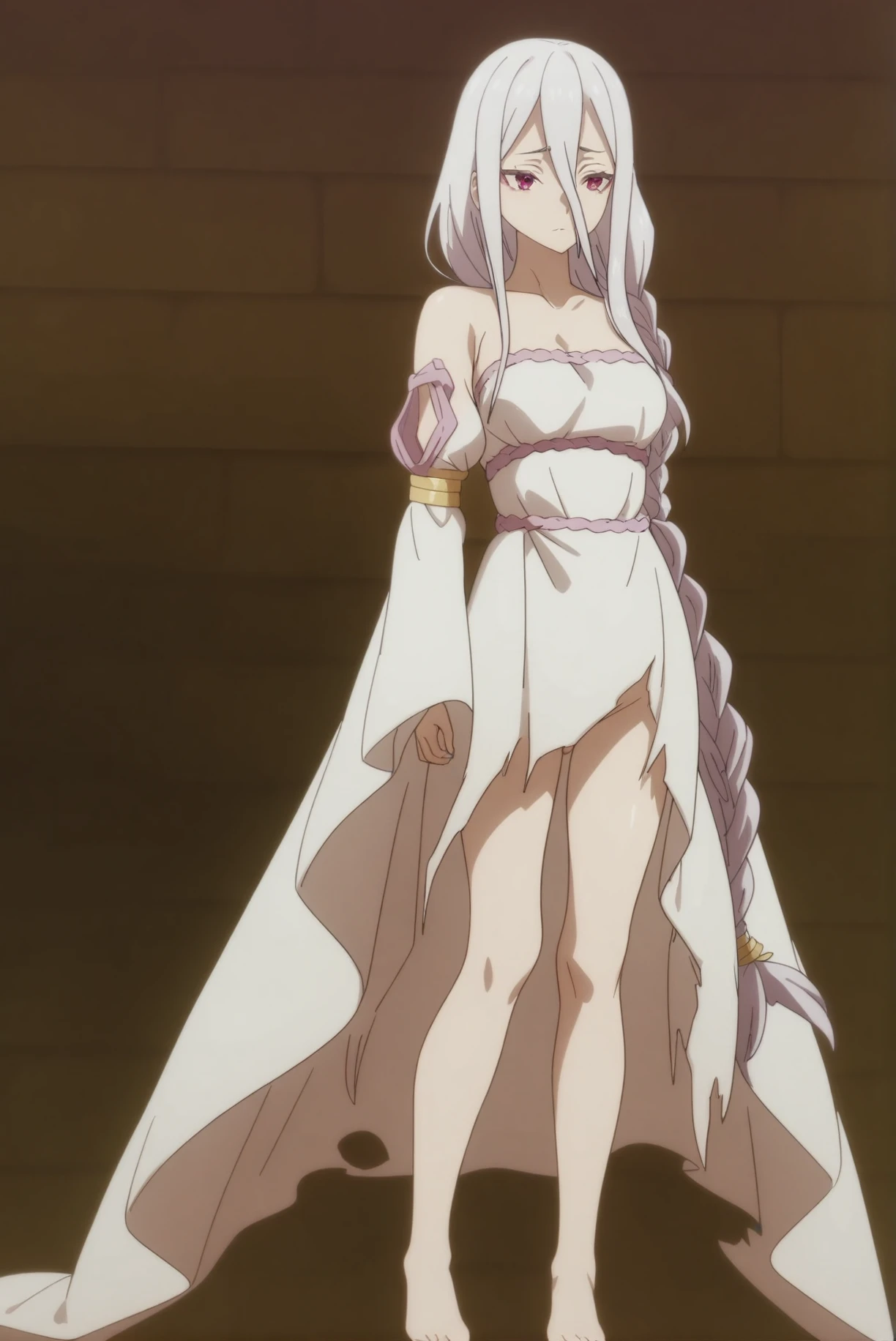 kd-shiraori, white dress, white knee boots, long braid, white hair
