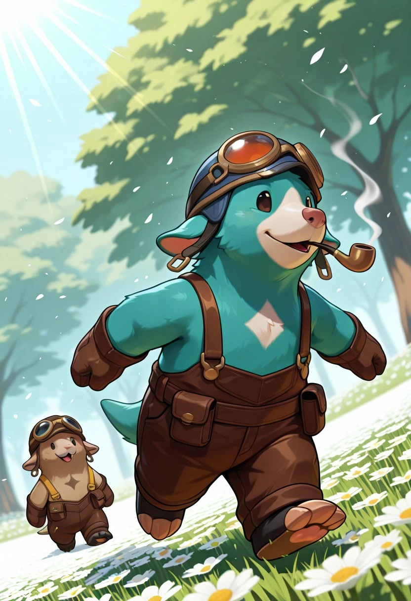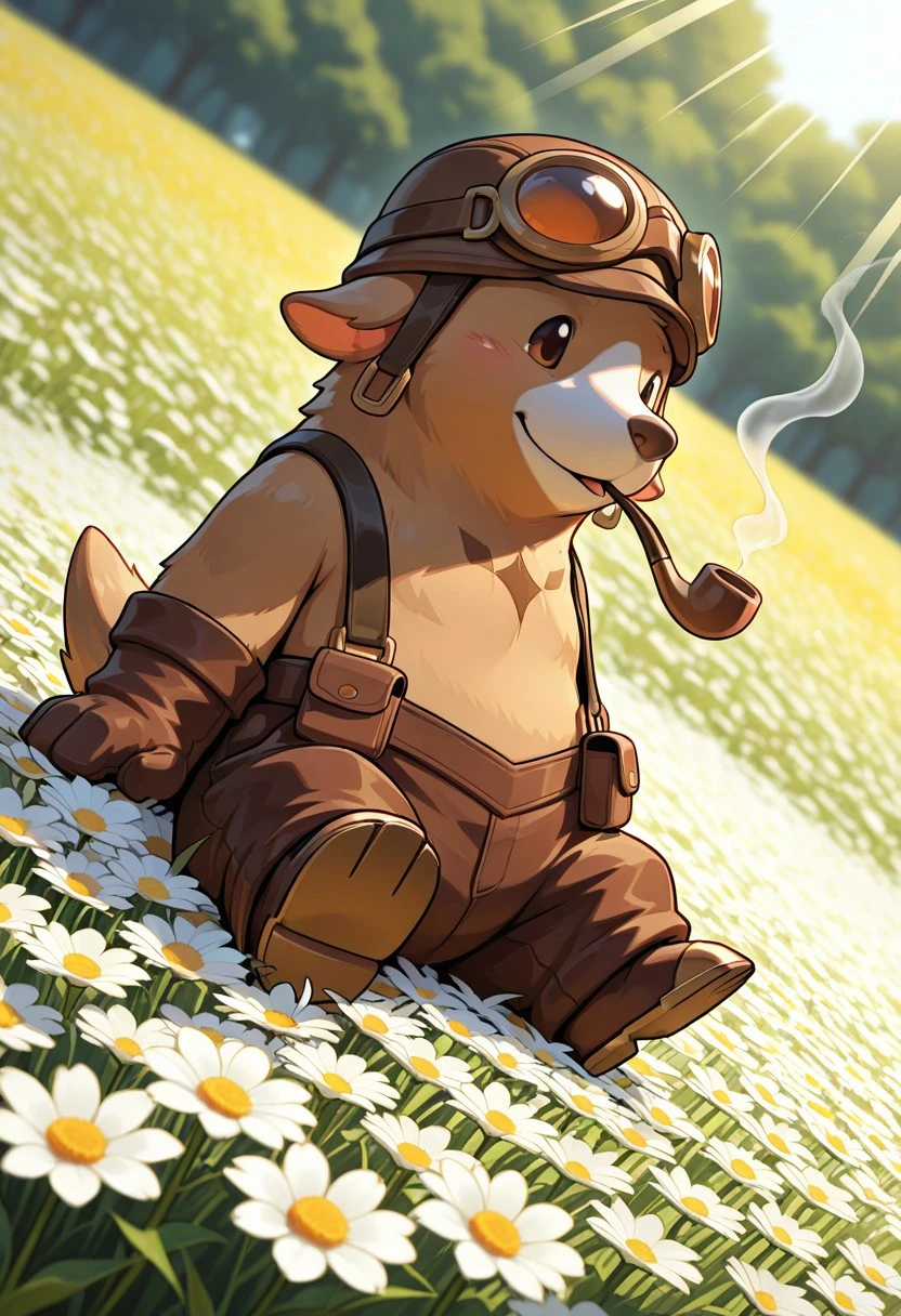 brown gloves, dark brown overalls, smoking pipe, goggles on head,
