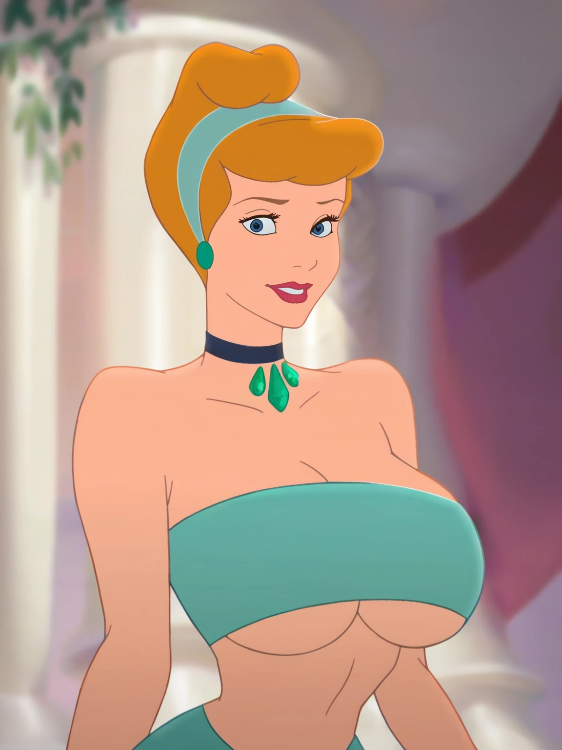 si_la, 1girl, fair skin, pink lips, blue eyes, golden blonde hair, bangs, French twist hair with band over, sleeveless dress with low-cut neckline, armpit length opera gloves, diamond earrings, choker around neck