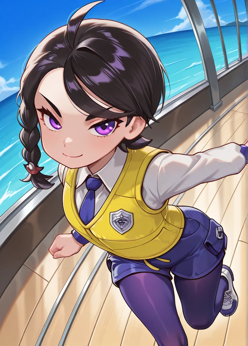 scarletxd, single braid, purple eyes, brown hair, ahoge, short hair,