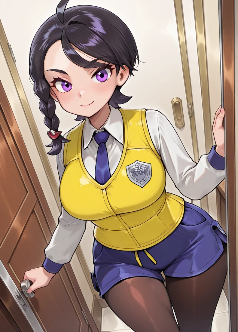 White shirt, shorts, necktie, pantyhose, vest, long sleeves, legwear under shorts,