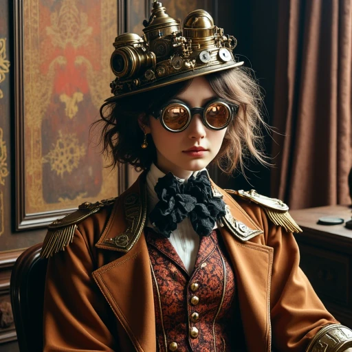 [subject] in [setting], wearing [period clothing] with [steampunk accessories], [atmosphere], [specific materials like brass/leather], steampunk style
