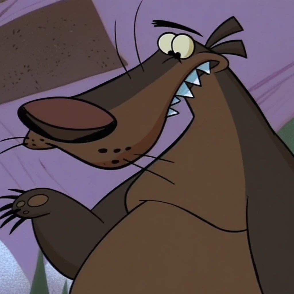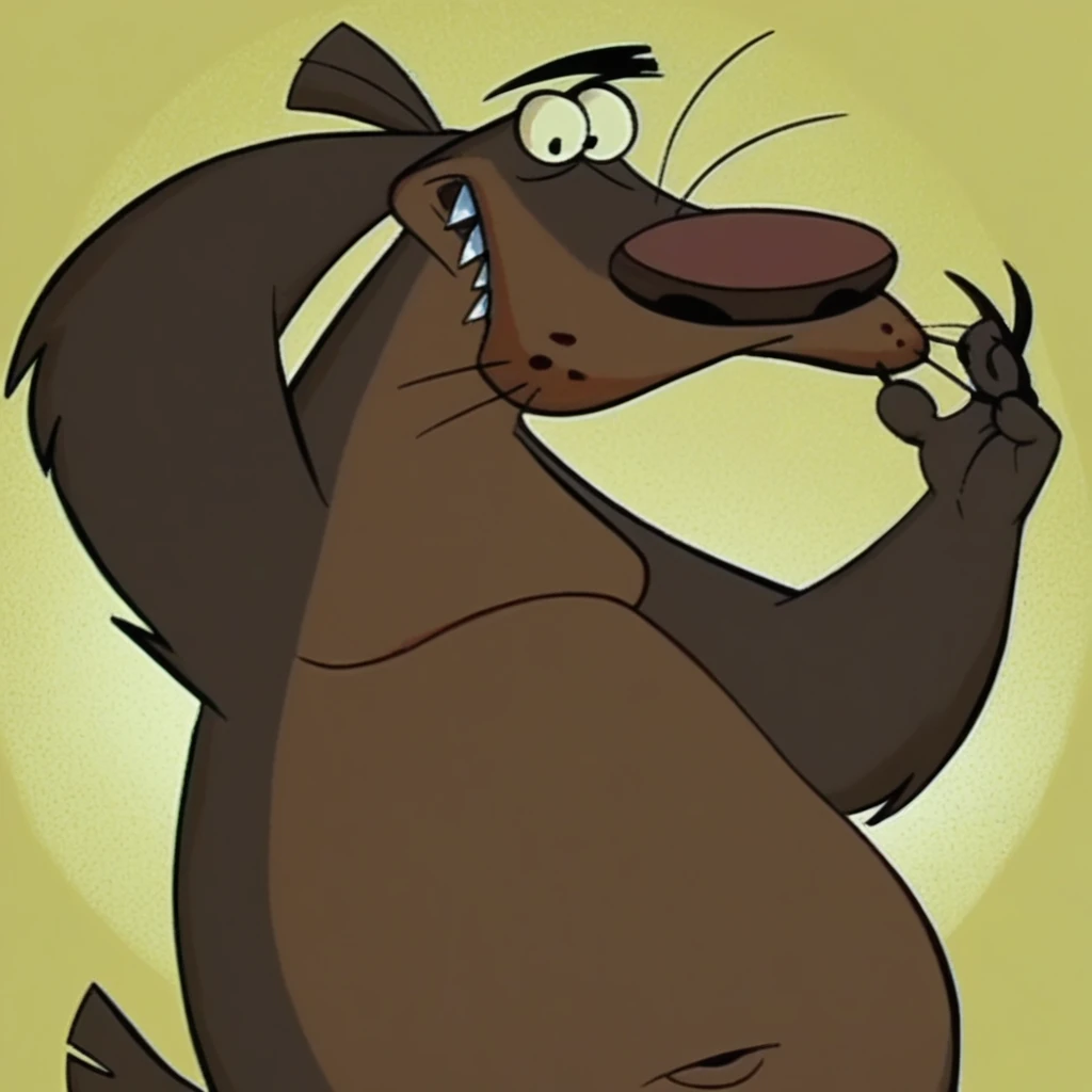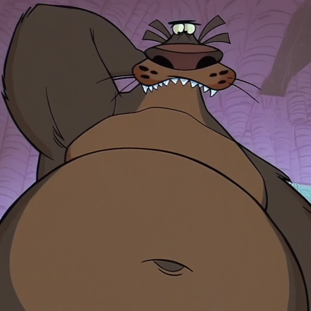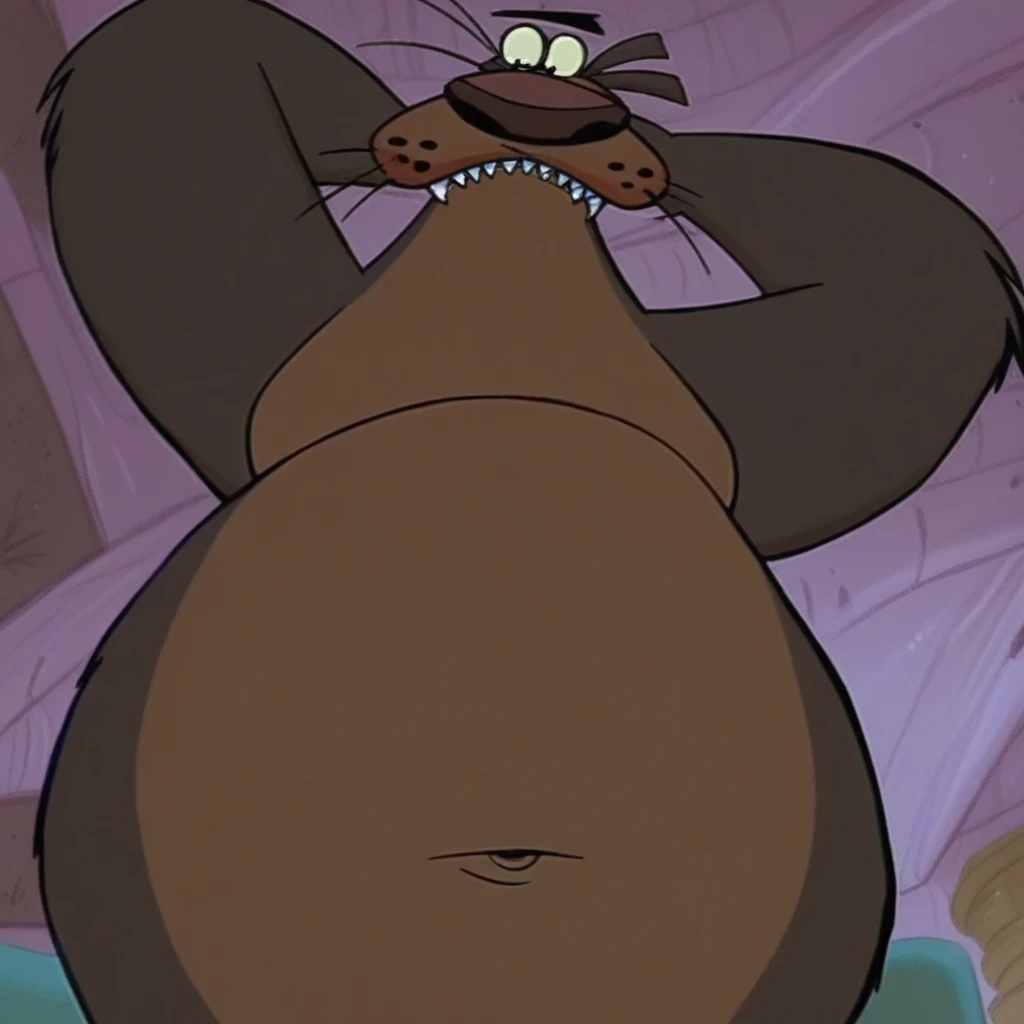Tags: Barry Bear, brown fur, light brown belly fur, large arms, short legs, small paws, claws, sharp teeth, long snout, brown nose, large muzzle, whiskers, freckles, small eyes, unibrow, moobs, big belly, navel, belly button, small tail, solo