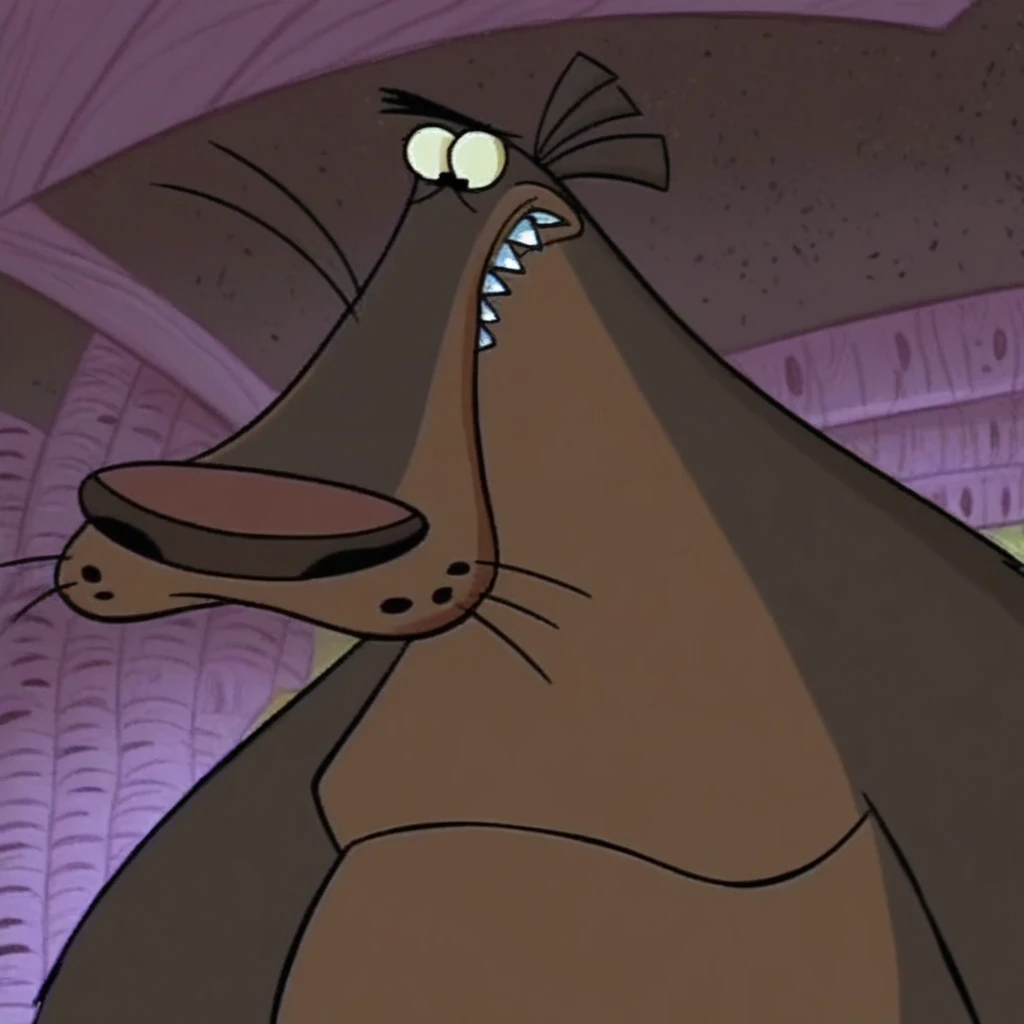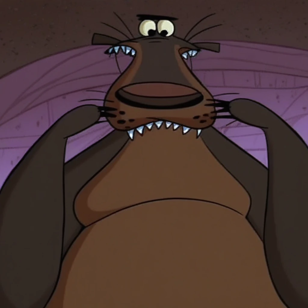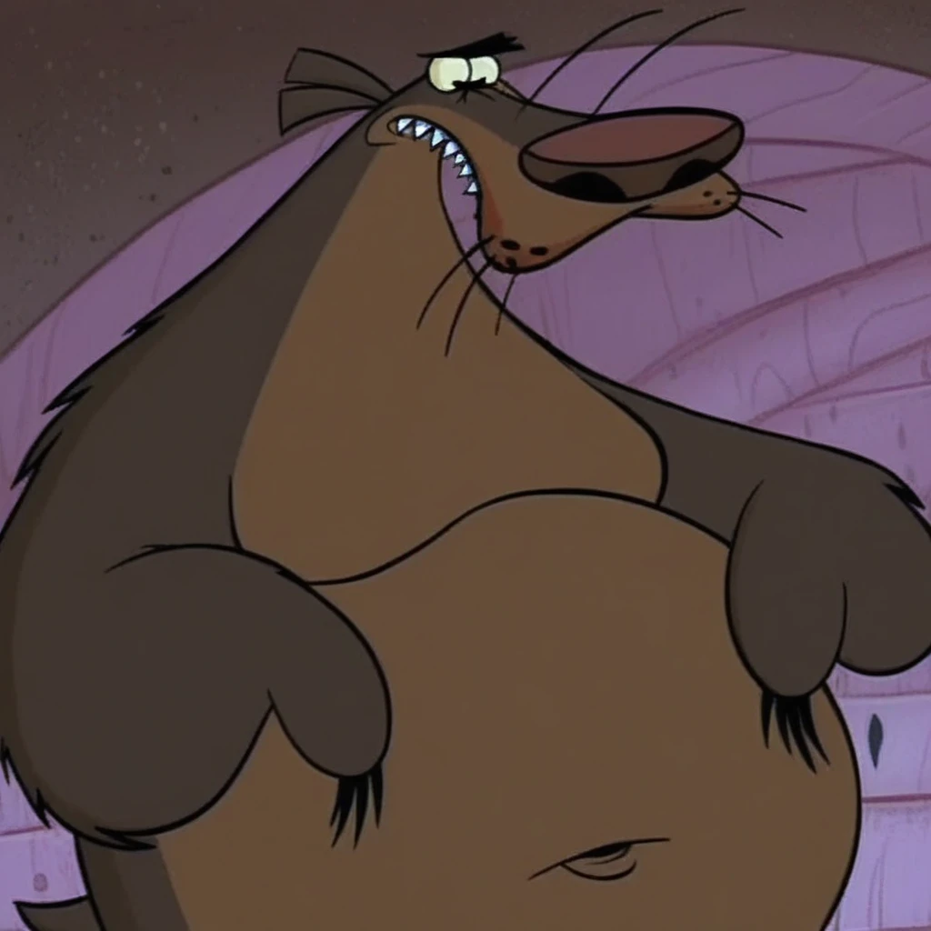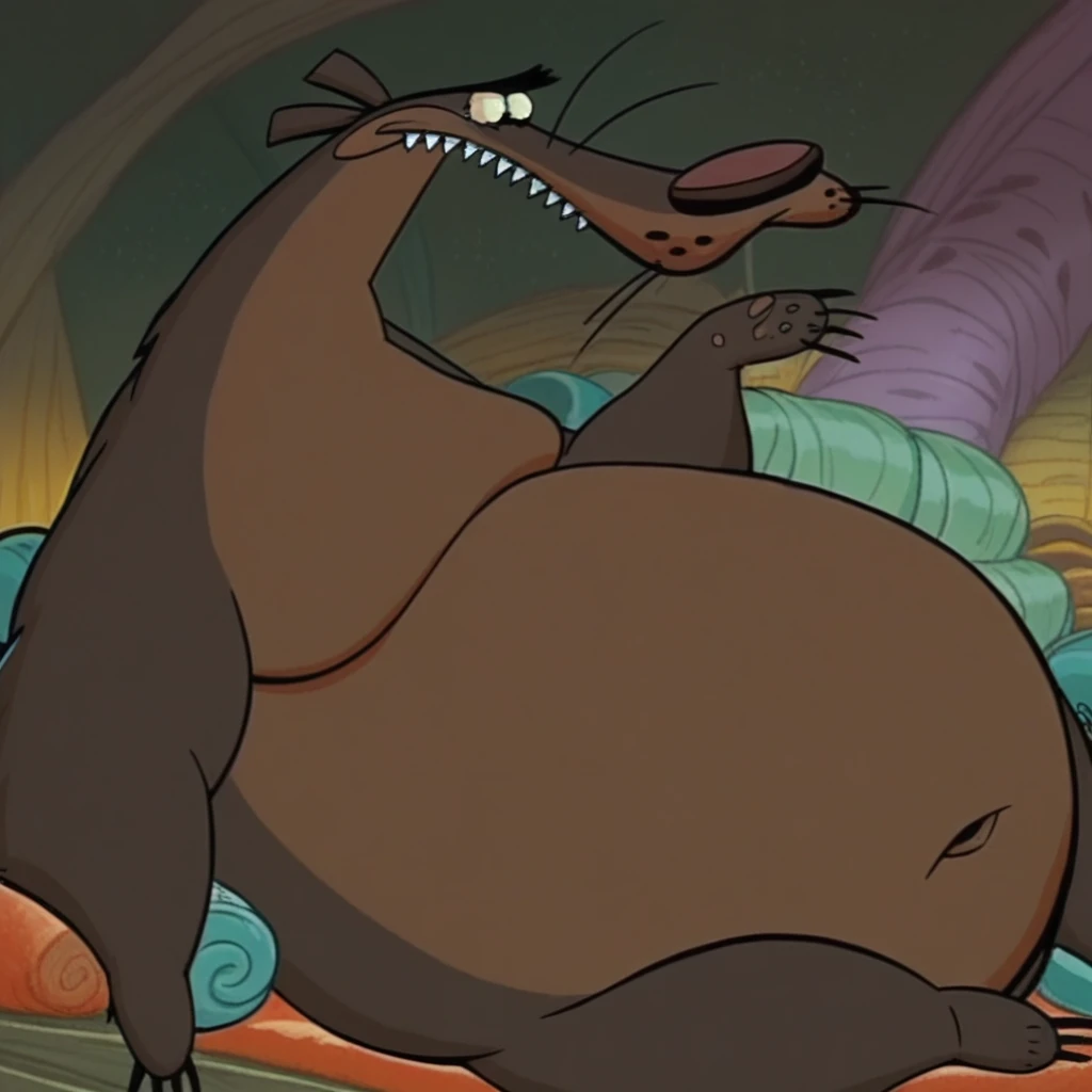 Tags: Barry Bear, brown fur, light brown belly fur, large arms, short legs, small paws, claws, sharp teeth, long snout, brown nose, large muzzle, whiskers, freckles, small eyes, unibrow, moobs, big belly, navel, belly button, small tail, solo