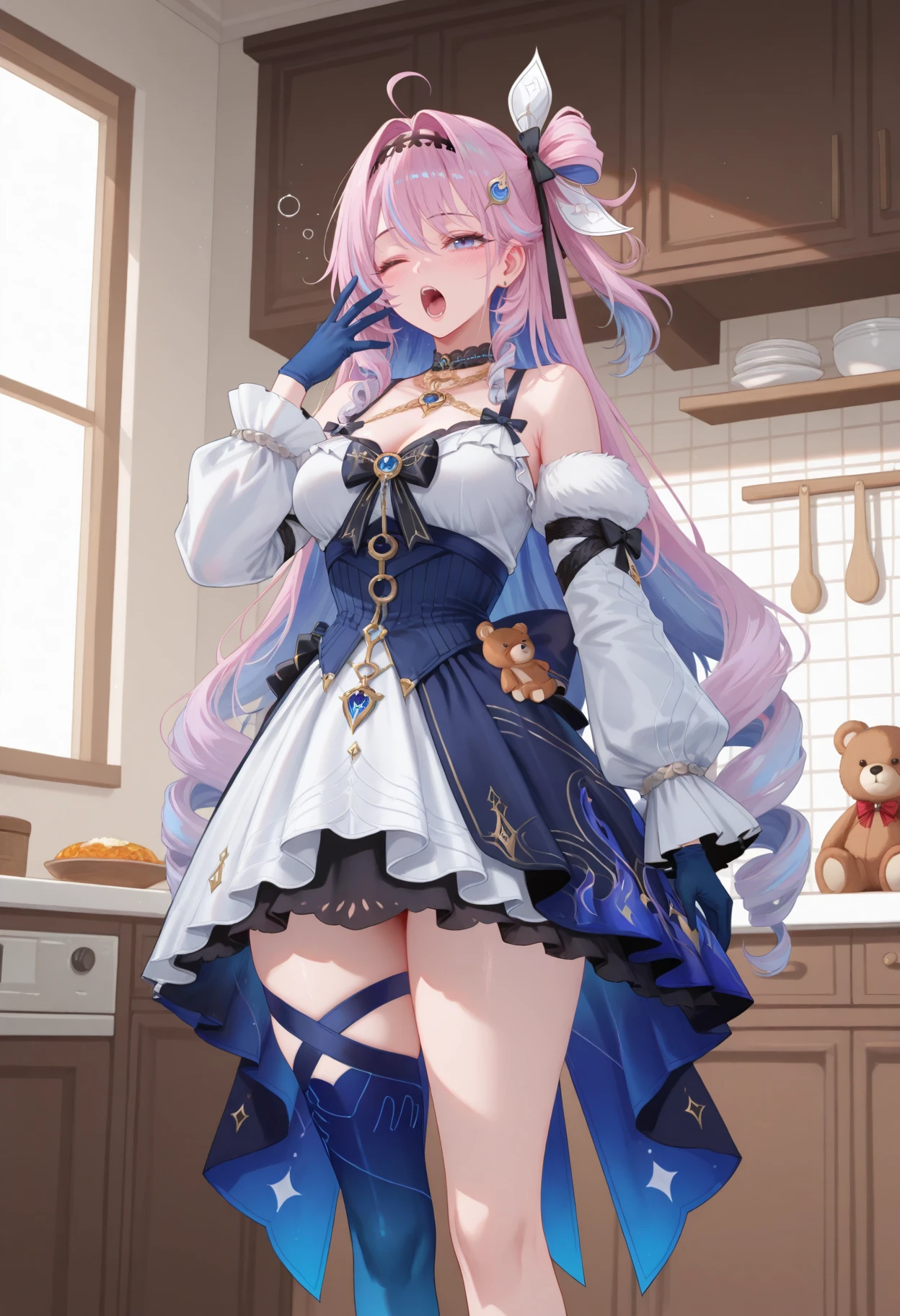 <lora:达妮娅:1>,DANIYA2,1girl,long hair,very long hair,breasts,bangs,blue eyes,purple eyes,(pink hair:1.3),blue hair,purple hair,multicolored hair,gradient hair,streaked hair,colored inner hair,hair ornament,hair ribbon,hairband,black hairband,ahoge,bow,ribbon,dress,white dress,pink dress,long sleeves,detached sleeves,puffy sleeves,gloves,black gloves,blue gloves,red gloves,thighhighs,blue thighhighs,shoes,black footwear,high heels,bare shoulders,jewelry,drill hair,hair intakes,one side up,bare legs,pink and blue idol dress,light blue corset top,detached pink fur-trimmed cape,long flowing pink scarf with tassels,layered high-low skirt,dark blue ruffled underskirt,black and red mismatched gloves,teddy bear charm pendant,black platform bow heels,gold chain belt with gem bow,kneehighs,asymmetrical legwear,