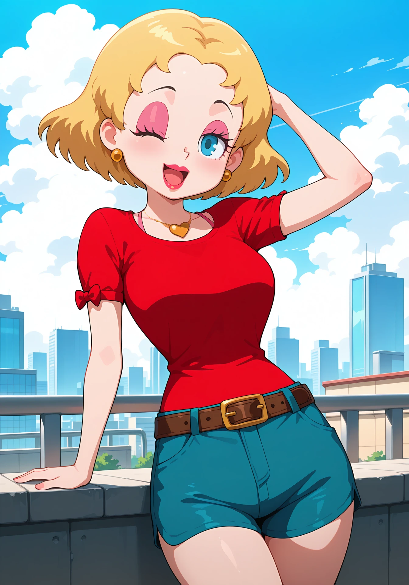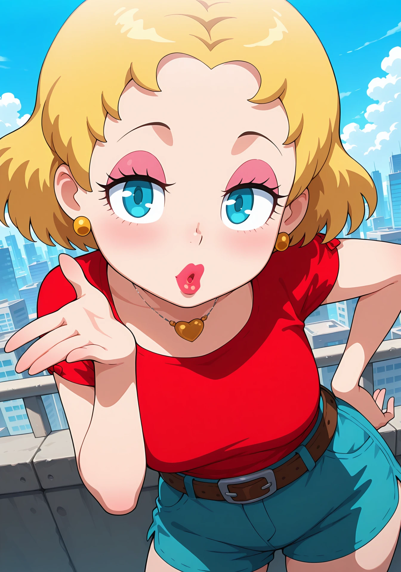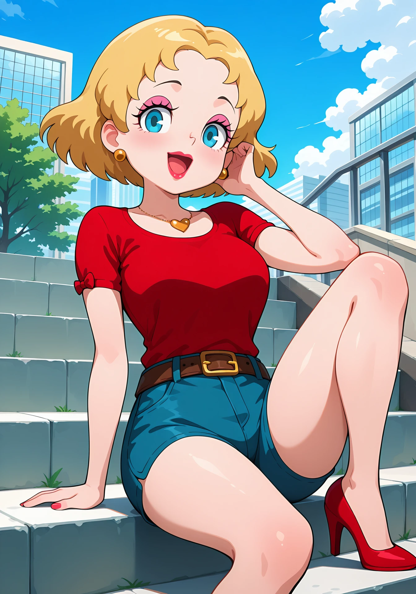 heart necklace, red shirt, short sleeves, blue shorts, belt, red heels