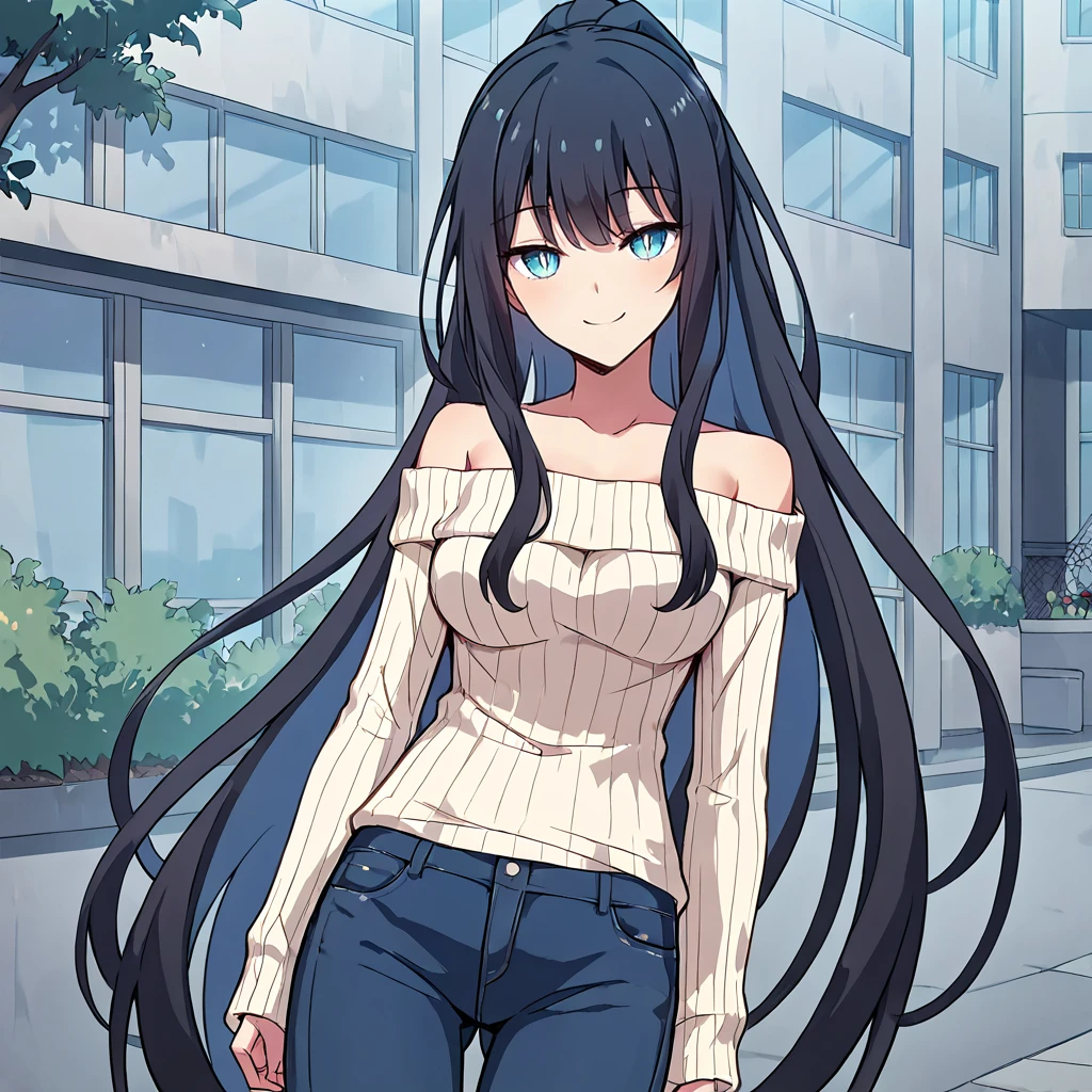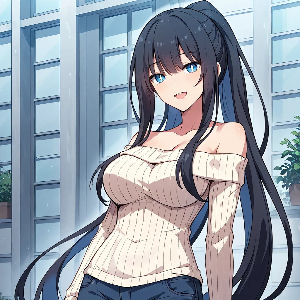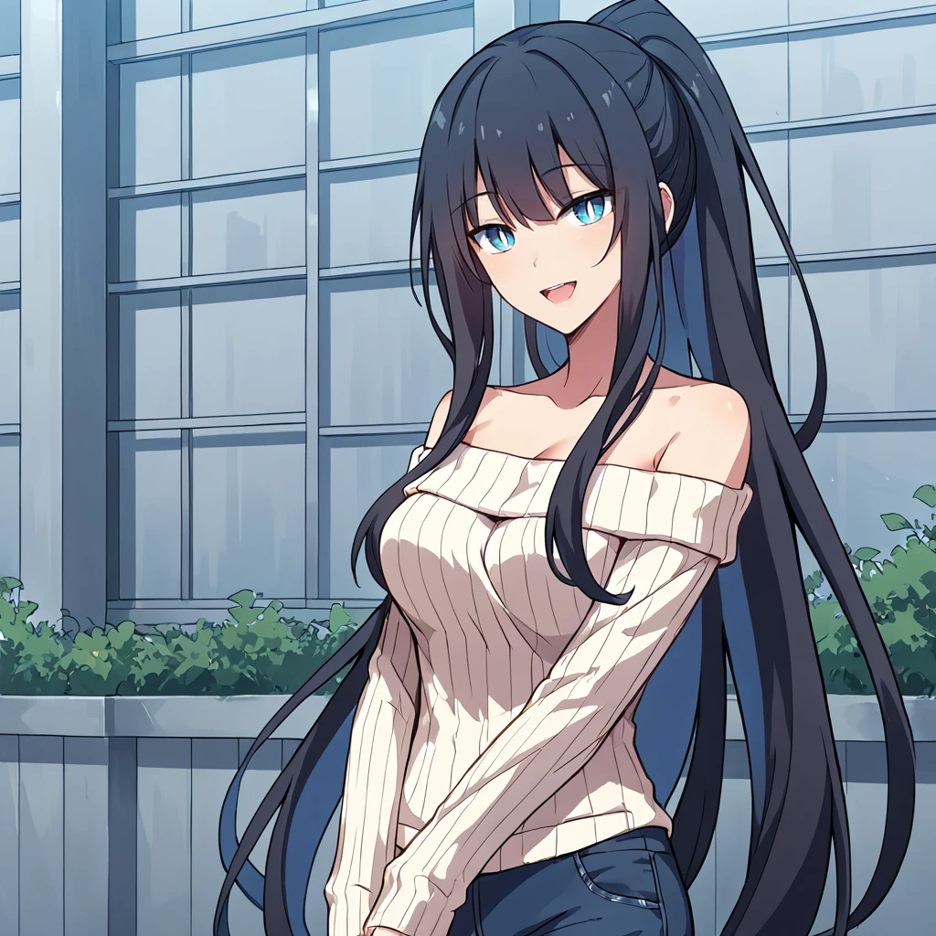 collarbone, ponytail, ribbed sweater, white sweater, off shoulder, sidelocks, off-shoulder sweater, jeans, denim, long sleeves, bare shoulders,
