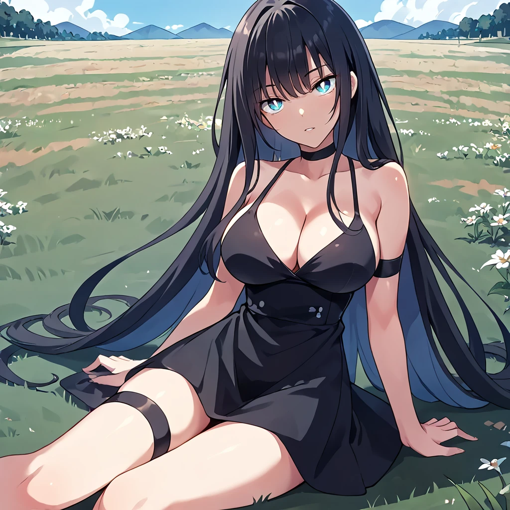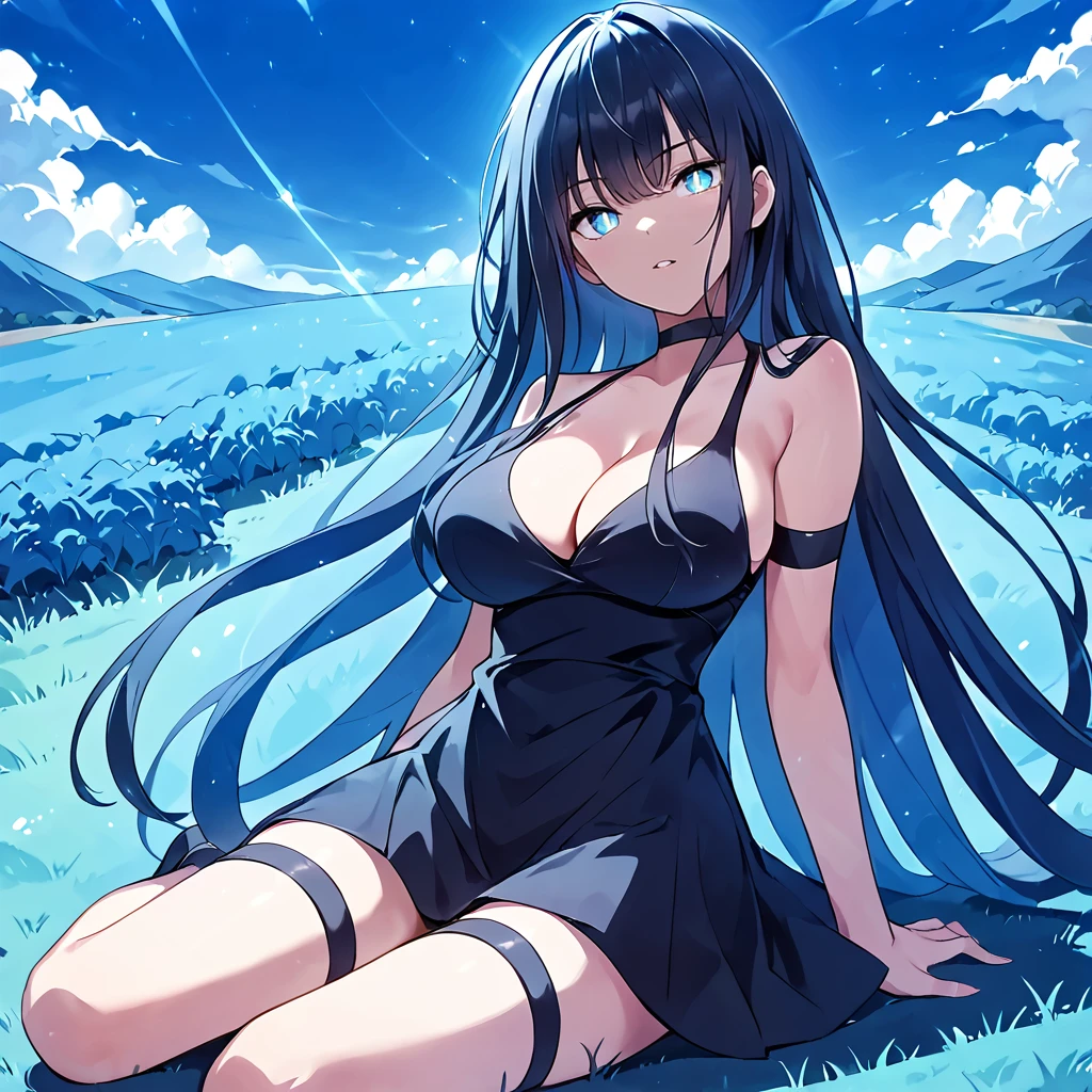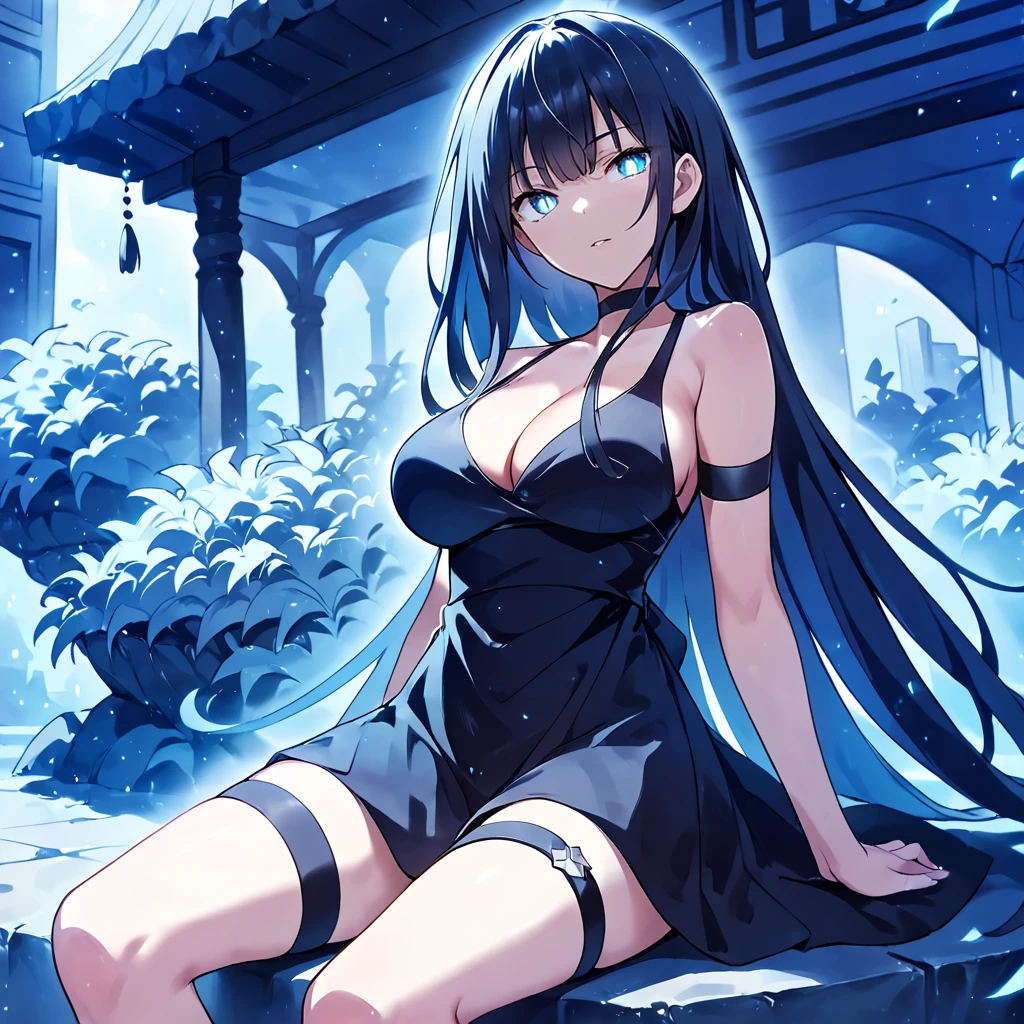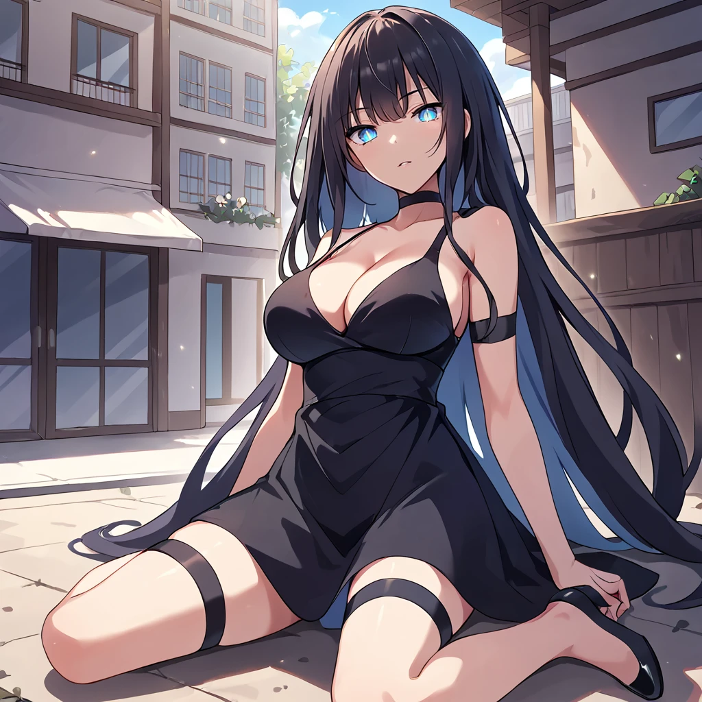 formal dress, dress, black dress, sleeveless, very long hair, cleavage, see-through, thighs, thigh strap, black footwear,Casual 1