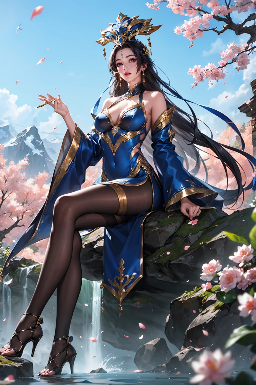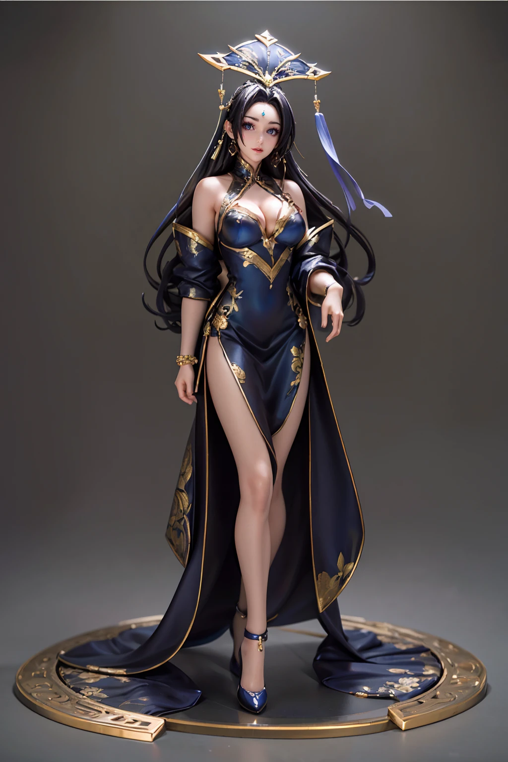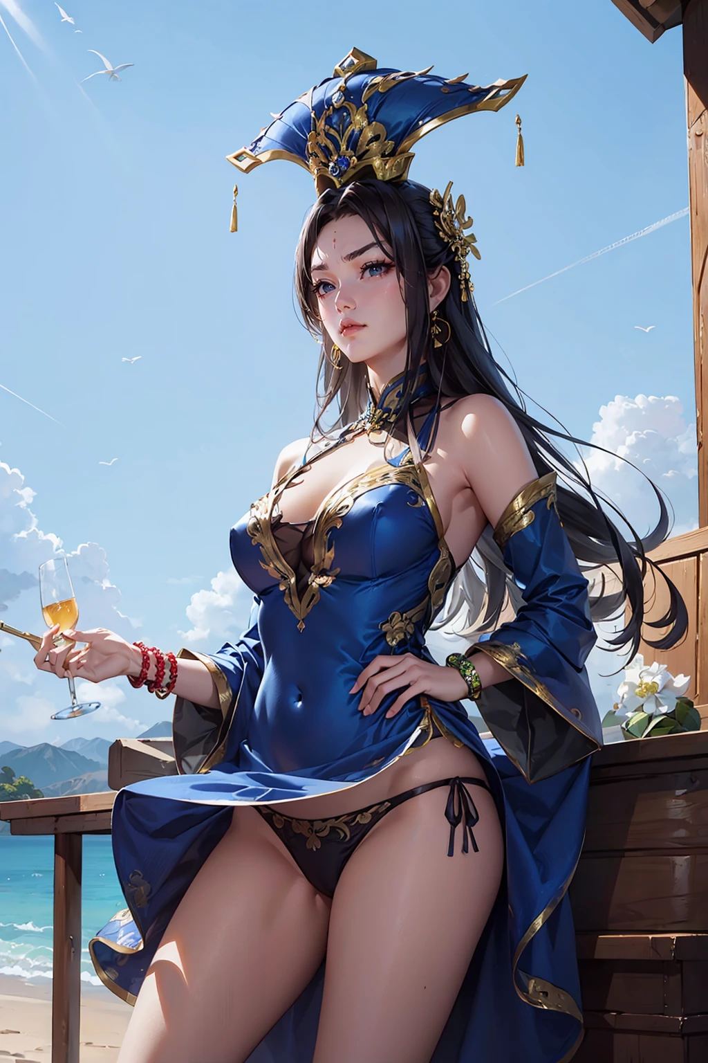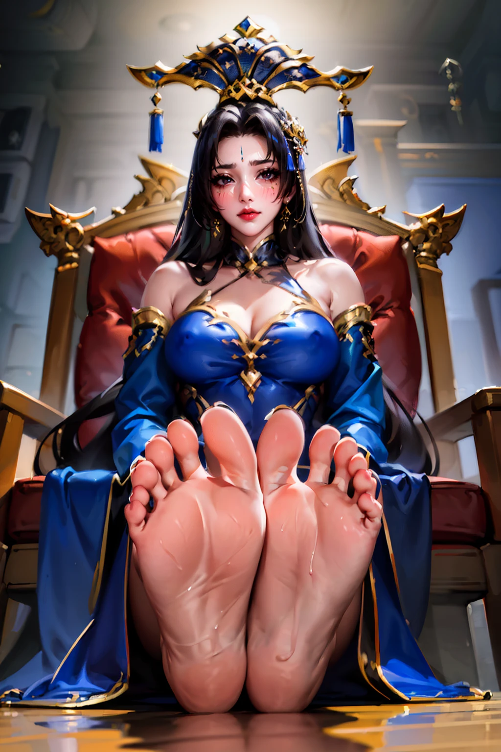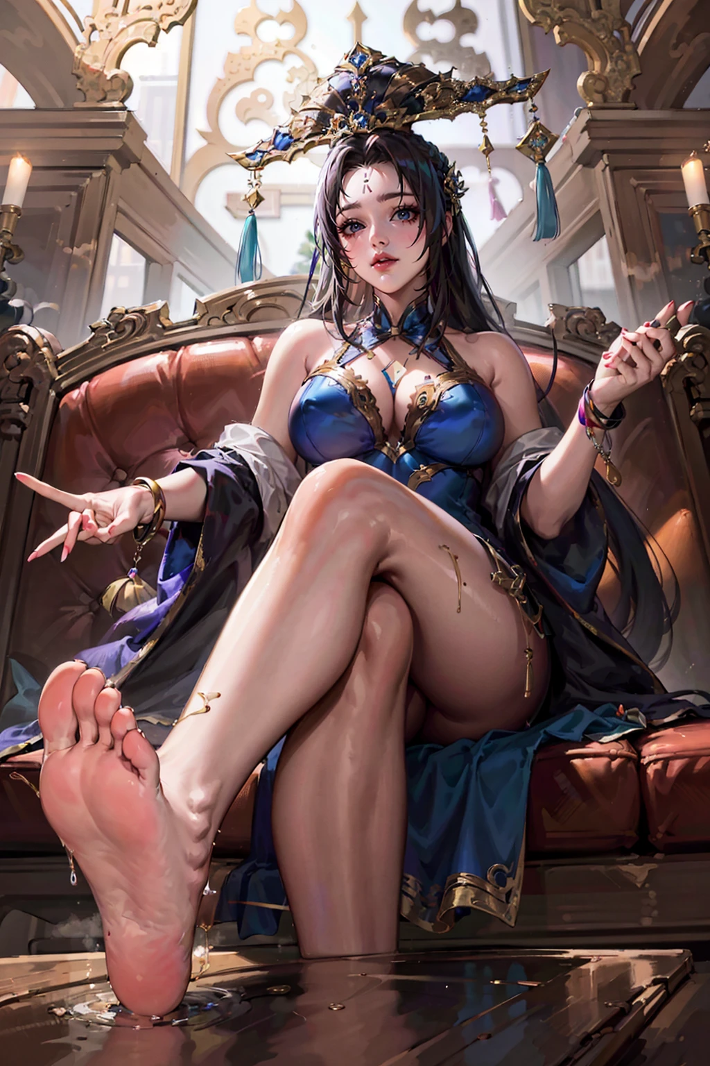 guozhao,dress,blue dress,jewelry,forehead mark,black hair,hair ornament,long hair,chinese clothes,bracelet,