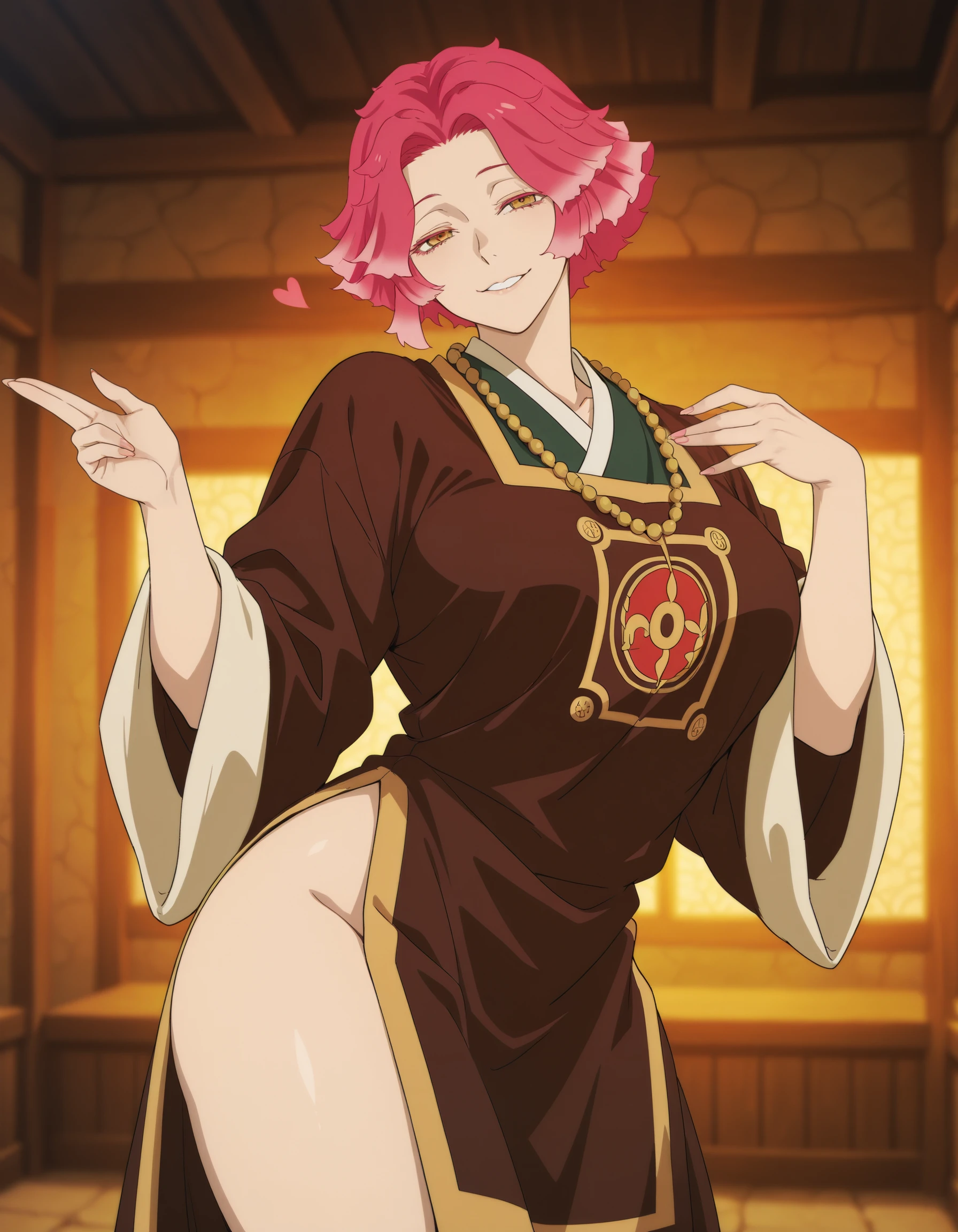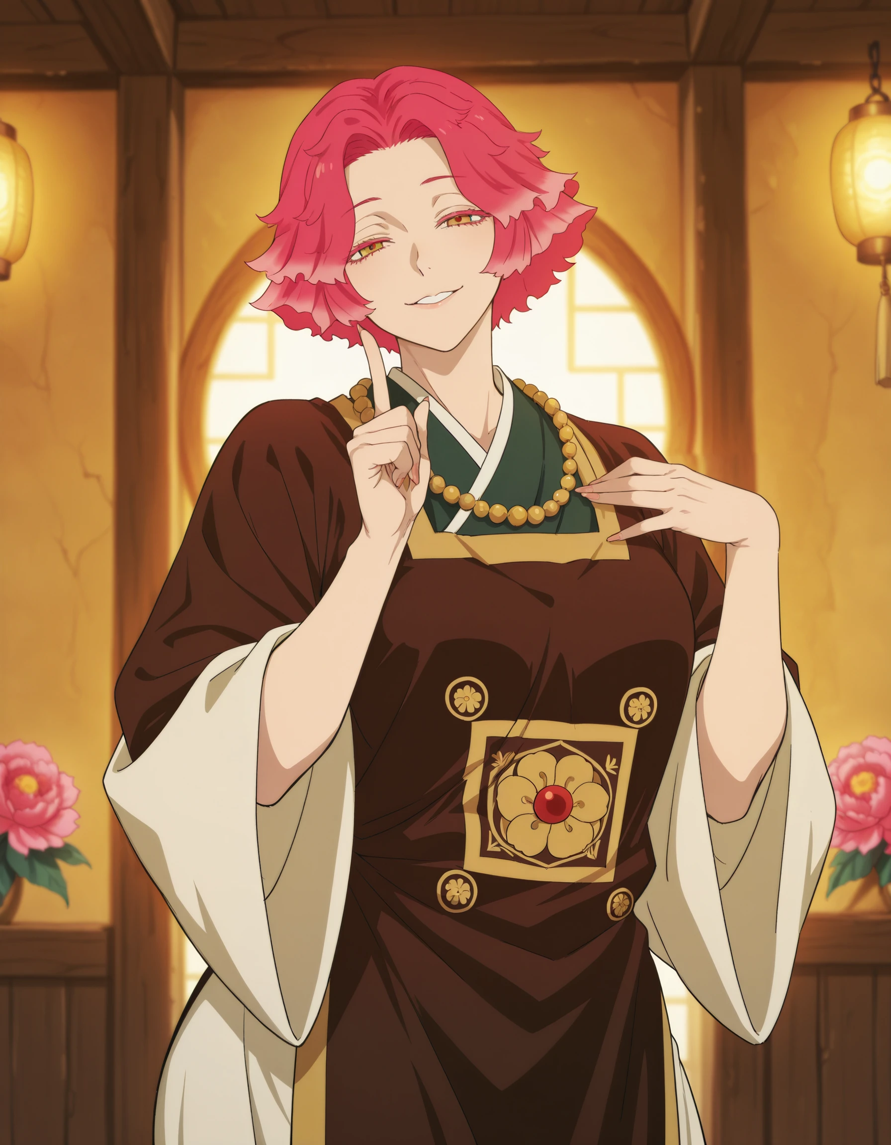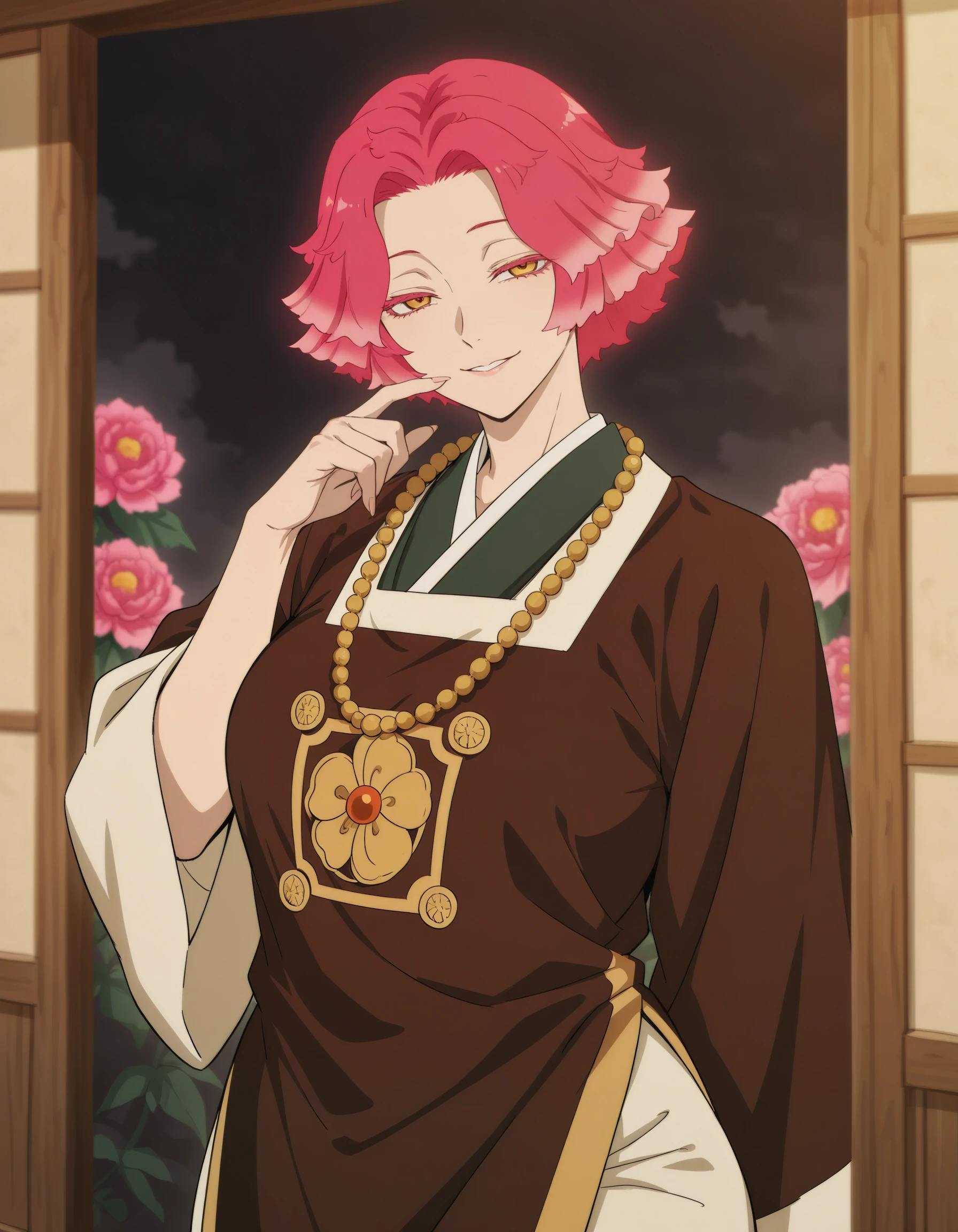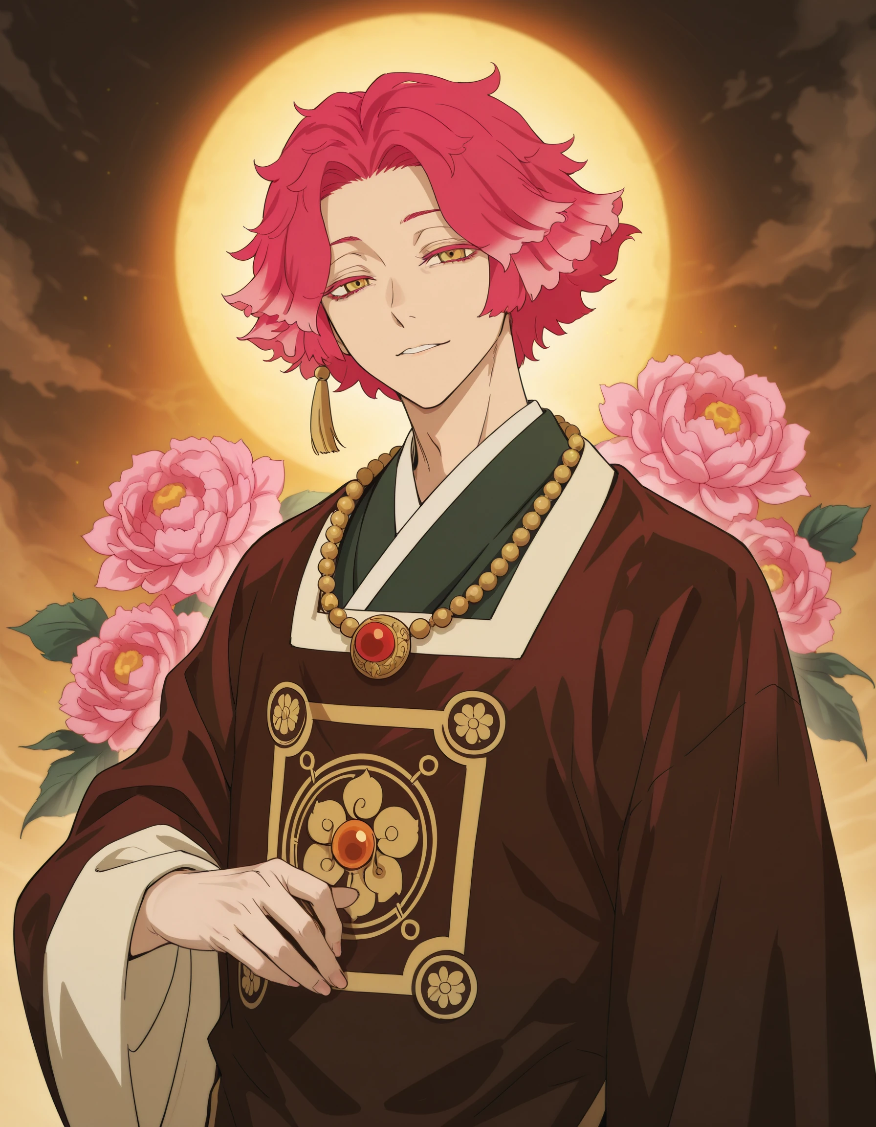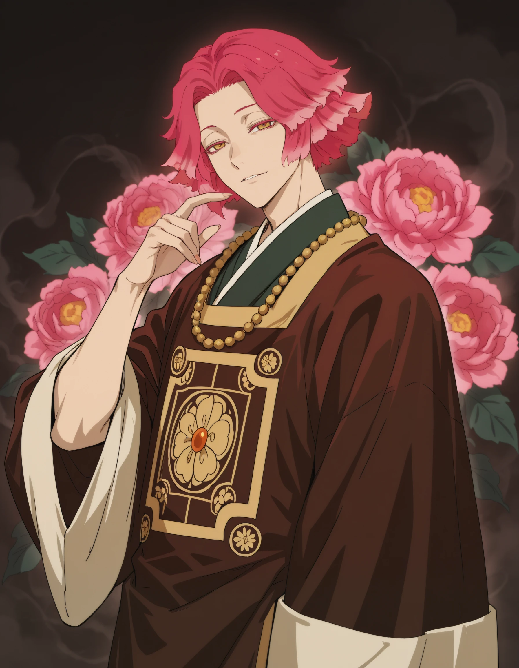 pink hair, mu dan \(jigokuraku\), peony \(flower\), orange eyes, yellow eyes, robe, kesa, beads, japanese clothes