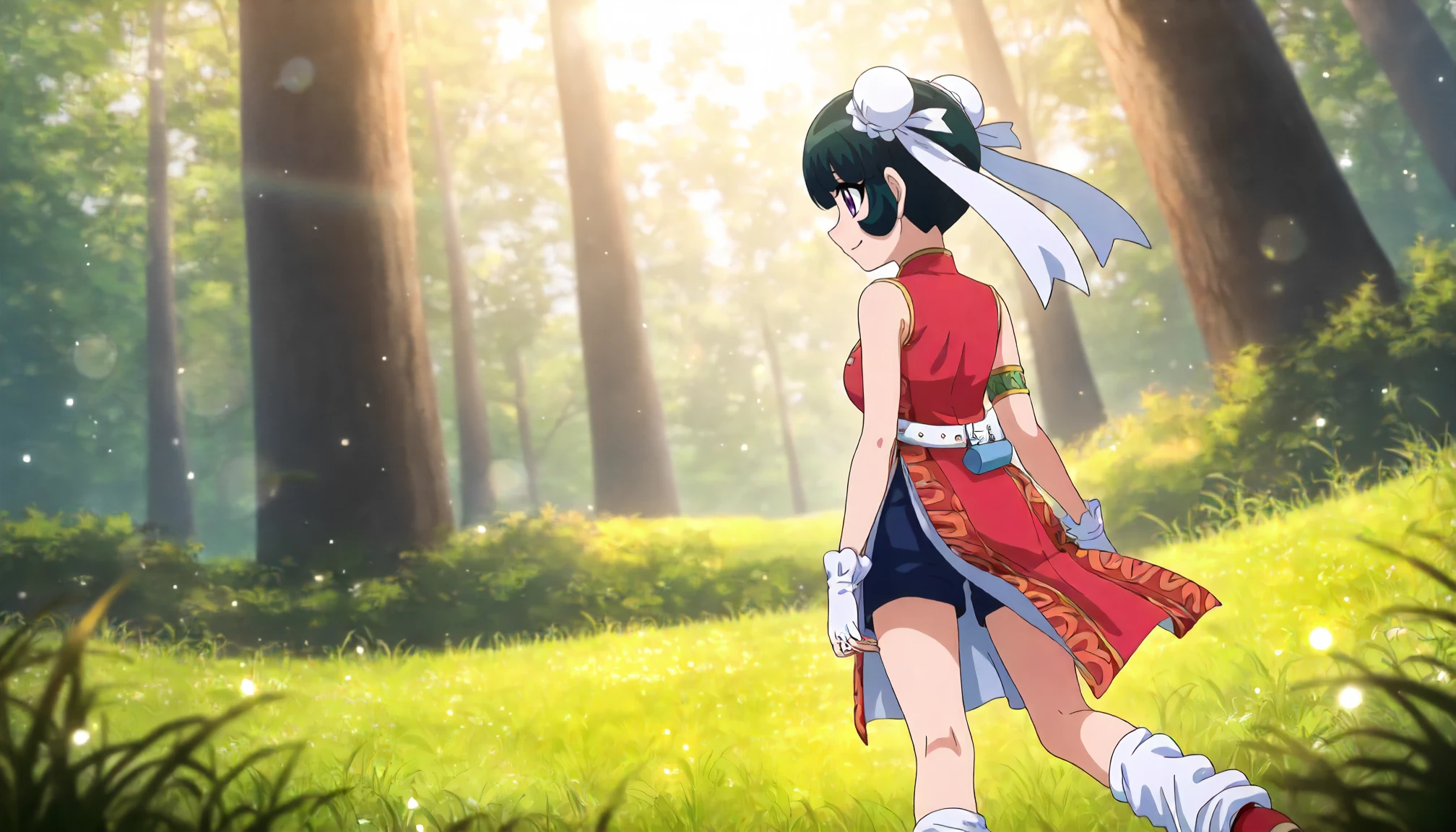 meimei,1girl,green hair,double bun,bun cover,hair ribbon,purple eyes,