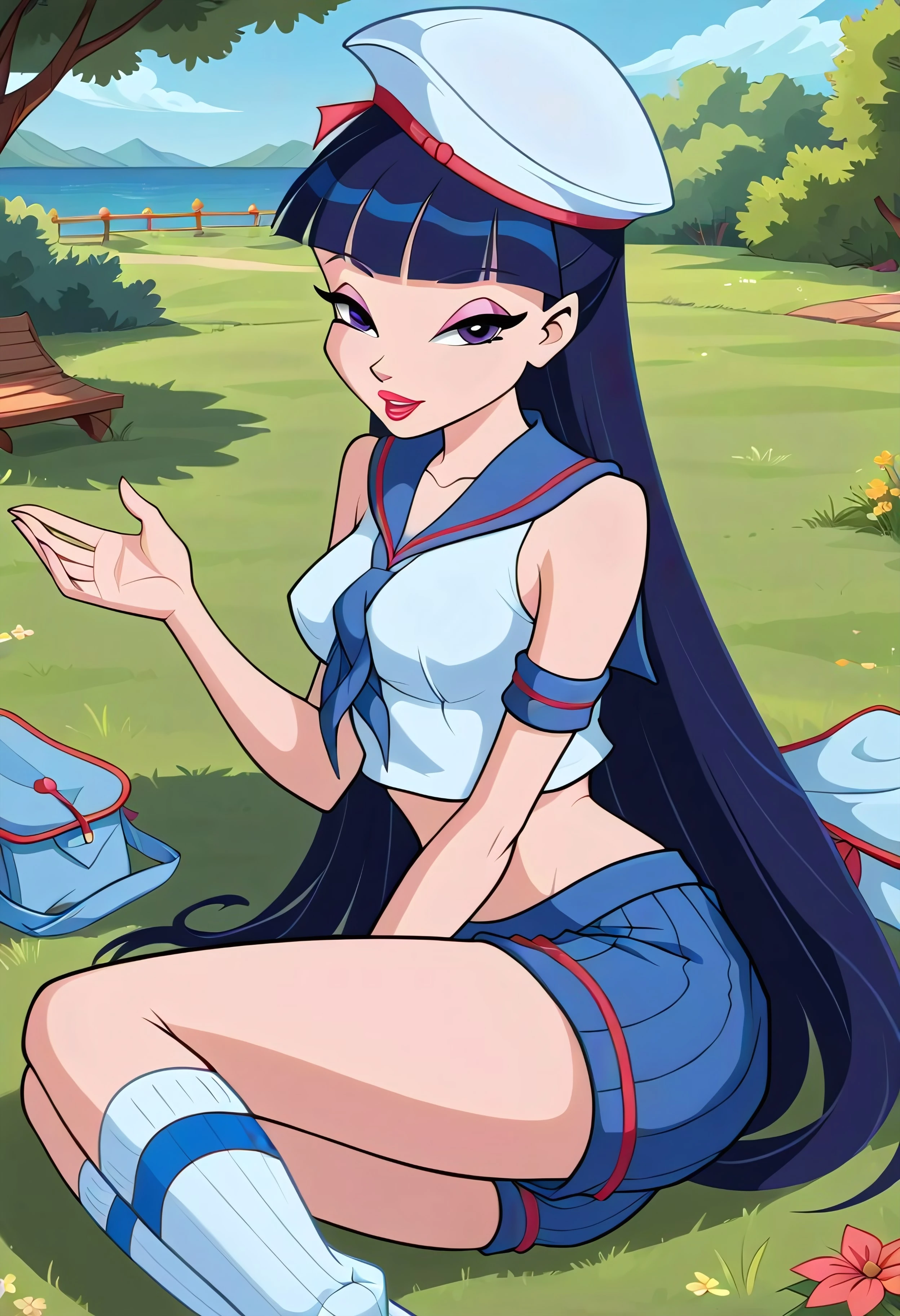 Mus4W1nx5, purple eyes, blue hair, long hair, very long hair, makeup, lipstick, red lips