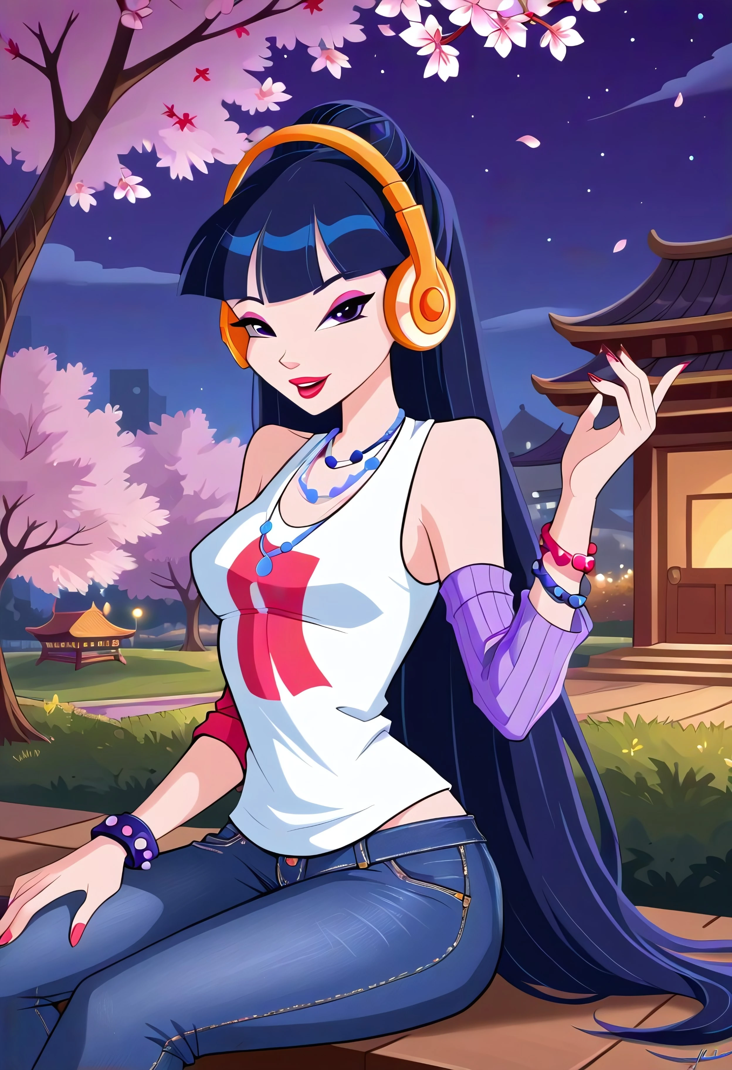 jewelry, jeans, pants, bracelet, headphones, denim, detached sleeves, necklace, nail polish, makeup