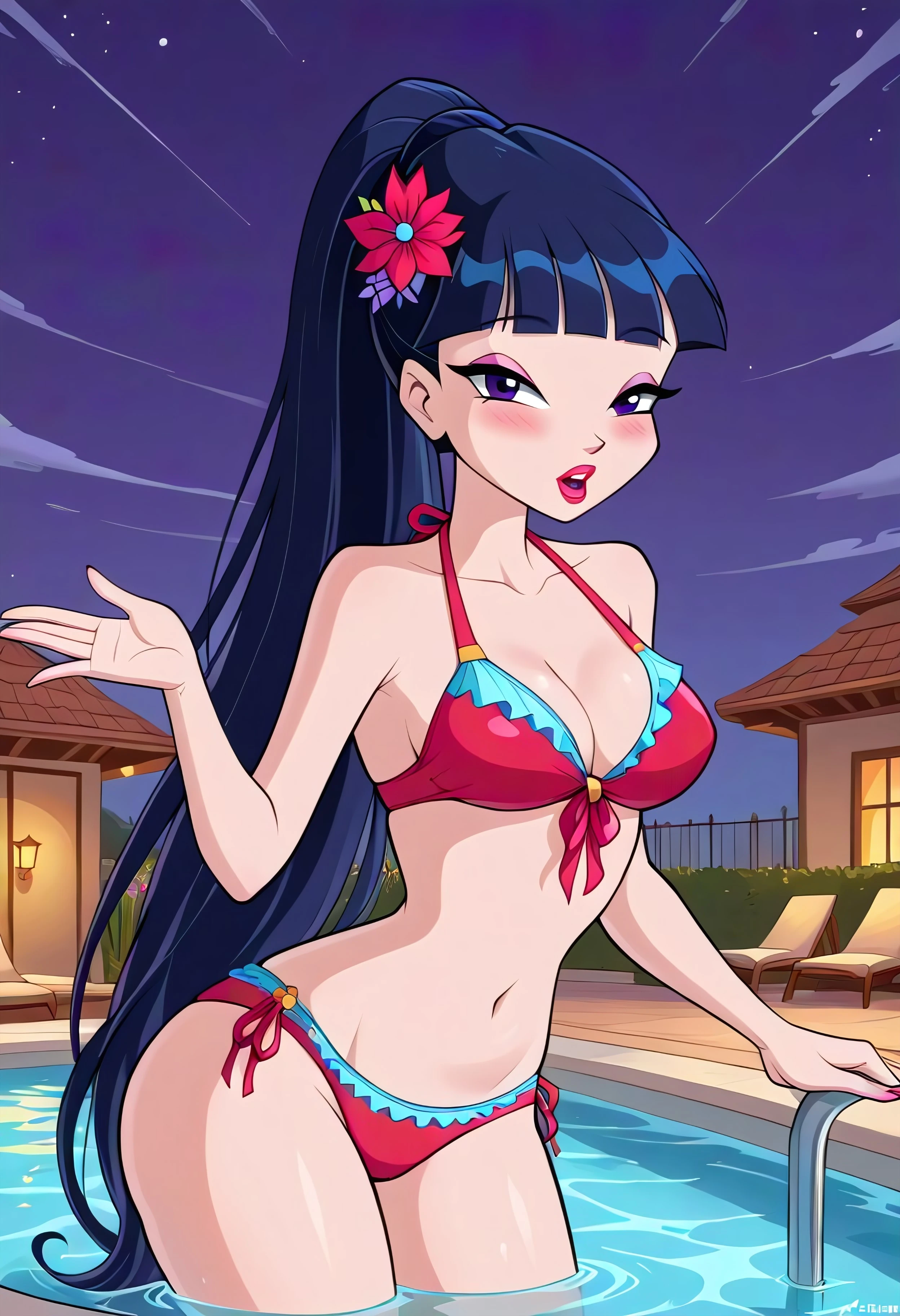 swimsuit, flower, , hair ornament, hair flower, ponytail, makeup, lipstick