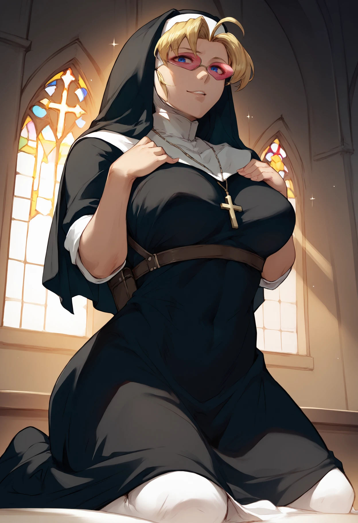 Nun outfit: "edasnu, pink-tinted eyewear, traditional nun, veil, black habit, black dress, cross necklace, white cowl, chest harness, shoulder holster, black sleeves, sleeves rolled up"