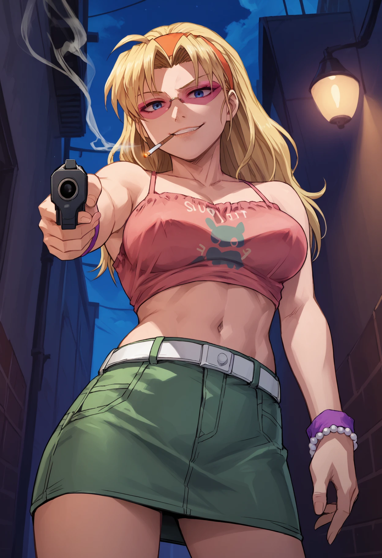Casual Outfit: "edacas, pink-tinted eyewear, orange hairband, pink camisole, print shirt, crop top, midriff, navel, white belt, denim skirt, green skirt, bead bracelet, purple wristband"